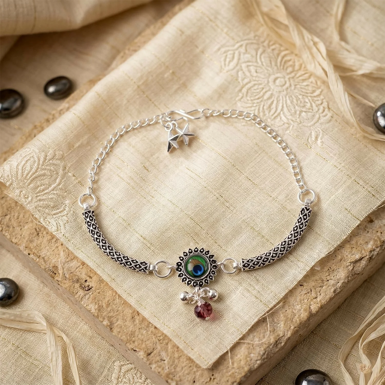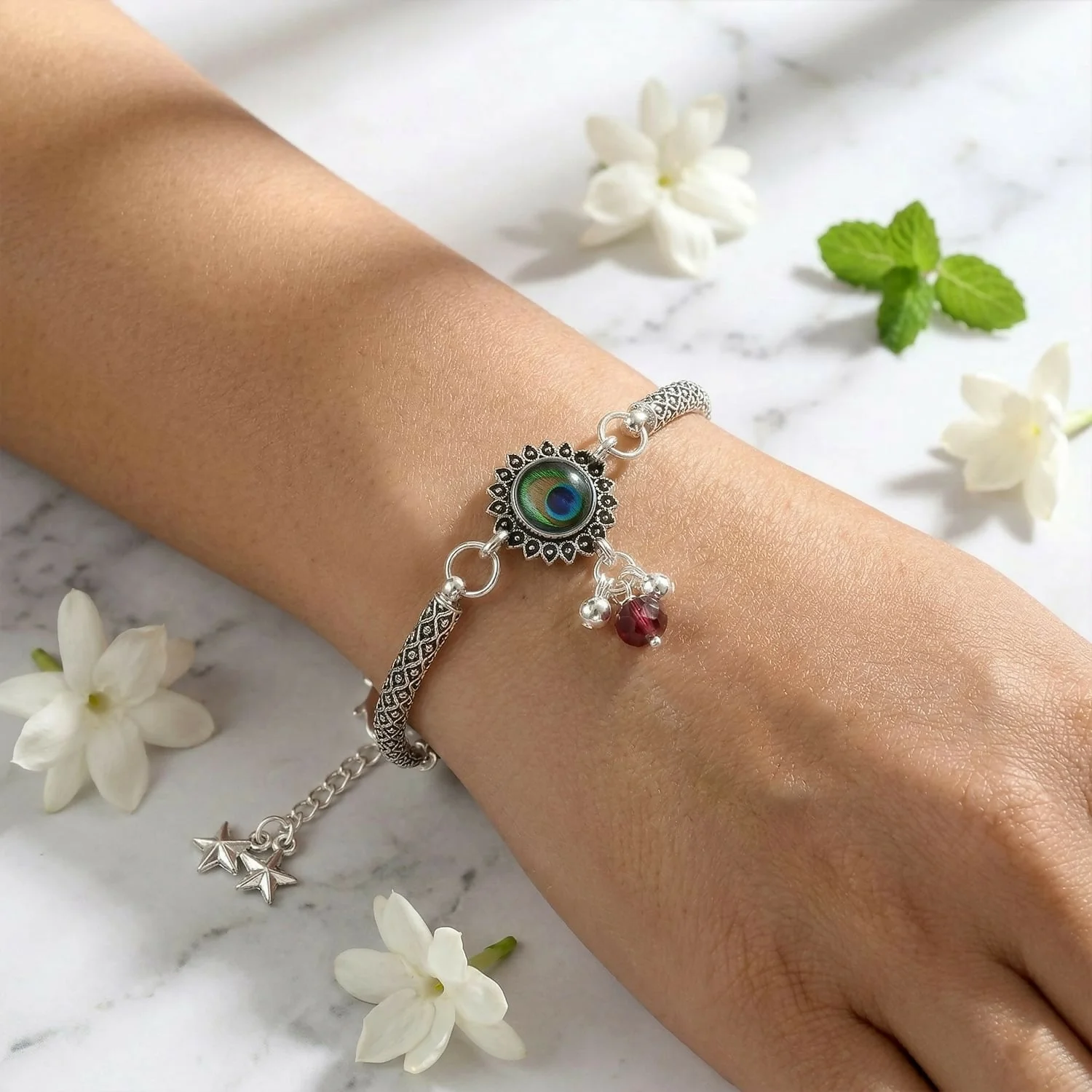 Elevate your everyday style with this beautifully crafted Peacock Stone Silver Charm Bracelet. Designed with an elegant vintage-inspired pattern, this bracelet features a stunning peacock stone centerpiece surrounded by intricate detailing, adding a unique and graceful touch.