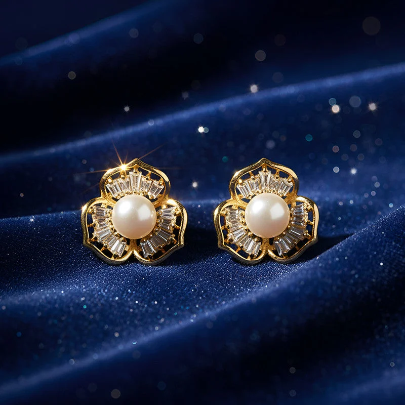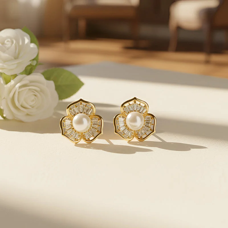 Be the first to review Pearl Center Floral Stud Earrings with Crystal Detailing and Gold Finish!