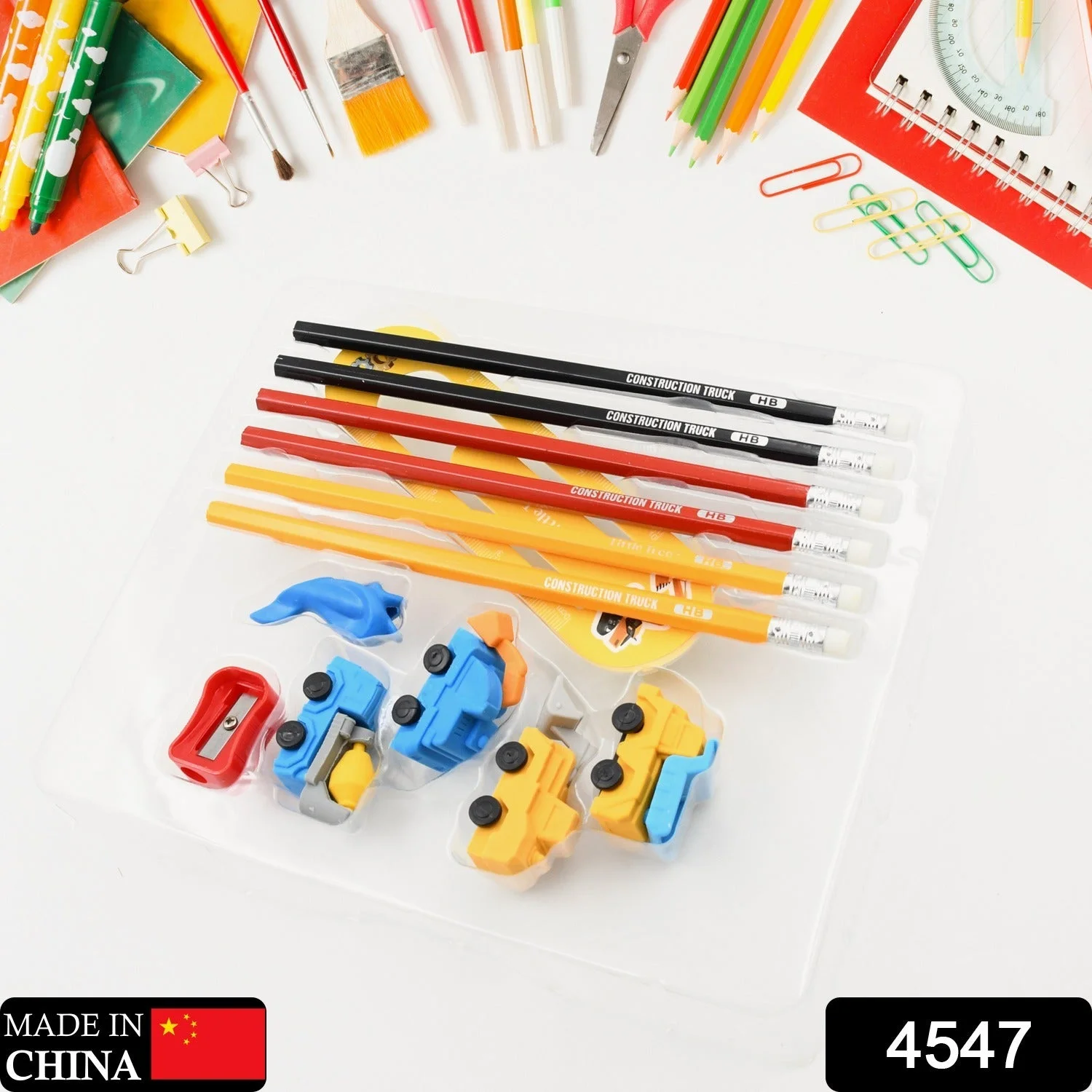 4547 Pencil and Eraser Set, Construction Truck Theme Stationery Kit Includes 6 Pencils, 4 Erasers, 1 Sharpener, 1 Ruler Bookmark, 1 Pencil Cap Stationary For Birthday Gifts for Kids, Birthday Return Gifts (13 Pc set)