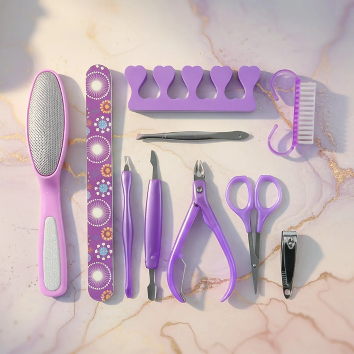 Set Includes: Nail filer, foot file, toe separator, cuticle tools, nail cutter, scissors, and grooming accessories