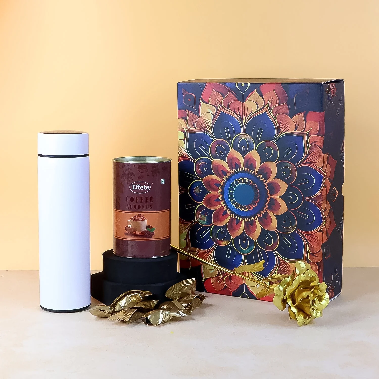 Celebrate every occasion with this Premium Gift Hamper Box, a perfect blend of elegance and taste. The beautifully designed festive box includes a stylish stainless steel bottle, a golden decorative rose, and a pack of Effete [Coffee] Almonds Chocolate for a delightful treat.