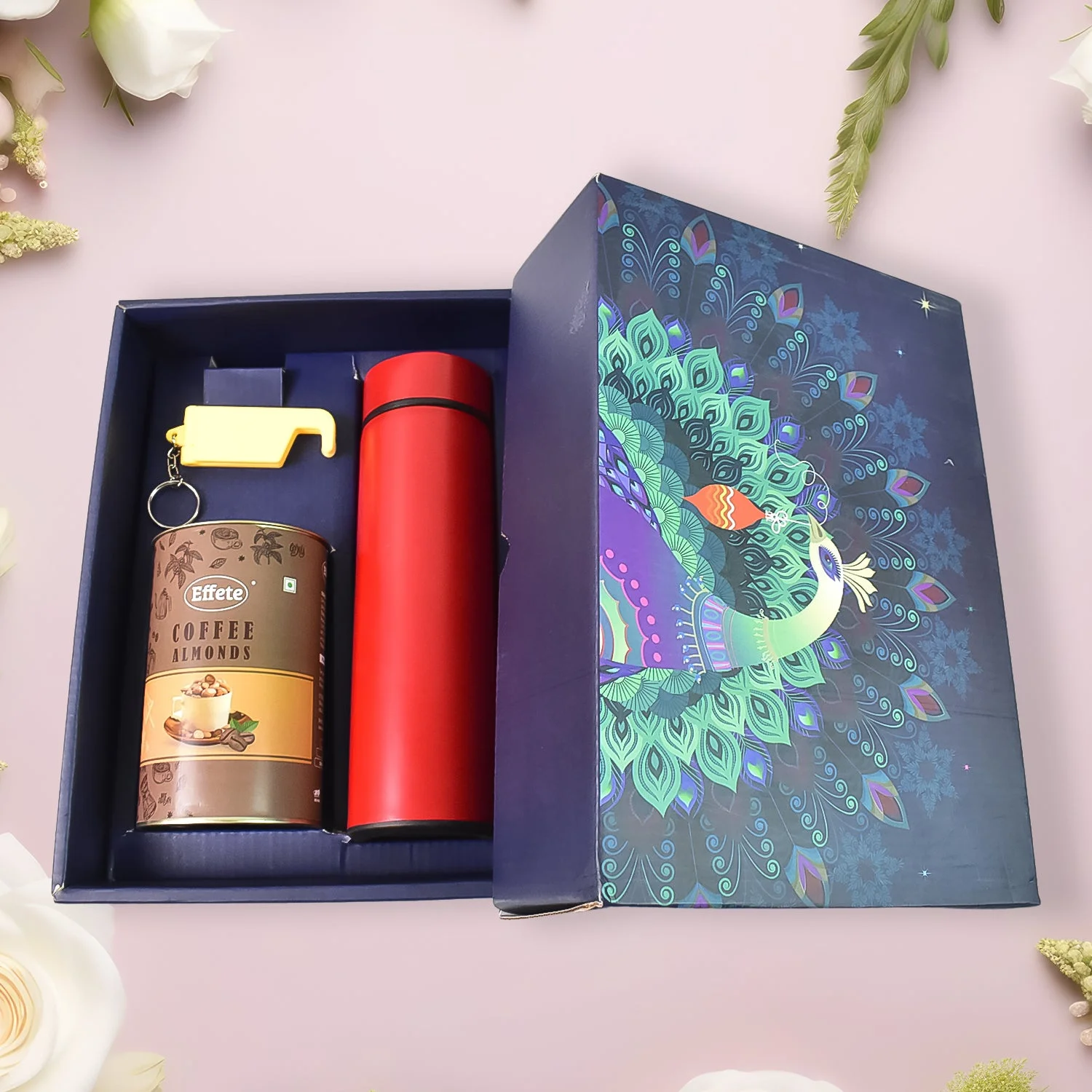 Personalized Temperature Water Bottle, 2in1 Keychain & Coffe Chocolate (With Attractive Peacock Box / 3 Pc Set / Mix Color Bottle)
