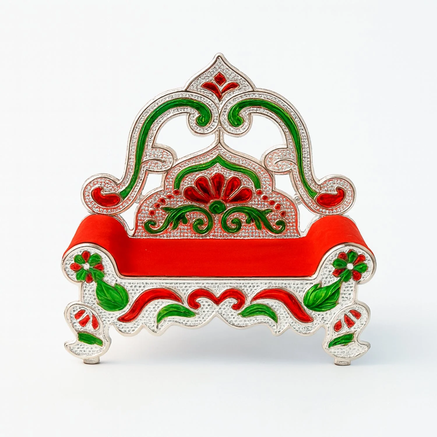 puja singhasan , god idol throne , decorative pooja chair , puja asan , mandir accessory , temple decor , Krishna Janmashtami setup , devotional decor , miniature singhasan, Meenakari singhasan , multicolor pooja singhasan