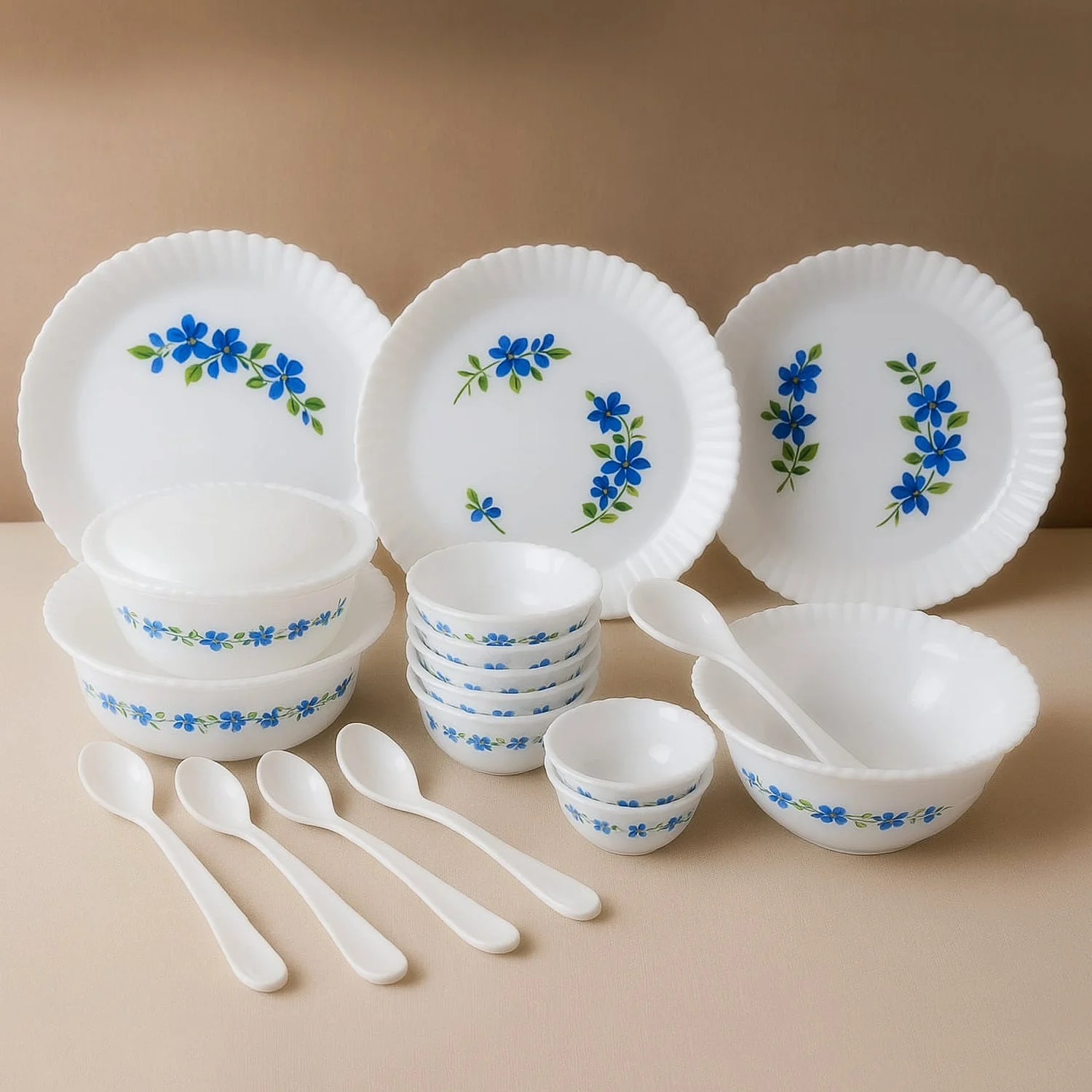 Plastic 36-Piece Premium Dinner Set – Elegant White Plates, Bowls, Serving Dishes & Spoons with Blue Flower Design for Home, Gifting & Daily Use