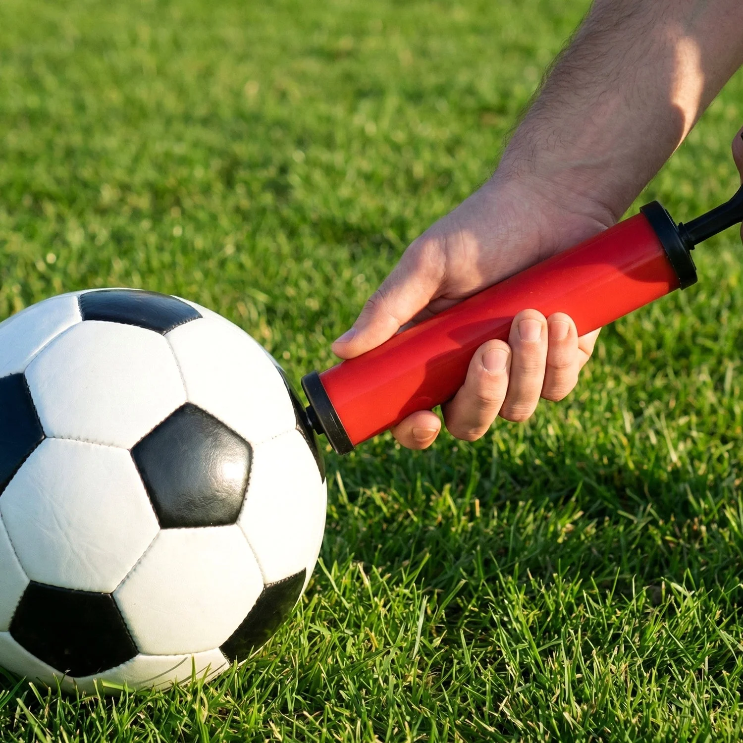 The football pump Built with an ergonomic design, it fits right in your hands. Double pump technology makes up stroking and down stroking easier than ever. The plastic material makes it sturdy and long-lasting.