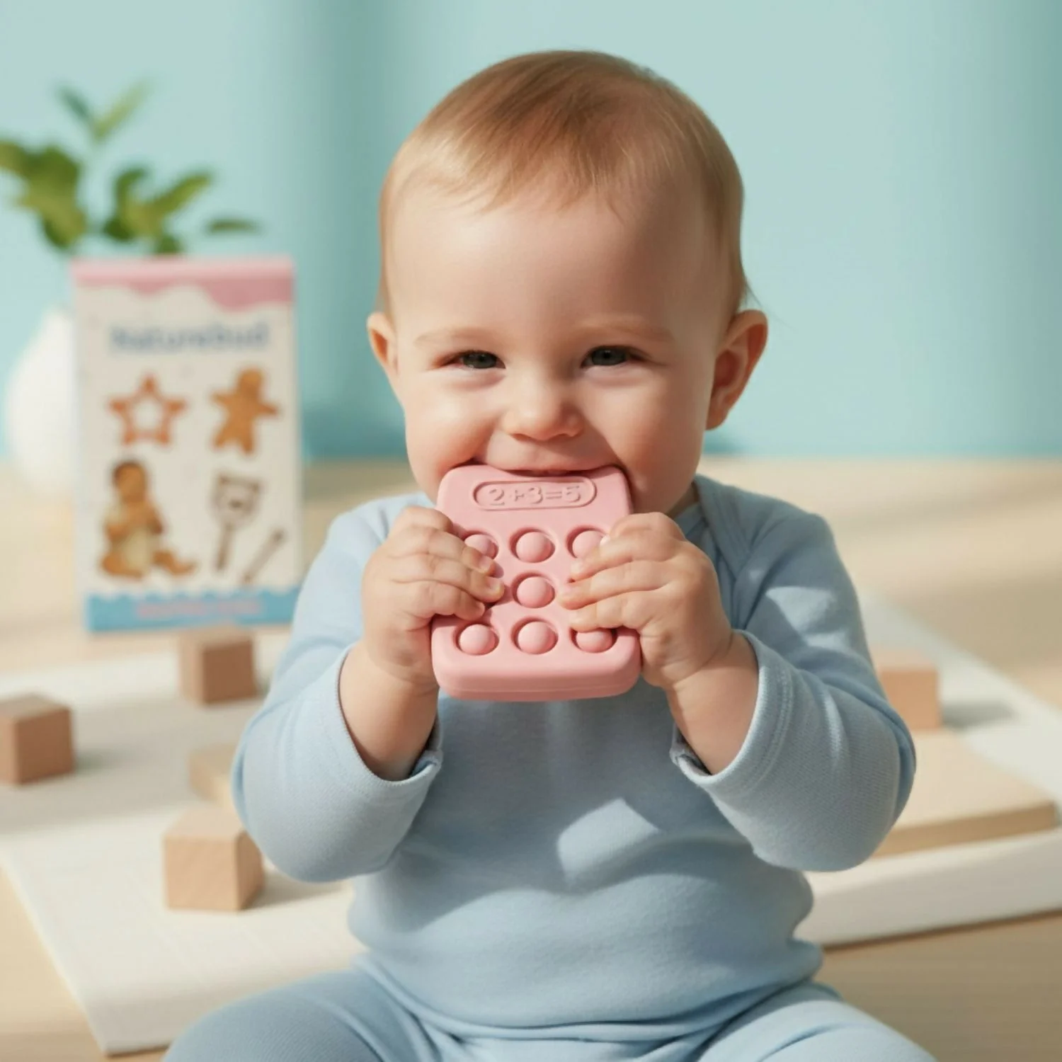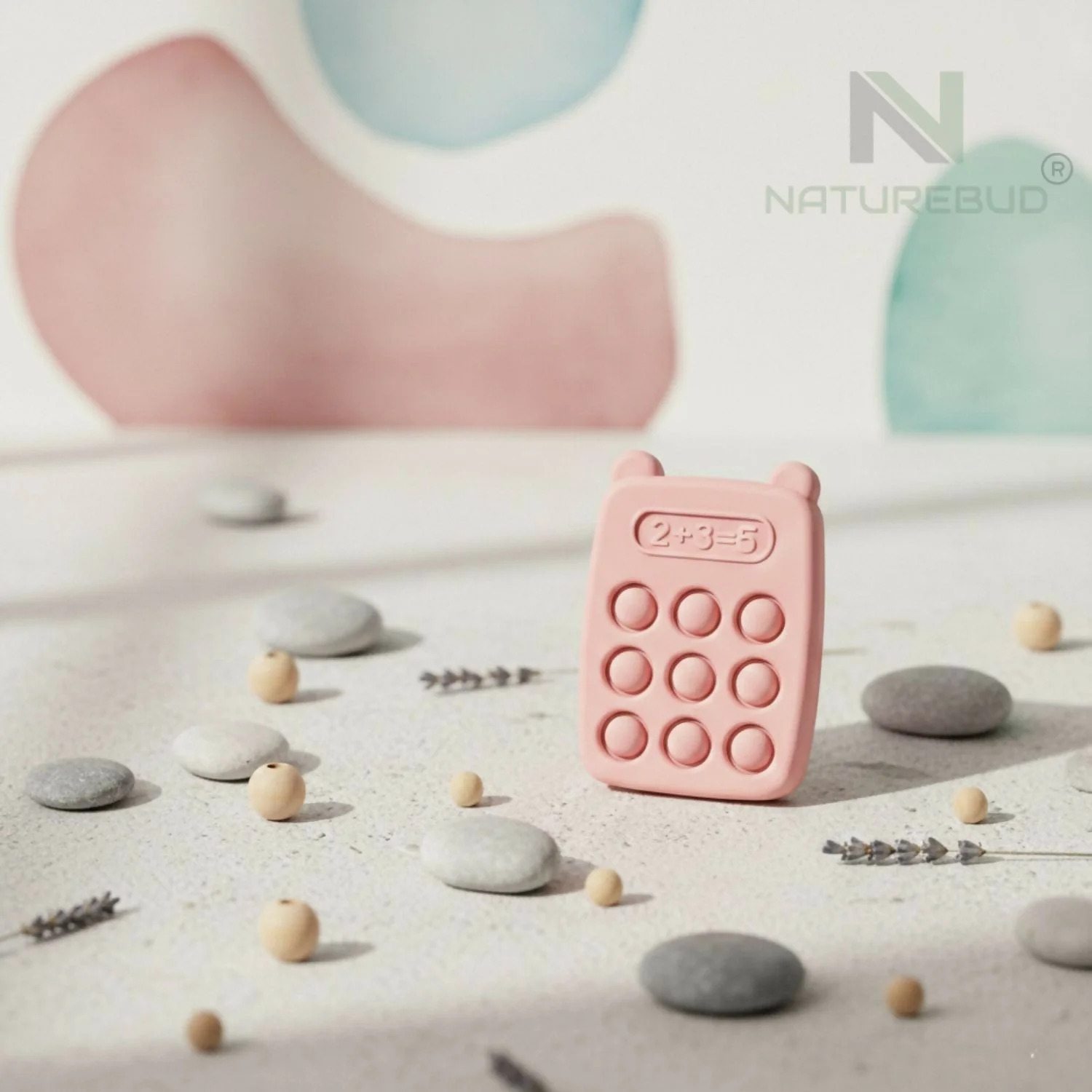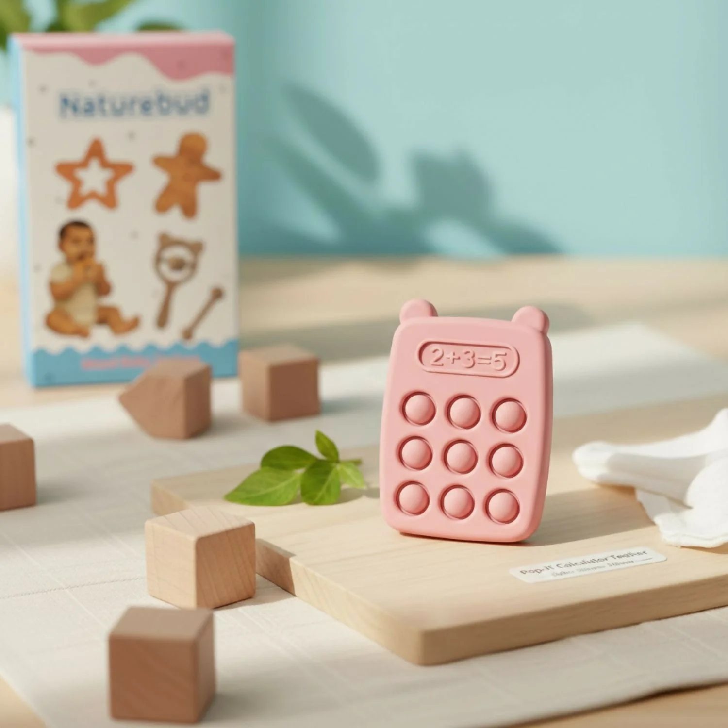 2-in-1 pop-it calculator design that combines sensory play with soothing teething relief
