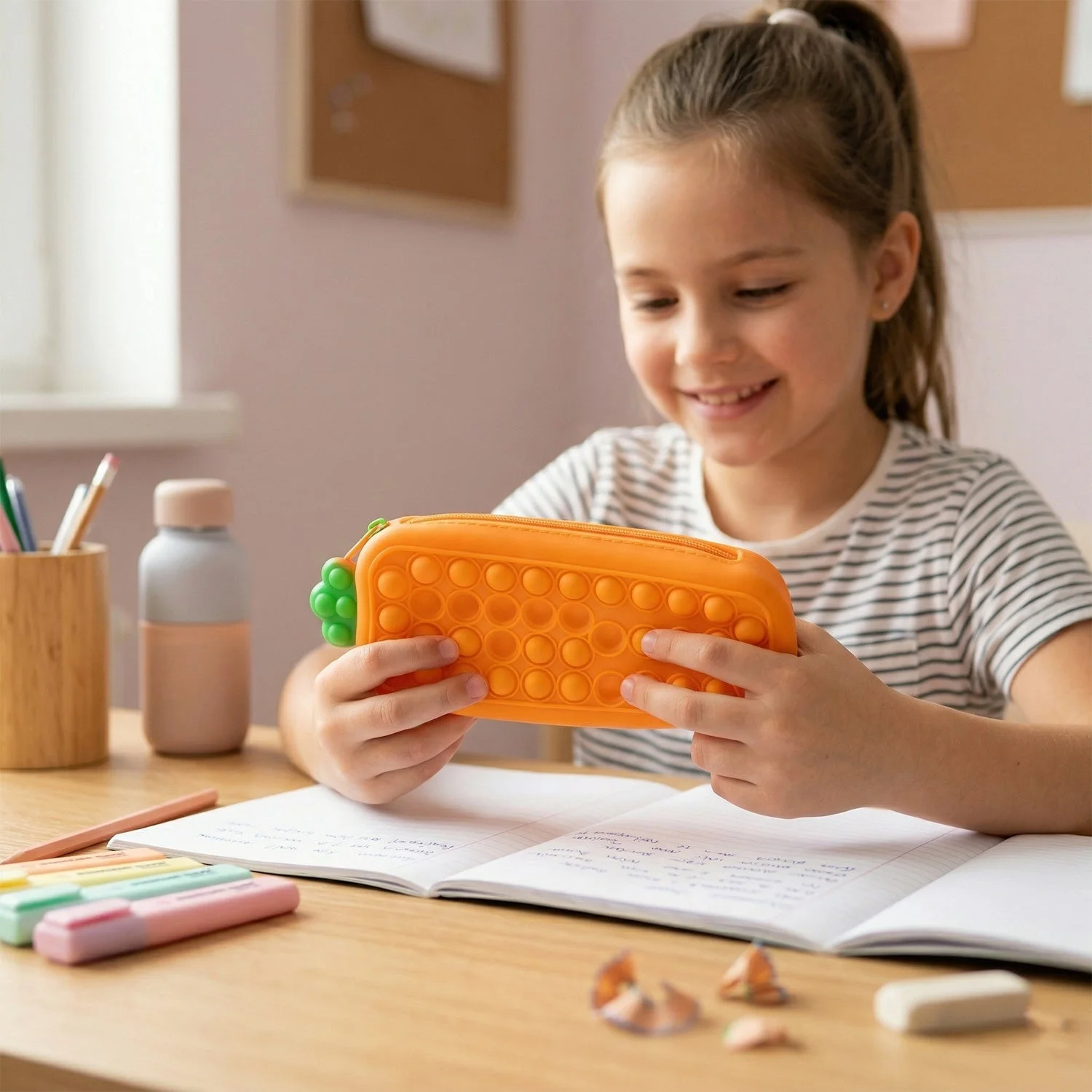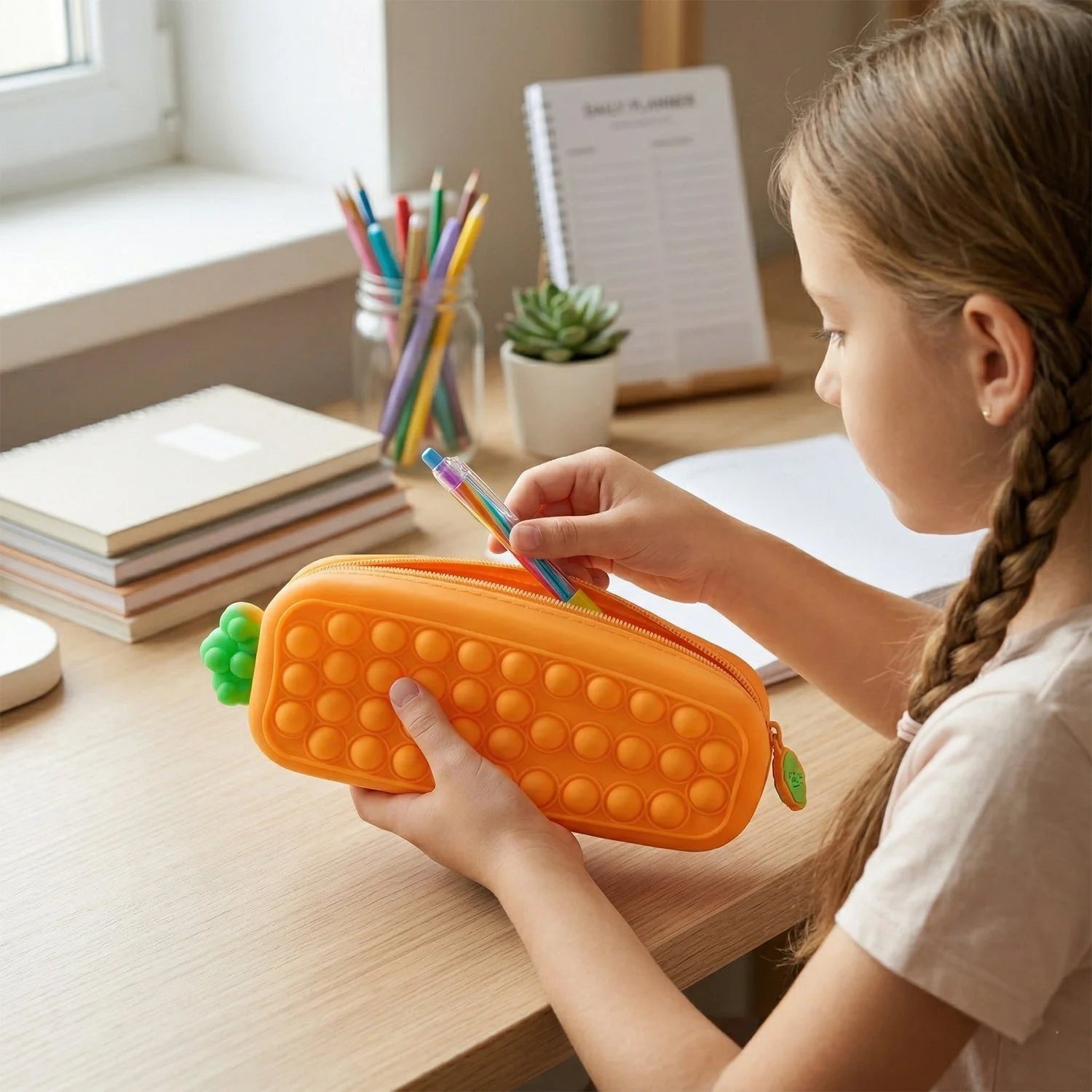 Make school time more fun and organized with this trendy pop it pencil pouch designed for both storage and stress relief. Featuring a soft bubble pop surface, this pouch doubles as a fidget toy, helping kids stay relaxed and focused. The spacious compartment easily holds pens, pencils, erasers, and other stationery essentials. Its secure zipper closure keeps items safe while the flexible design makes it easy to carry anywhere. A perfect blend of functionality and fun for everyday school use.