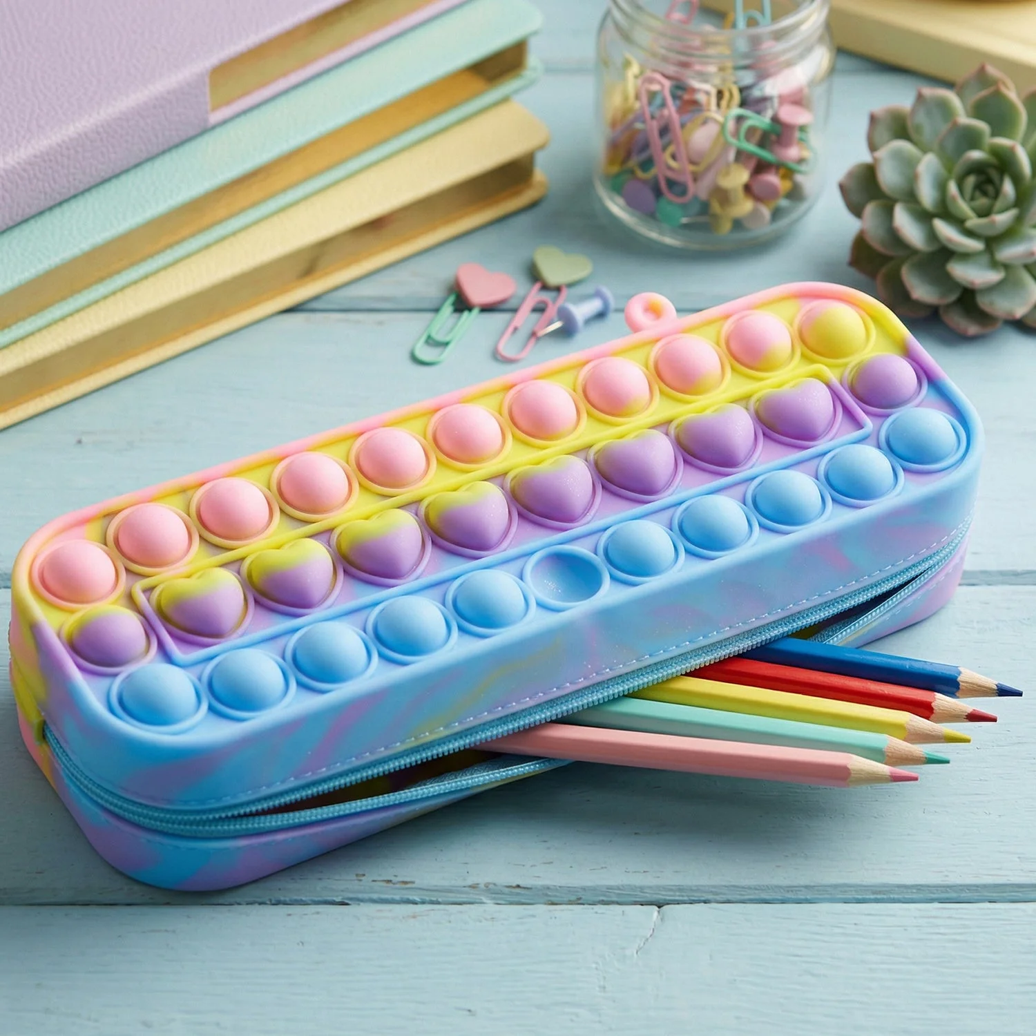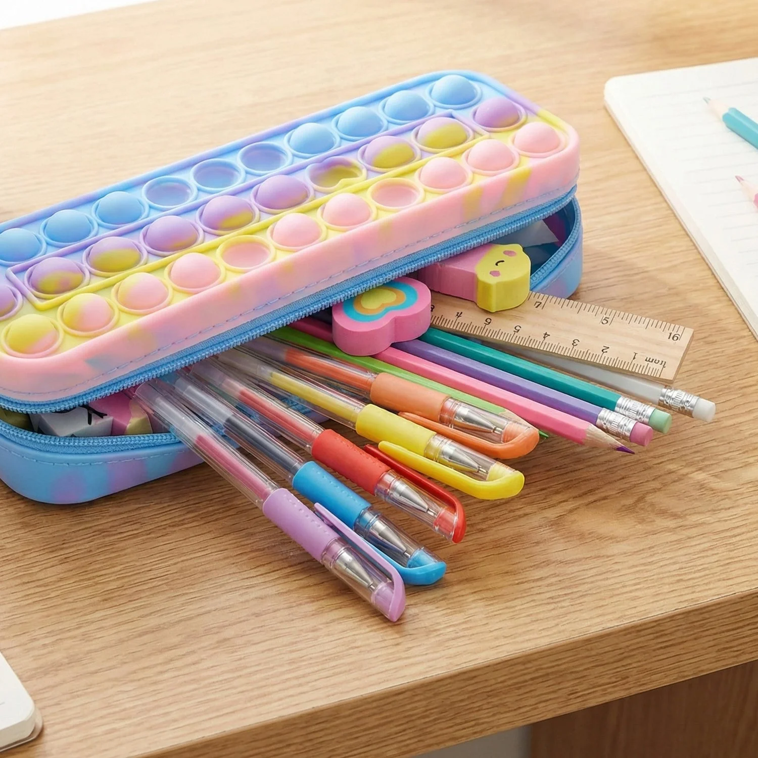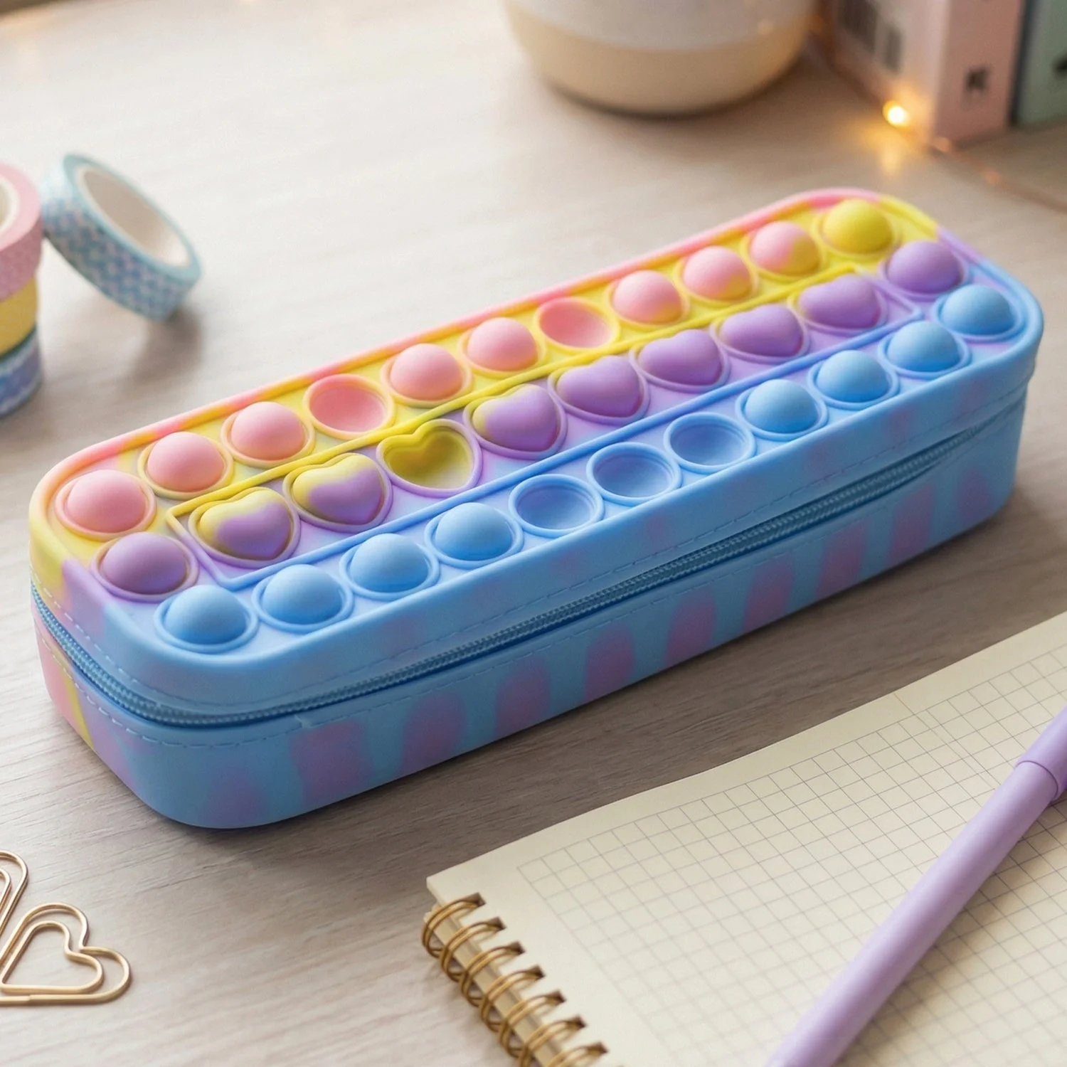 Make school time more fun and organized with this unique pop-it pencil pouch that combines storage with a playful fidget design. Featuring a soft bubble surface, it provides a satisfying pressing experience while helping reduce stress and boredom. The spacious compartment easily holds pens, pencils, and other stationery items, keeping everything neatly arranged. Designed for daily use, it is both practical and entertaining, making it a favorite among kids. Its compact and portable structure makes it perfect for carrying in school bags or using at home.
