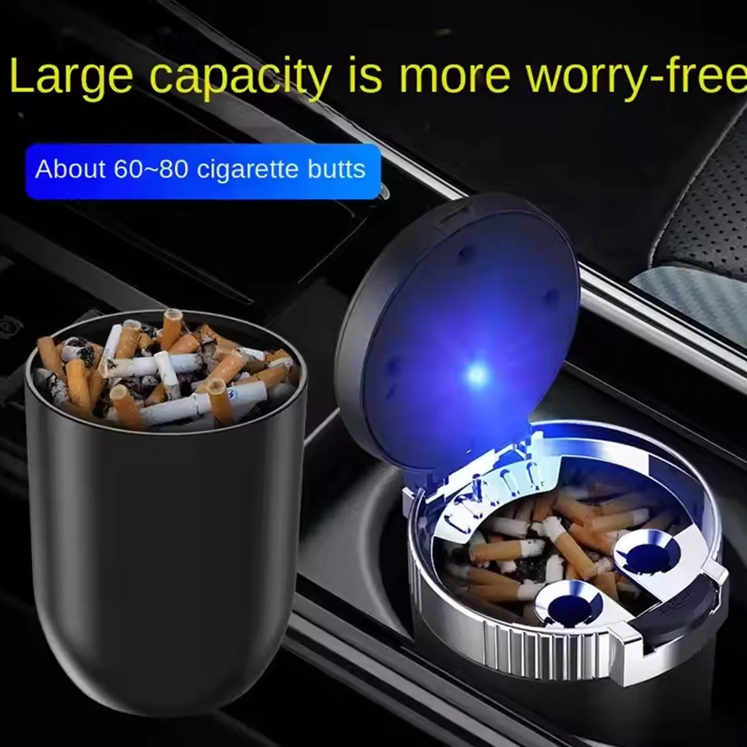 - Car Ashtray ---The smokeless ashtray has a blue LED light that will light up when the lid is lifted. The LED light allows you to easily find its location.