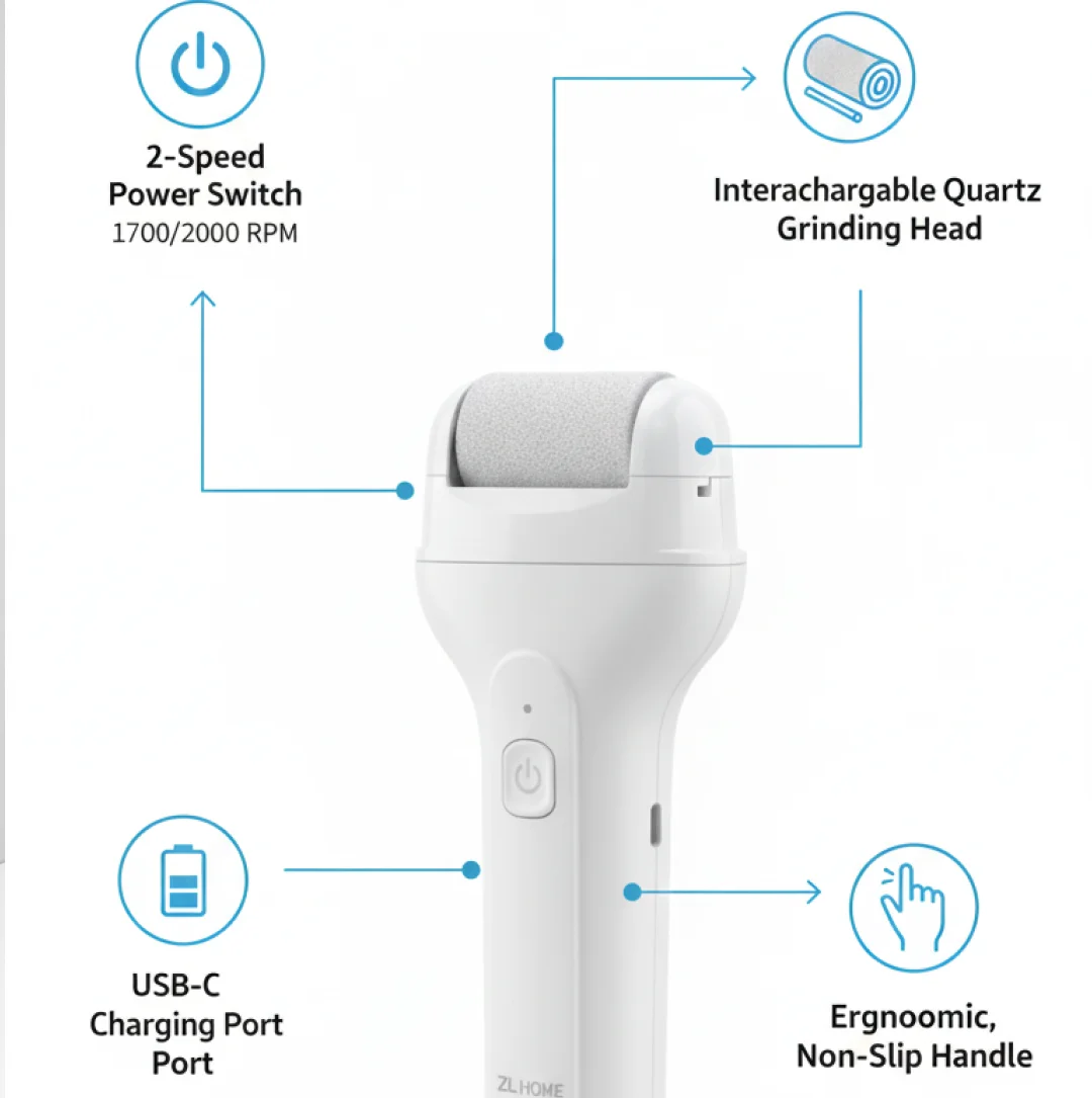 - Interchangeable1 roller heads include fine grinded head, medium grinded head, coarse grinded head for efficiently removal of hard skin and dry dead skin.