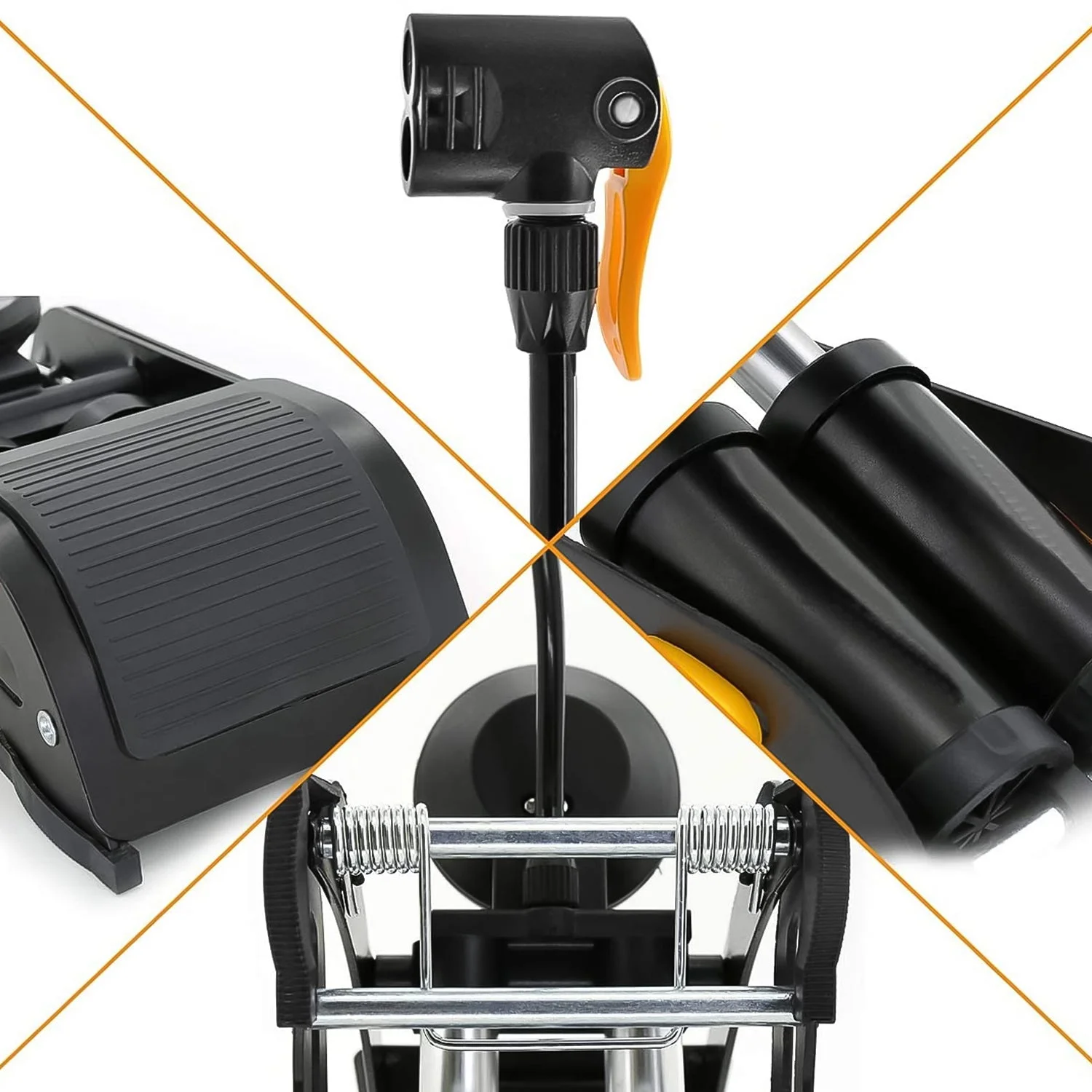 Double-Cylinder Faster Pump: The double barrel bike pump is made of quality heavy metal, which makes it sturdy, durable, anti-corrosion. And it adopts strengthened Double-cylinder, more air pressure, less leaking, can pump quickly. Besides, the spring is made of steel ensures a fast return of the piston, so it can provide super-high pressure during pumping;