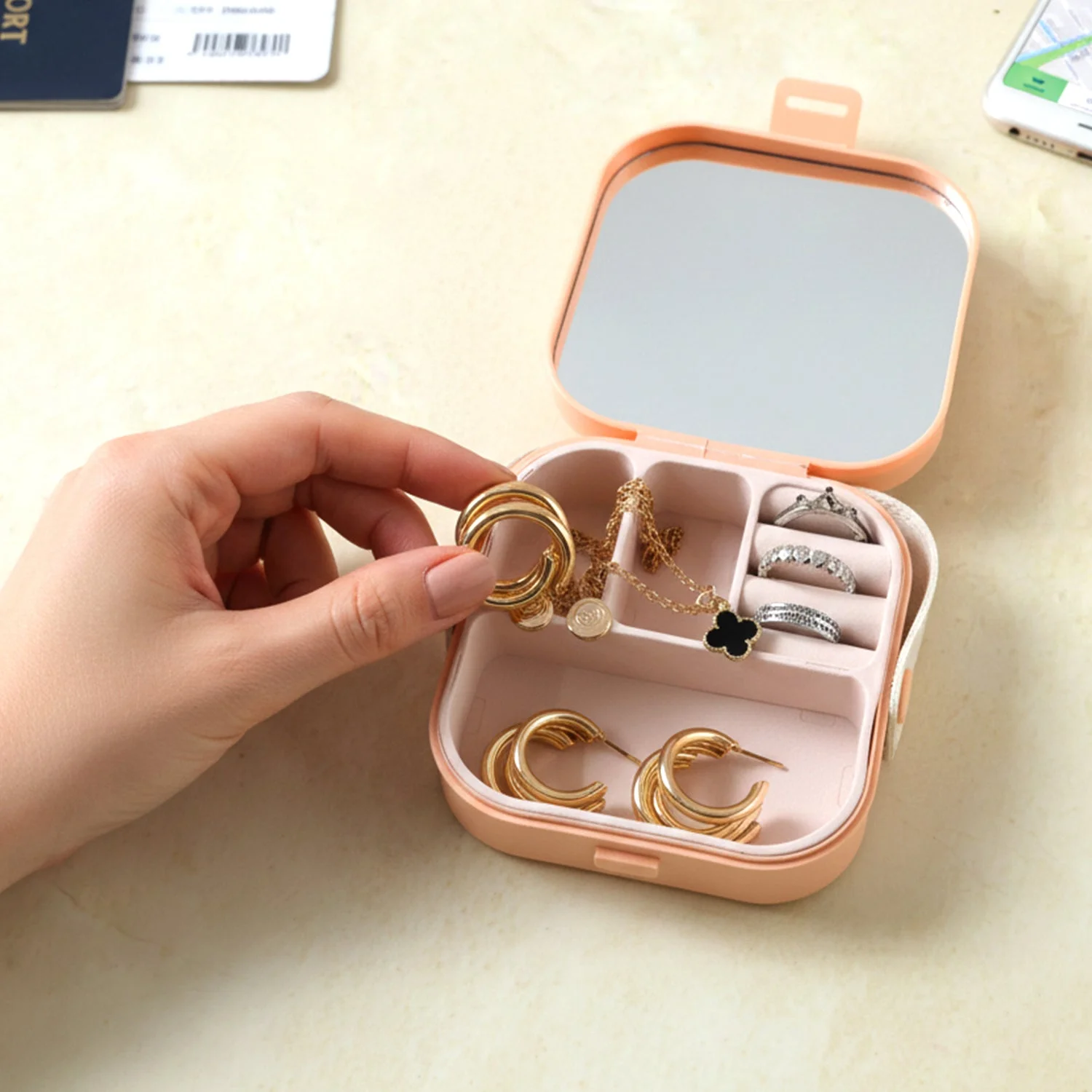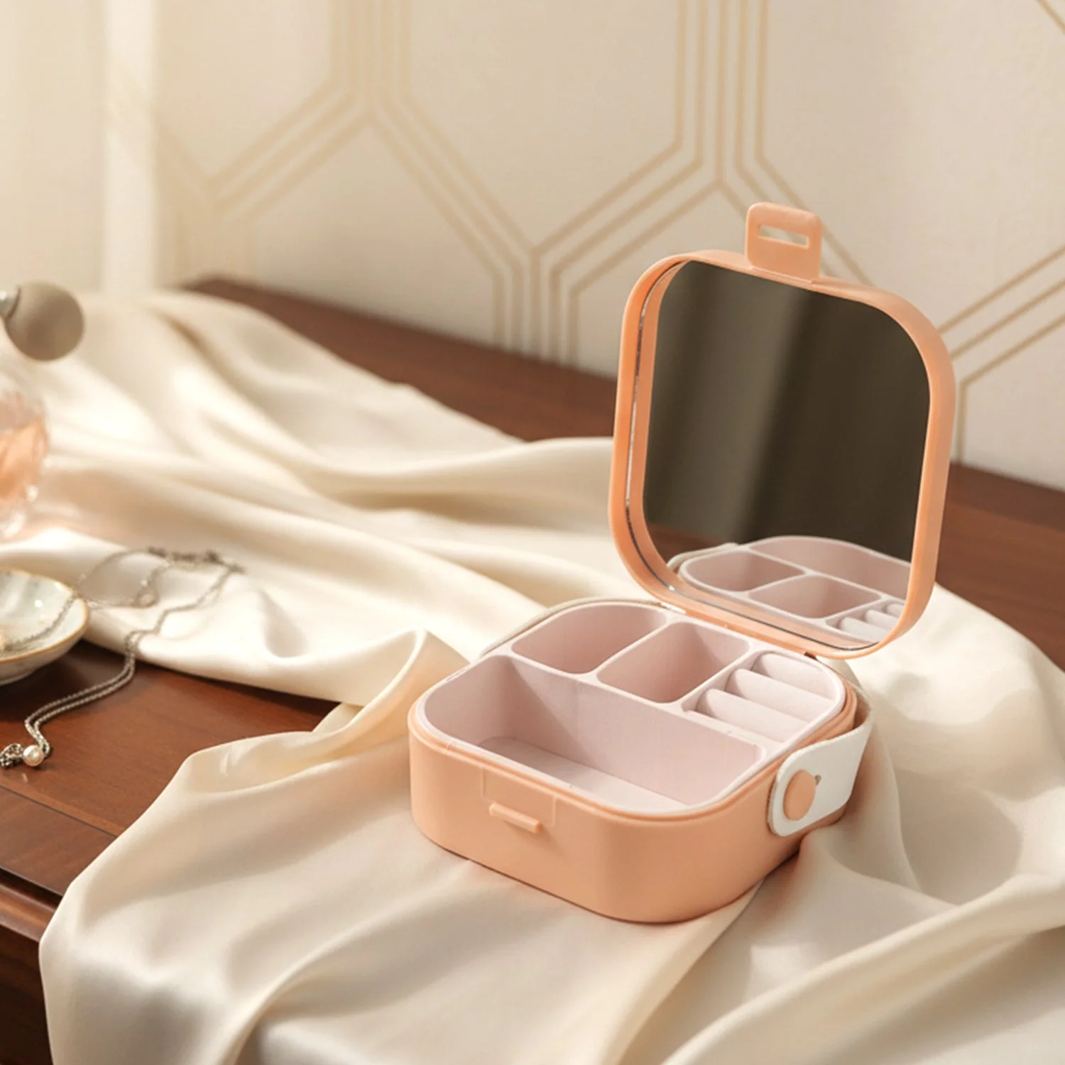 portable mini jewelry box, compact jewelry storage case, built-in mirror jewelry organizer, multiple compartment jewelry box, travel jewelry organizer, ring storage case, earring storage box, chain and necklace organizer, small accessories storage, multipurpose jewelry case, lightweight travel jewelry box, portable accessory organizer, desktop jewelry storage, cosmetic and jewelry case