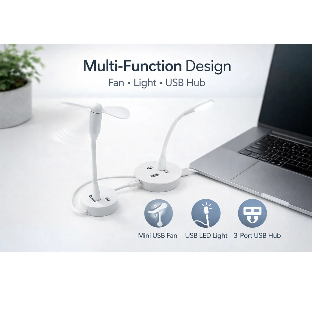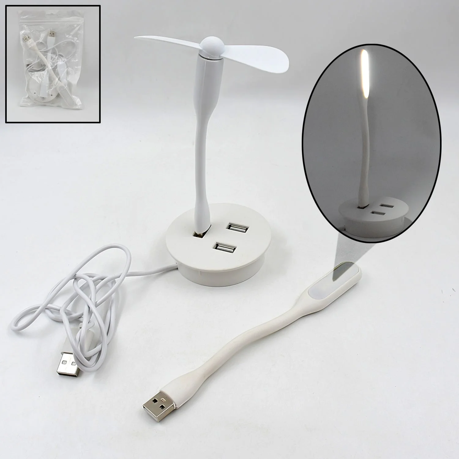 Portable Mini USB Fan, USB Light & USB 3 HUB / Port Combo, Emergency Combo Led Light, USB Fan & Port Combo of Portable USB Light USB Cable (3 Pcs Set)