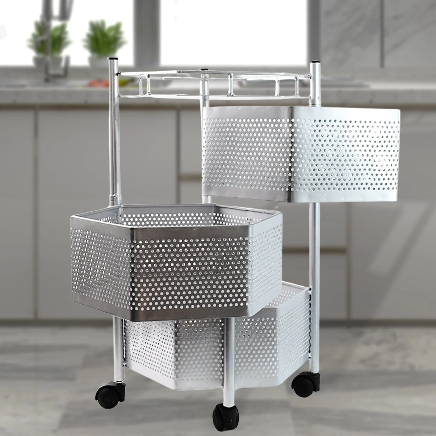 Premium 3-Layer Hexagon Kitchen Storage Trolley with Wheels – Heavy Duty Multipurpose Vegetable & Fruit Storage Rack with Rotating Basket Design – Durable Metal Organizer Stand for Vegetables, Fruits, Pantry, Utensils & Household Essentials (1 Pc)