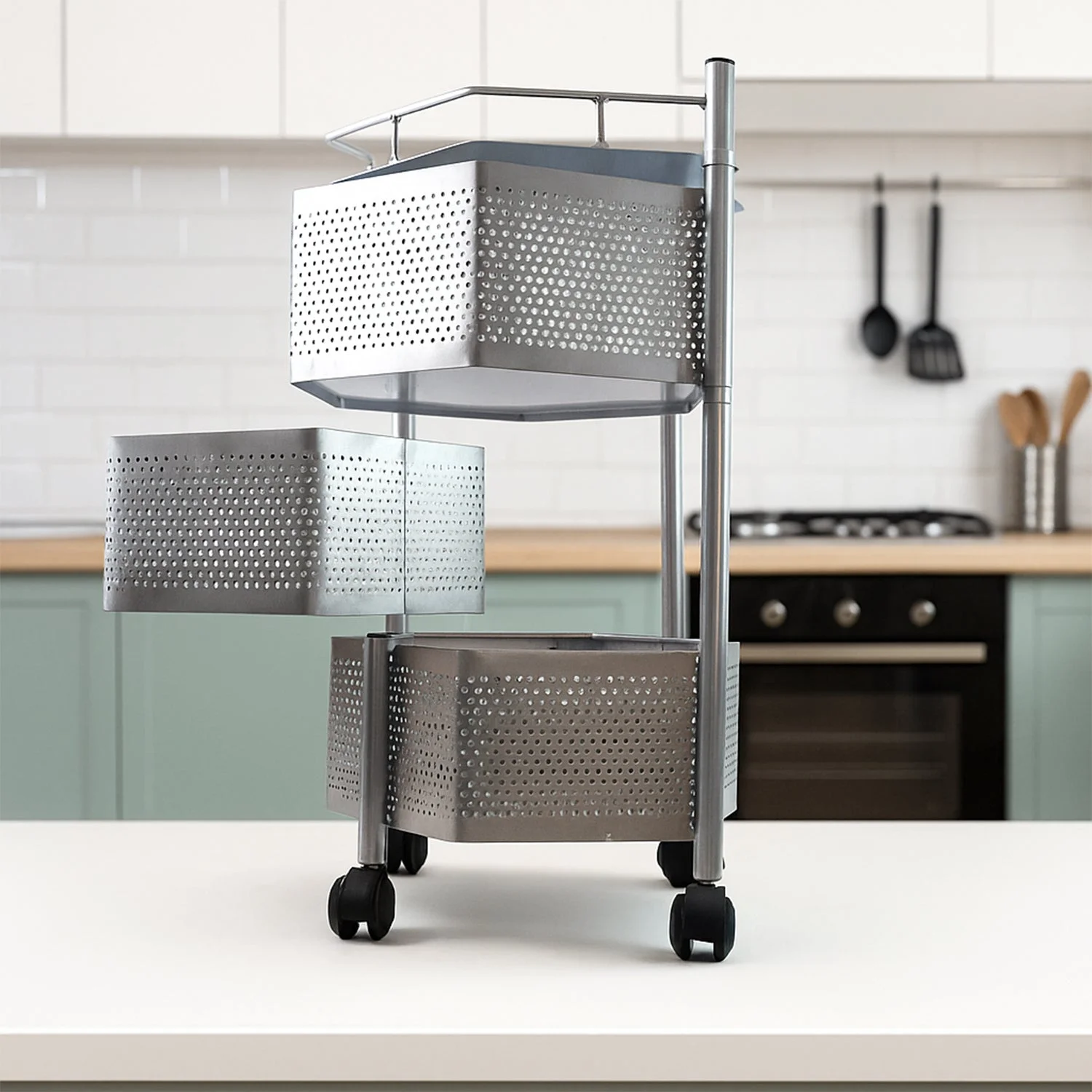 storage rack, kitchen storage trolley, fruit and vegetable basket, multipurpose storage stand, rolling storage cart, rotating storage rack, movable organizer rack, space saving storage basket,kitchen organizer rack,3 tier storage trolley, mesh basket storage stand, rotating kitchen rack, movable utility cart