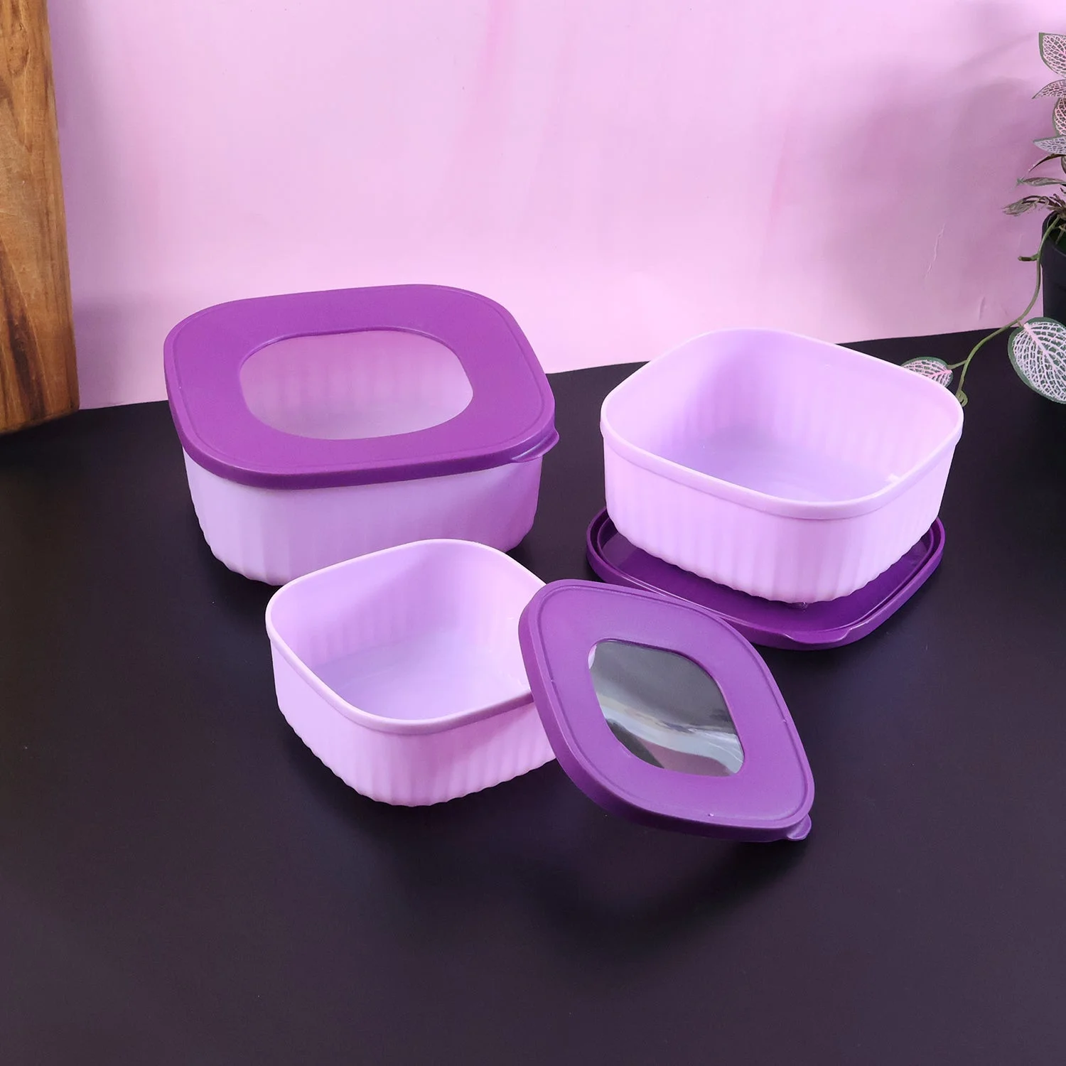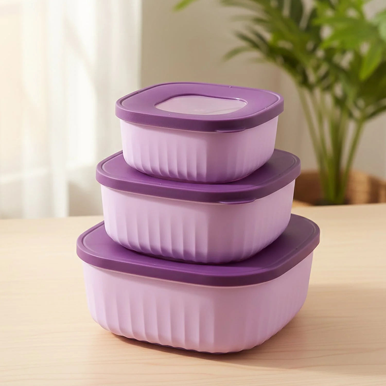 This 3 piece food storage container set is designed to keep your kitchen organised while keeping everyday ingredients fresh and neatly stored. Each container comes with a tight-fit lid that helps reduce spills and odours, making it ideal for storing cut fruits, vegetables, cooked dishes, snacks and meal prep portions. The square shape maximises shelf space in the fridge or pantry and allows the containers to nest inside each other when not in use, saving valuable storage space. With three different capacities, you can easily separate small, medium and larger portions according to your needs. The smooth, easy-to-clean surface makes daily use simple and hygienic, while the coordinated colour scheme adds a neat, modern touch to your countertop and refrigerator.