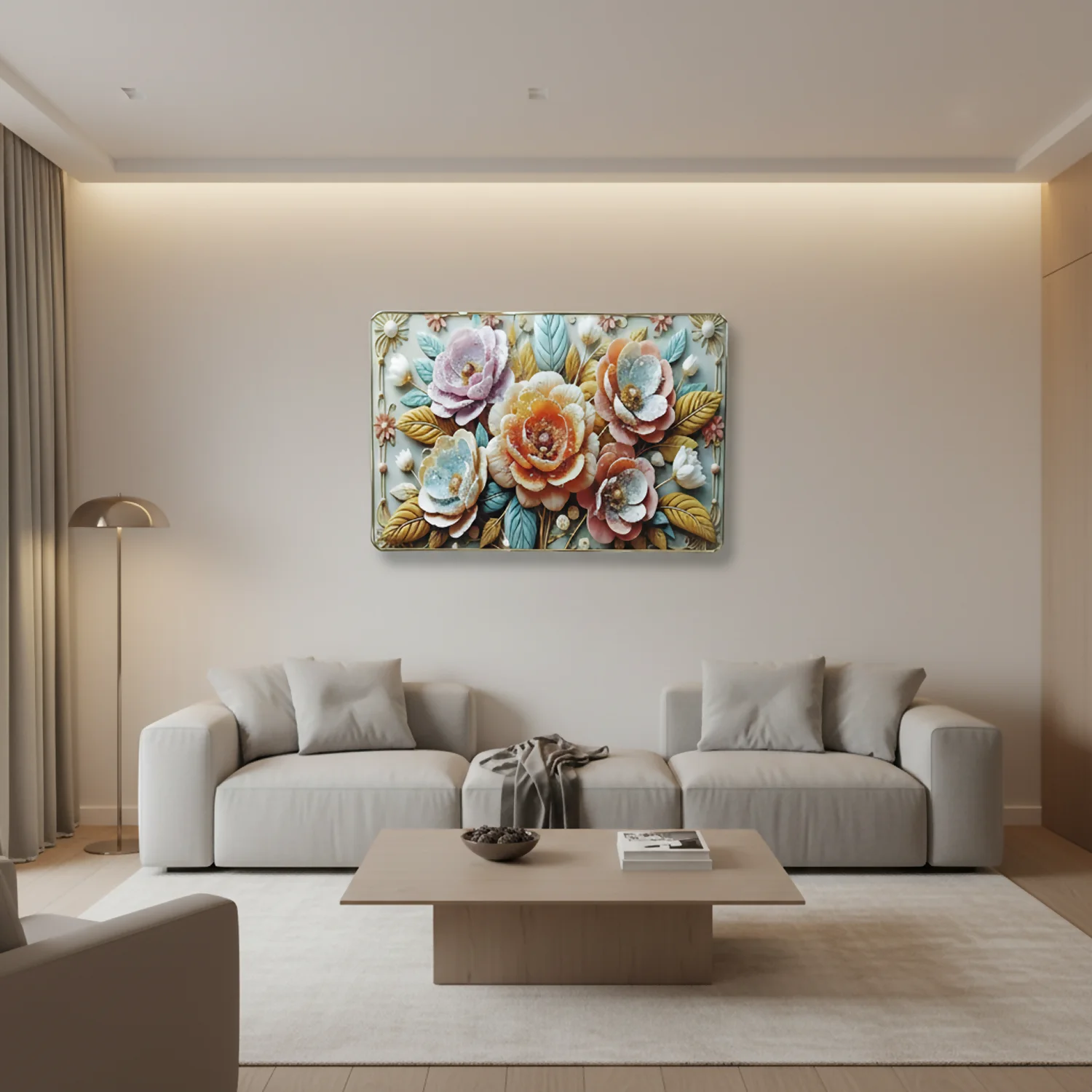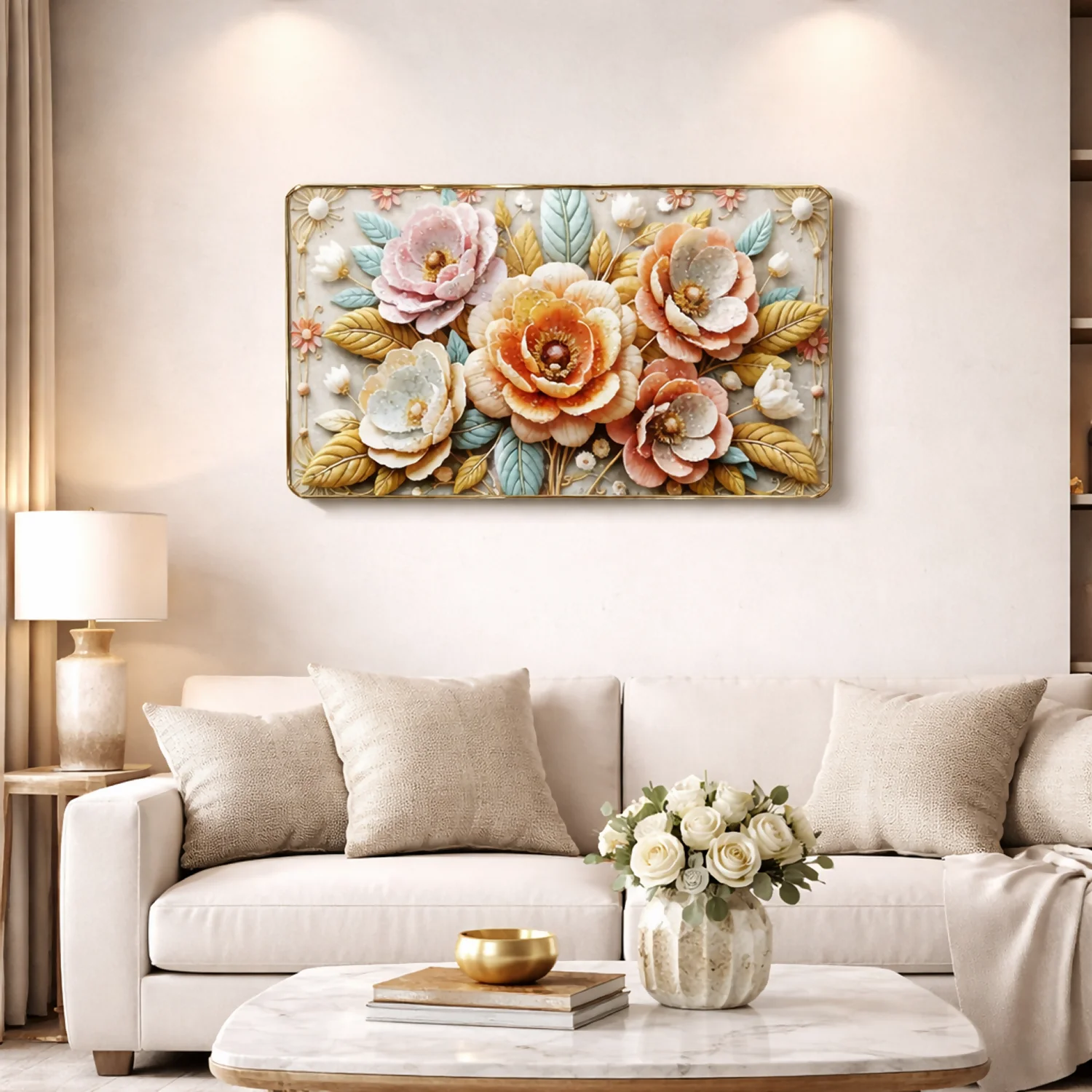 Transform your space with this premium 3D floral wall art panel, designed to bring elegance, warmth, and a luxurious touch to your home. Crafted with precision using high-quality MDF laser cutting, this artwork features beautifully layered flowers in soft pastel tones, enhanced with intricate detailing and a premium gold-finish frame.