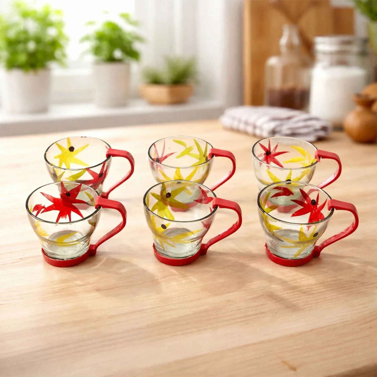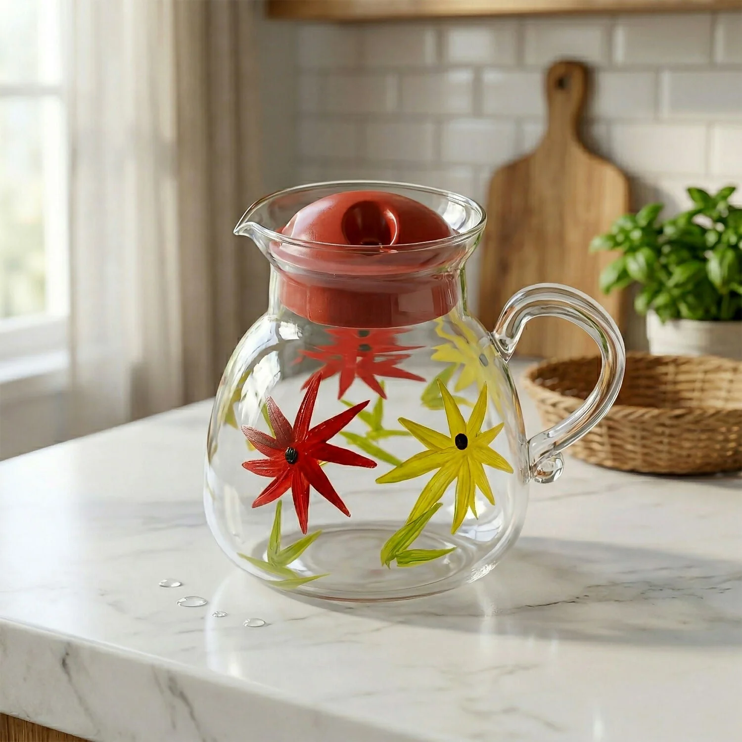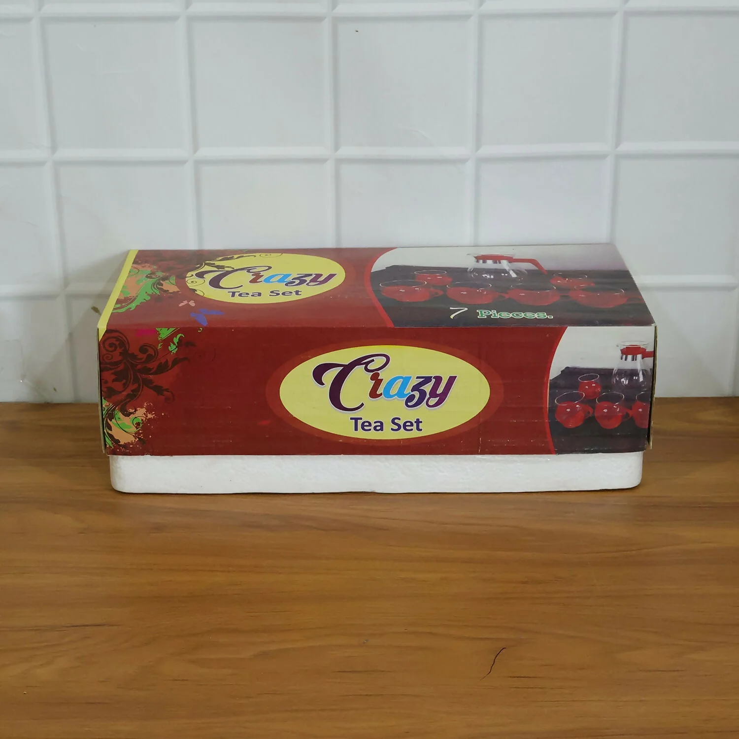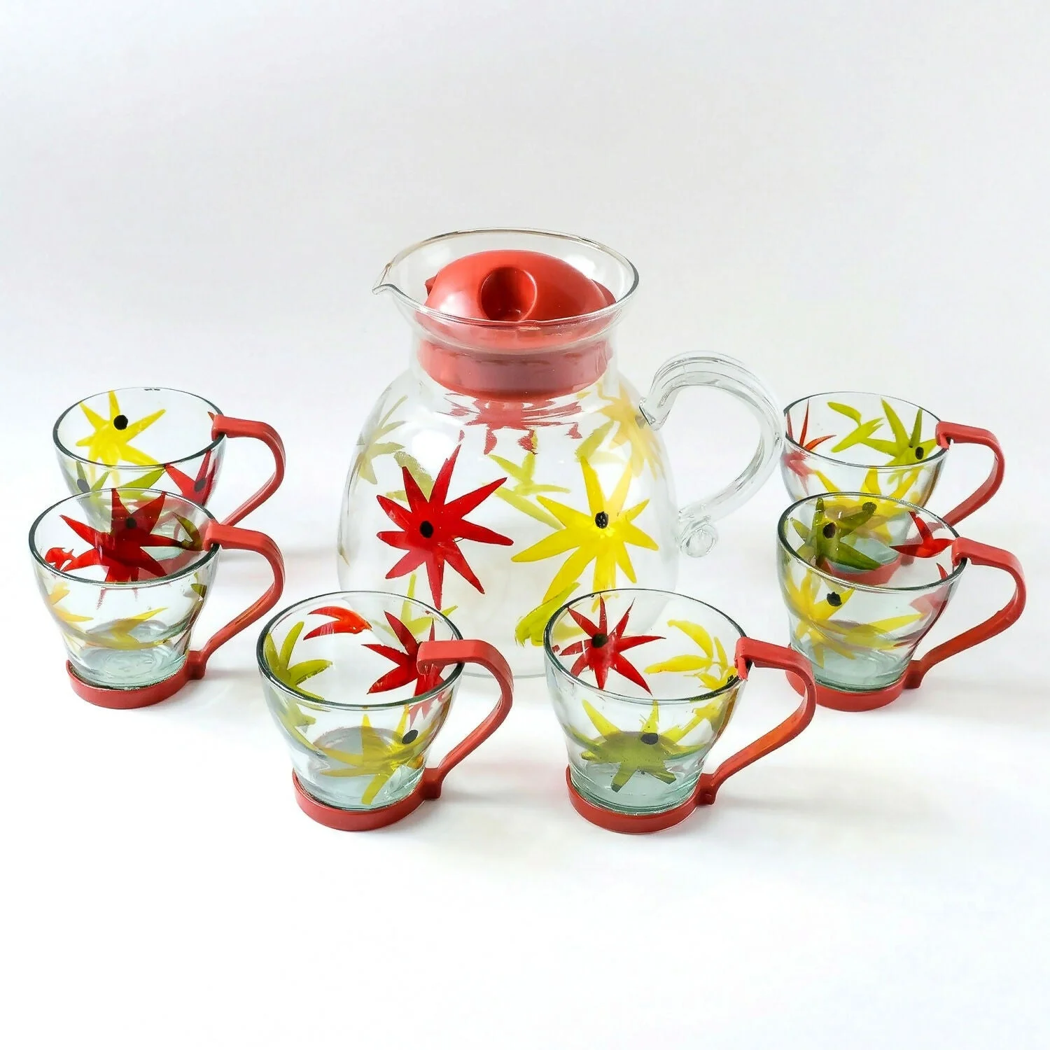 Apne chai ke samay ko aur bhi khaas banaiye is khoobsurat 7-piece Floral Glass Tea Set ke saath. Is set mein aapko milta hai ek bada glass jug aur uske saath matching design wale 6 stylish cups. Iska elegant red aur yellow star-floral print aapke dining table ki shaan badha deta hai.