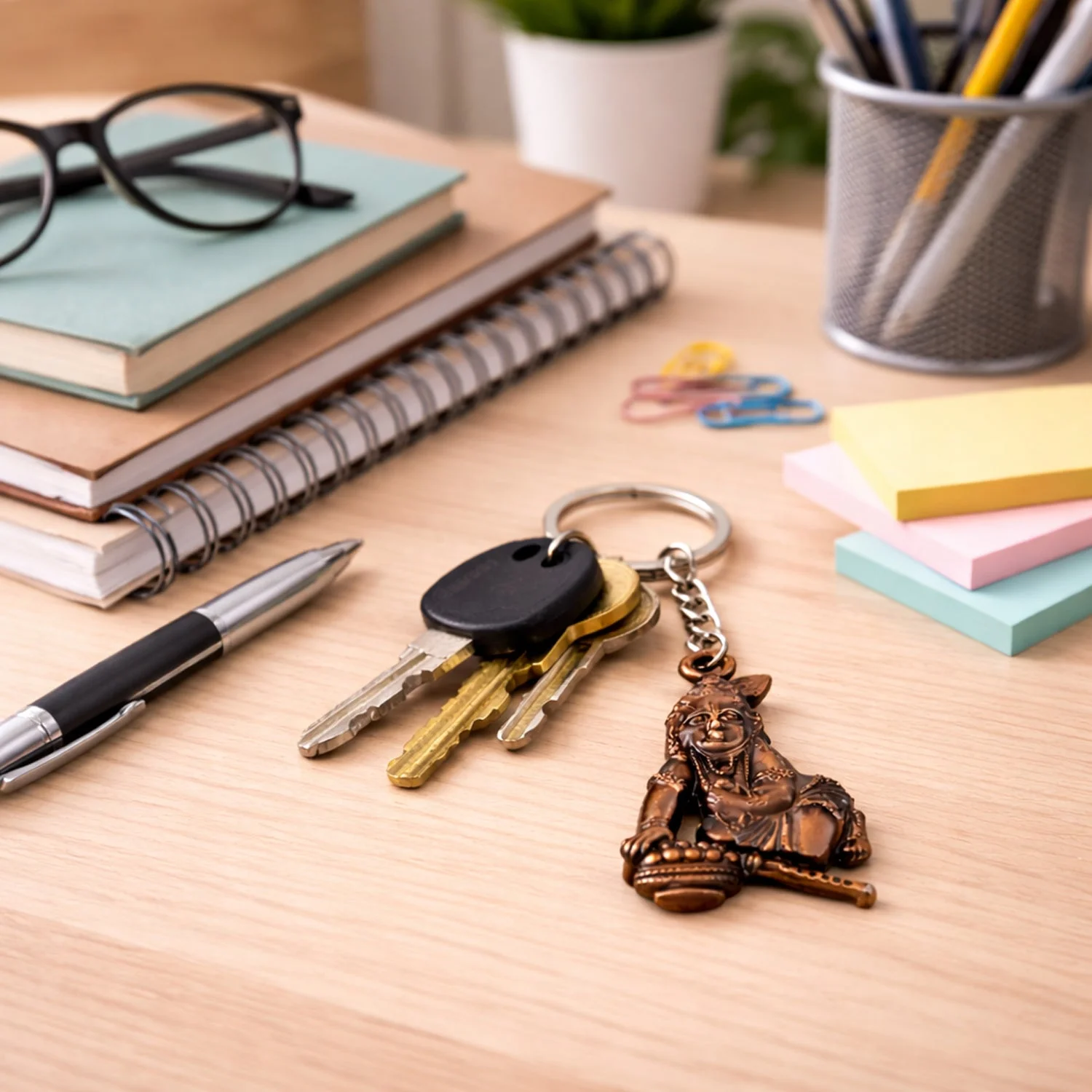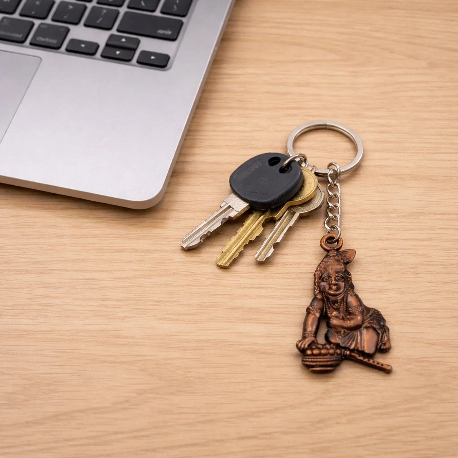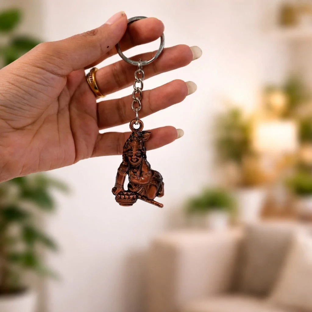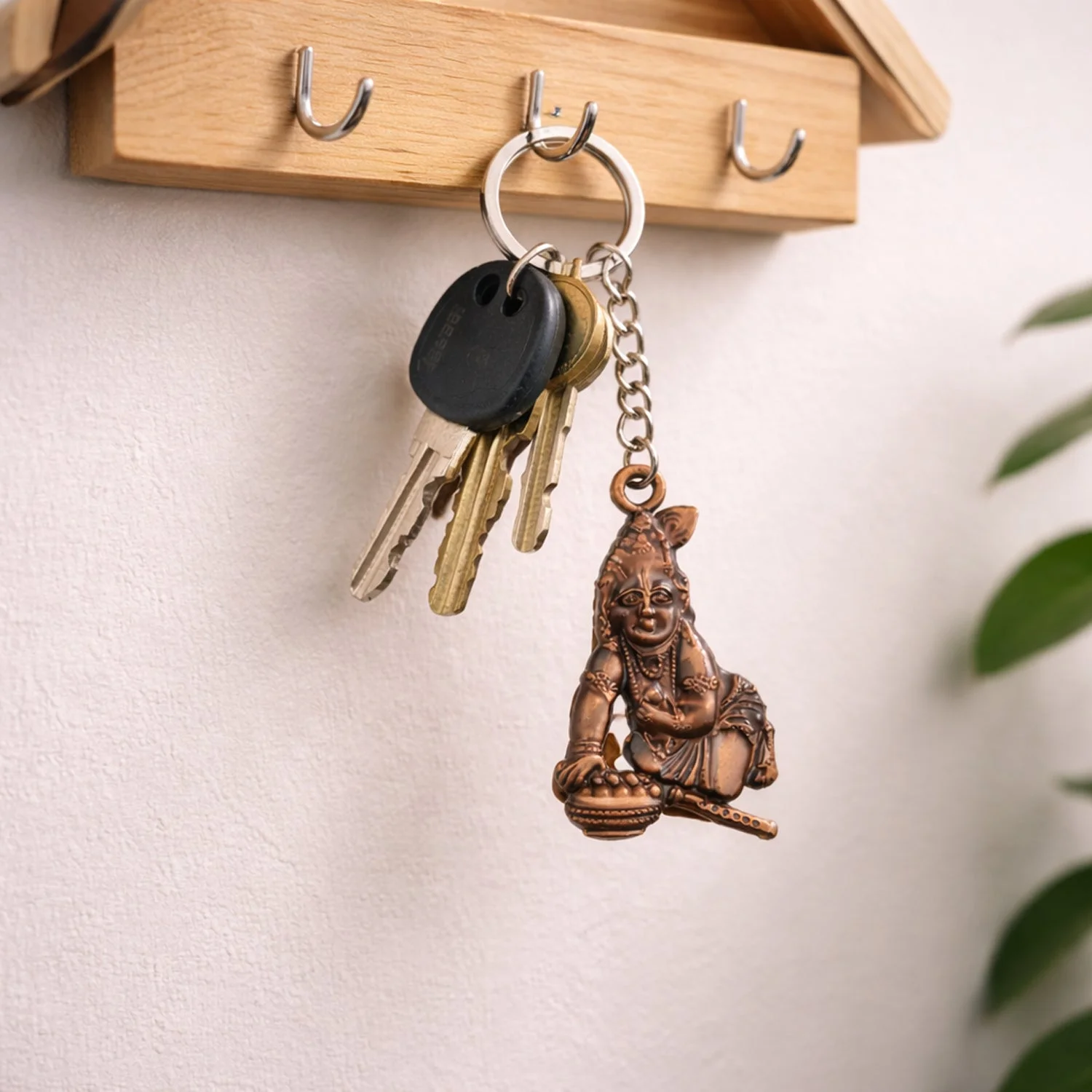 This beautifully crafted keychain features the beloved Bal Krishna in the iconic “Makhan Chor” pose, symbolizing innocence, joy, and divine blessings. Designed in an antique-gold finish, it showcases intricate detailing of Krishna’s expressions, attire, and butter pot, making it a meaningful devotional accessory. The strong metal ring and durable chain make it perfect for everyday use with car keys, bike keys, home keys, or office keys. Lightweight yet visually striking, this keychain adds a touch of spirituality and elegance to your daily routine. It also makes a thoughtful and auspicious gift for festivals, celebrations, and special occasions.