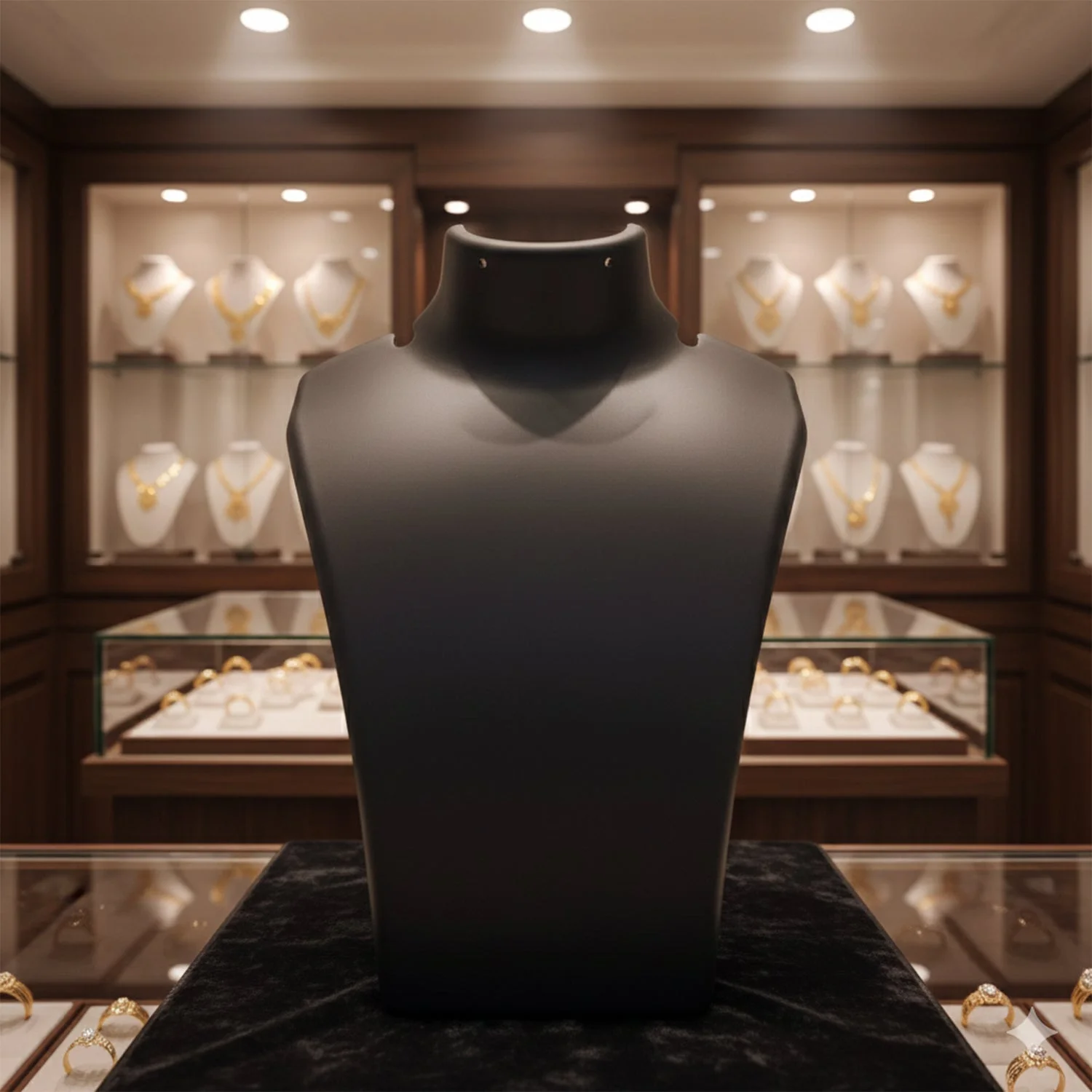 This premium jewellery display stand is designed to elevate the presentation of necklaces, chains and bridal jewellery sets with a high-end, professional look. Its sleek black finish enhances the shine and detailing of any jewellery placed on it, making it ideal for photography, retail displays and showroom setups. The stand provides a perfect upright angle, ensuring the jewellery stays well-positioned for clear visibility and aesthetic appeal. Its stable base allows it to be used on counters, marble tops, showcases and photo studios effortlessly. Whether you are shooting catalogue images or arranging a display for customers, this stand adds sophistication and enhances the perceived value of your jewellery.