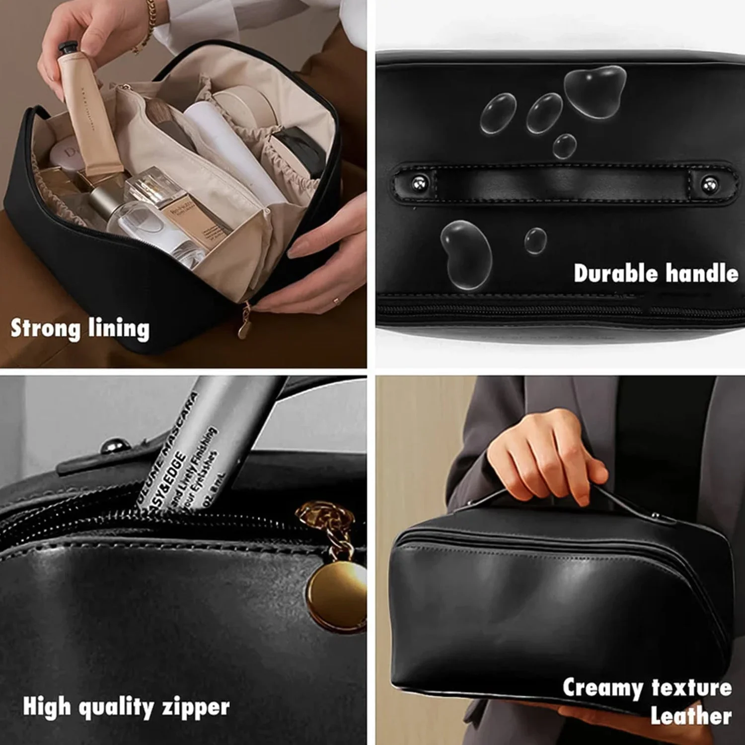 Equipped with a full-length zipper and a secure carrying handle, the pouch opens wide for easy access to contents. The internal compartments are thoughtfully designed to hold bottles, brushes, makeup kits, creams, deodorants, and even small electronics or grooming tools. Its minimalist yet elegant black finish makes it perfect for both men and women.