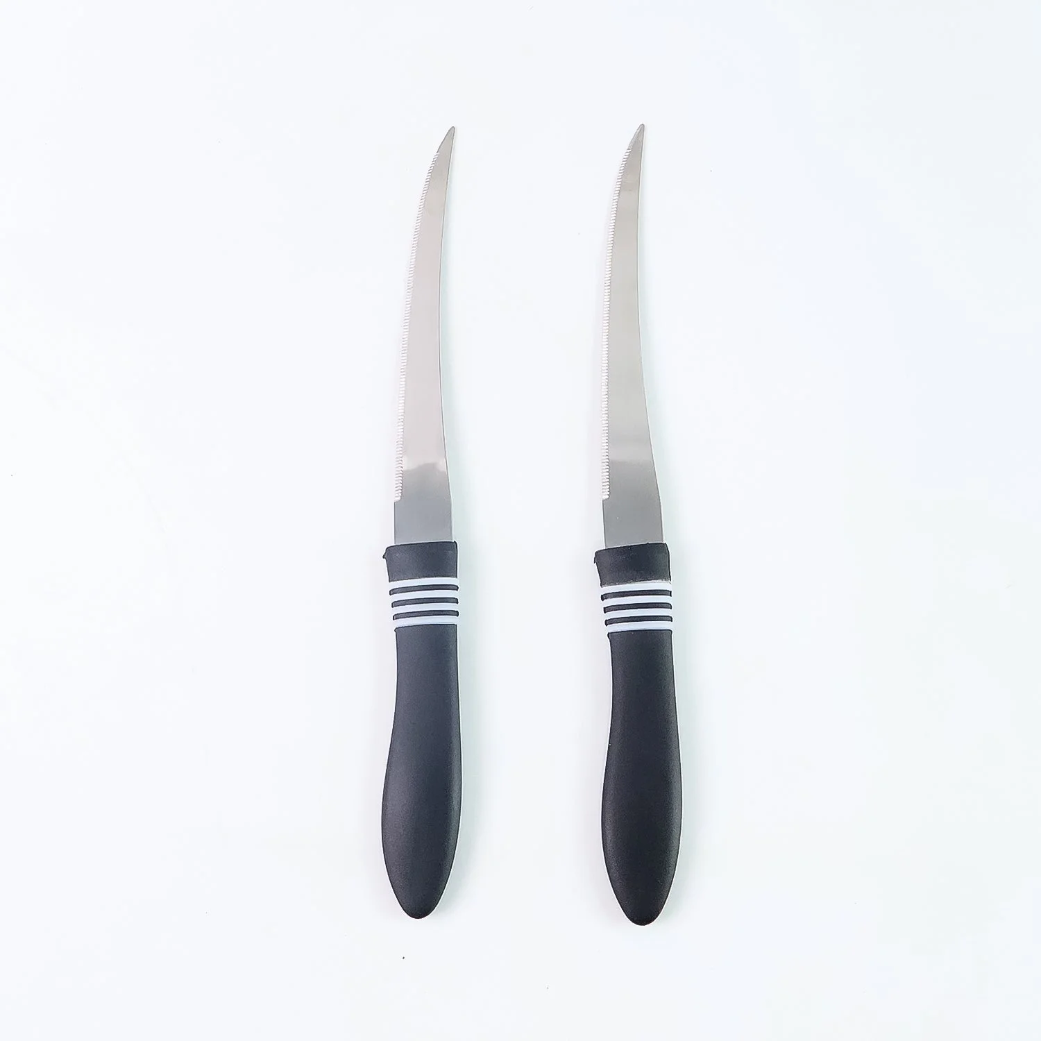 Upgrade your kitchen essentials with this 2-piece Curved Serrated Stainless Steel Kitchen Knife Set, expertly designed for superior cutting performance and comfort. Each knife features a razor-sharp curved blade with finely serrated edges, ideal for slicing through vegetables, fruits, bread, and boneless meats with ease. The ergonomic black handle ensures a firm and comfortable grip, allowing for precision control during every use. Durable, lightweight, and stylish—perfect for both everyday cooking and professional settings.