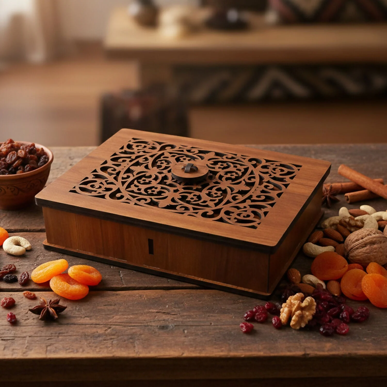 Bring elegance to your serving style with this premium decorative dry fruit storage box designed for both gifting and daily use. The box features a beautifully carved top lid that gives it a rich traditional look, making it perfect for festive occasions, weddings, and special gatherings.
