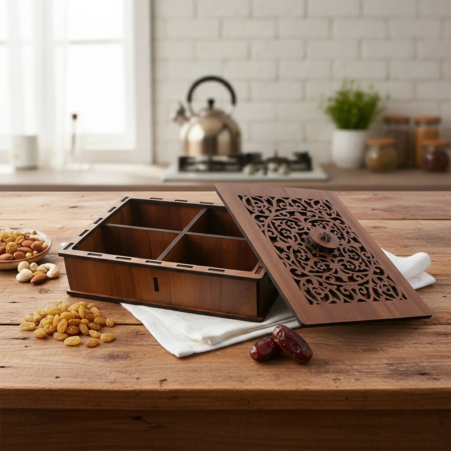 A perfect blend of utility and style, this box enhances the presentation of dry fruits while keeping them organized and easy to access.