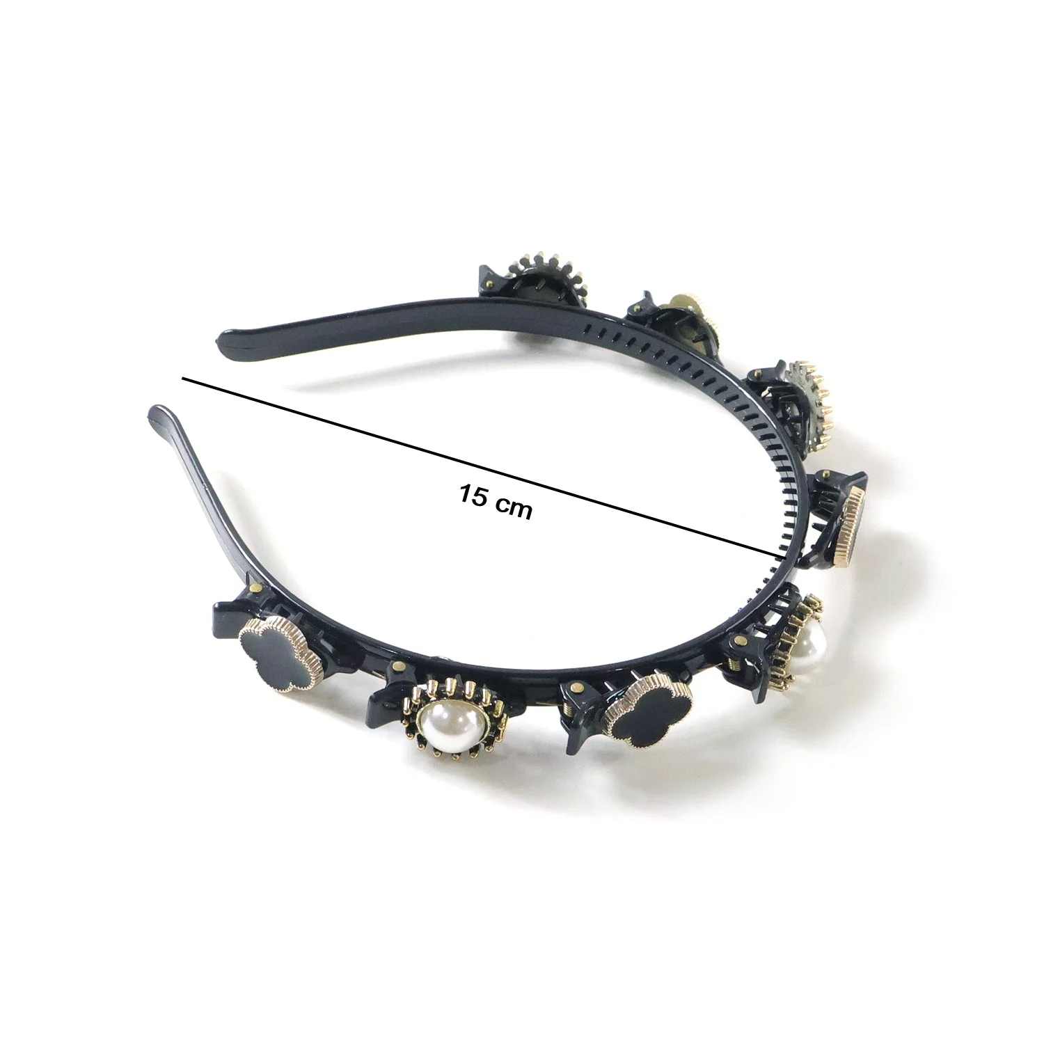 Elegant Pearl Studded Floral Design Hair Band 1 Pc – Premium Decorative Headband Stylish Black & Gold Finish Comfortable Grip Hair Accessory for Women Girls Party Wear Daily Styling Hair Band