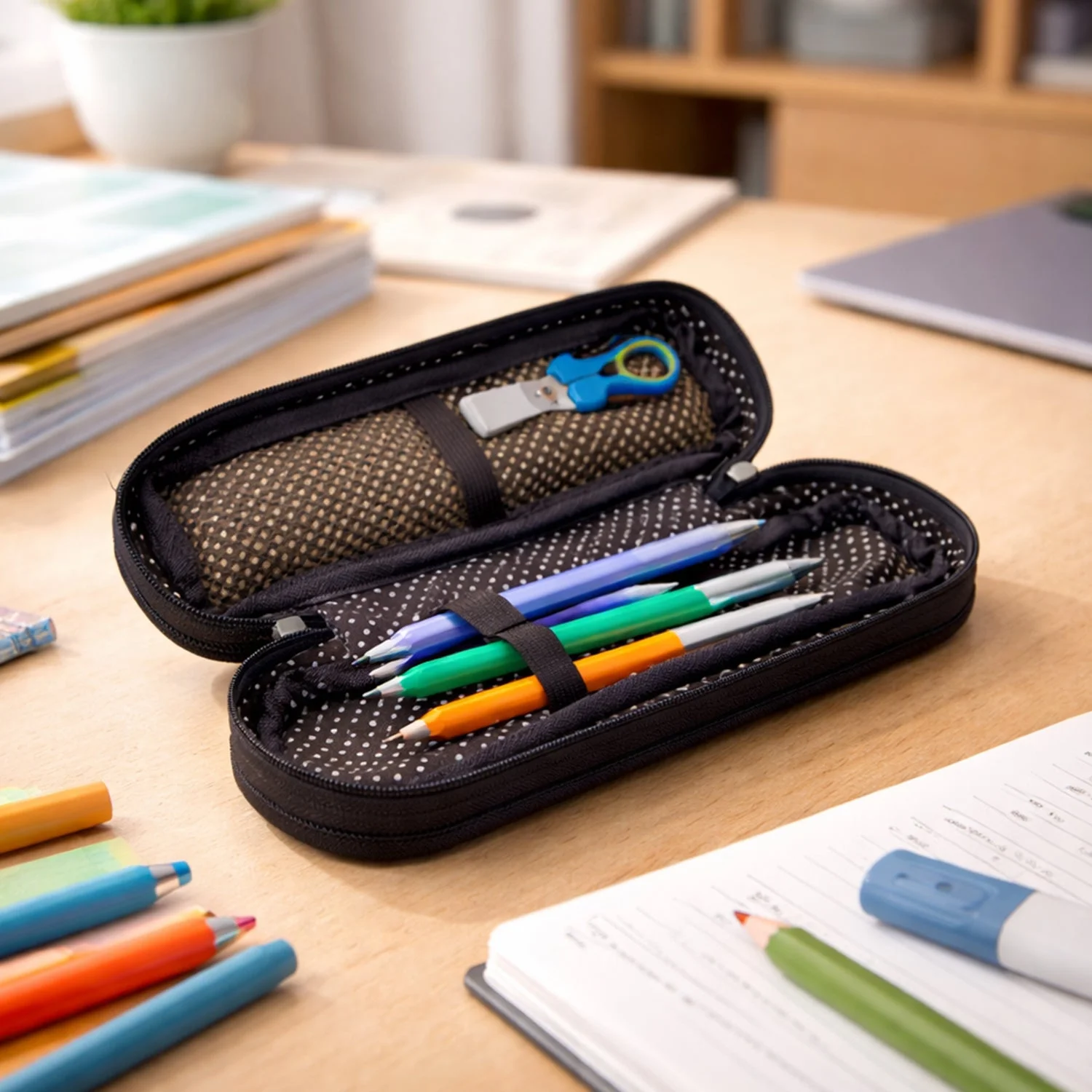 Organize your stationery in style with this premium fabric zipper pencil pouch designed for everyday use. Featuring a sleek and compact design, it offers ample space to store pens, pencils, and essential accessories neatly. The sturdy zipper ensures secure closure while allowing easy access to your items. Its durable fabric construction provides long-lasting performance, making it ideal for students and professionals alike. Perfect for school, office, or travel, this pouch combines functionality with a modern look.