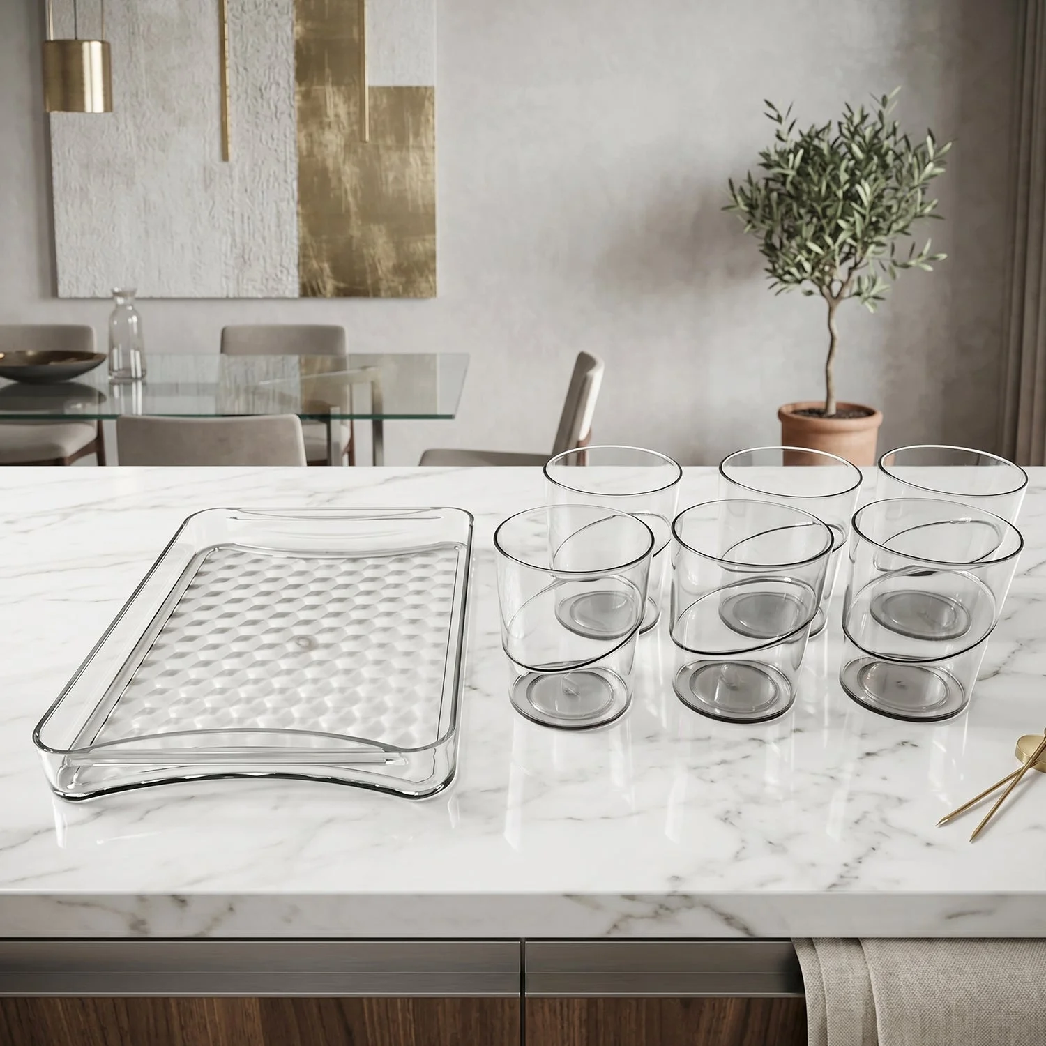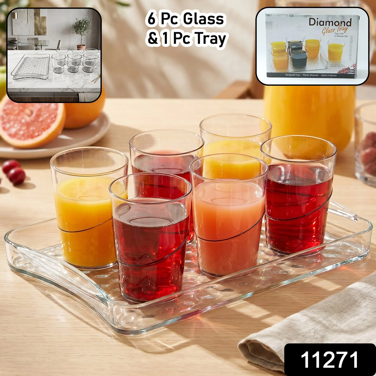 juice serving set, beverage serving tray, drink serving set, glass serving set, serving tray with glasses, water serving set, refreshment serving set,home serving, guest serving, dining table use, kitchen serving, party serving, juice serving, breakfast serving, hospitality use,glass tray set, serving tray with glass set, juice glass set with tray, drinkware set with tray, transparent serving tray set, glass serving platter with cups, beverage tray set
