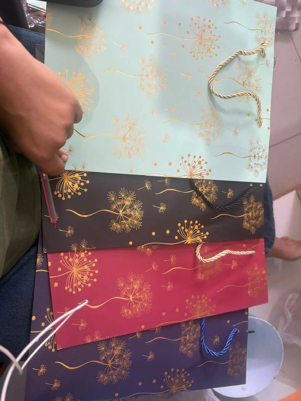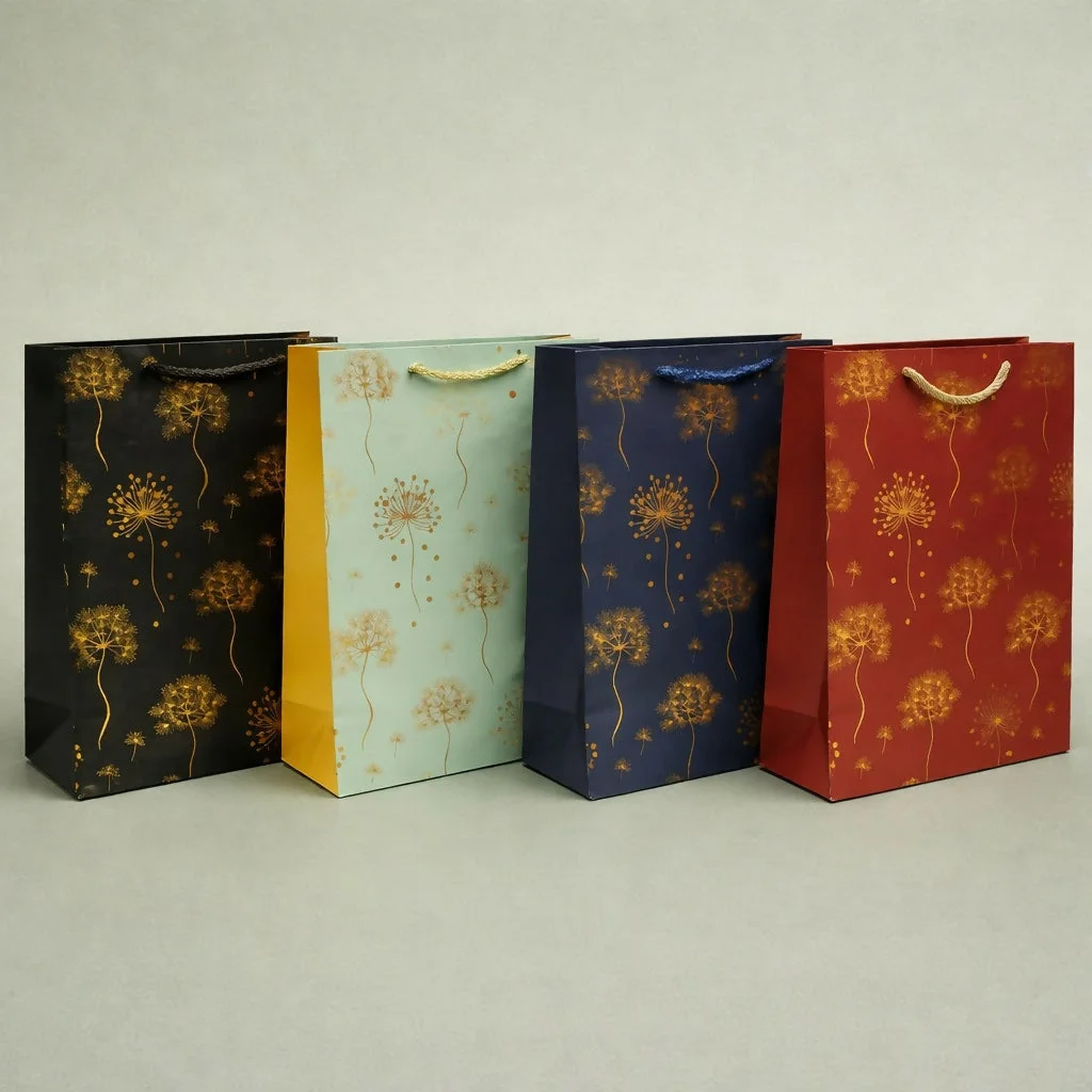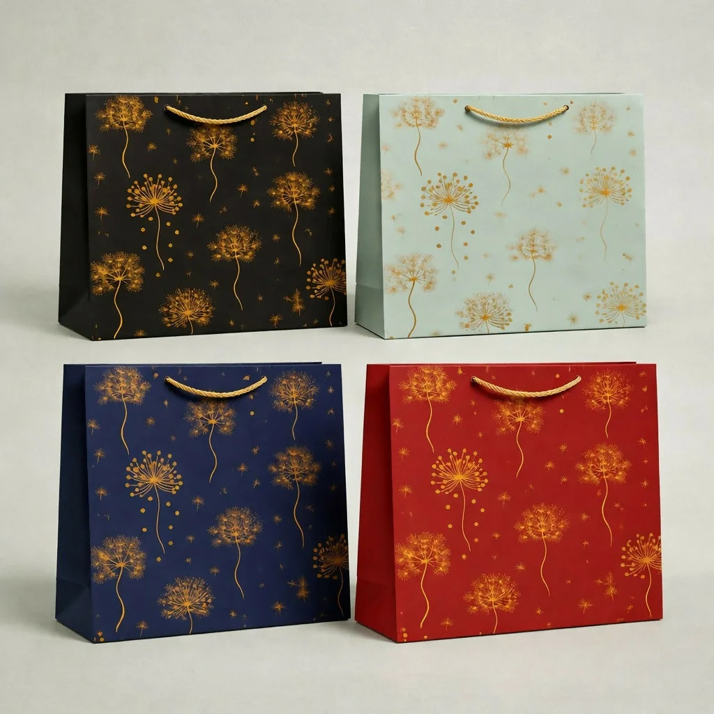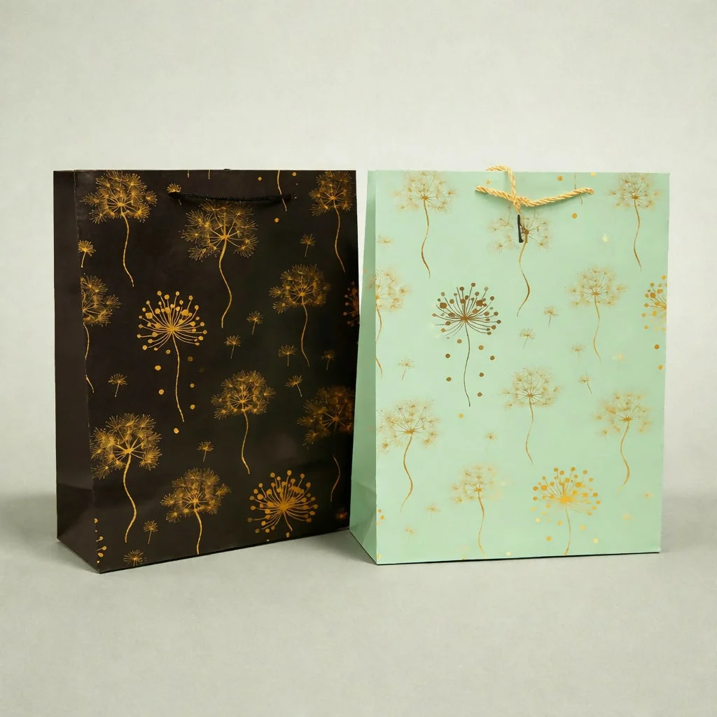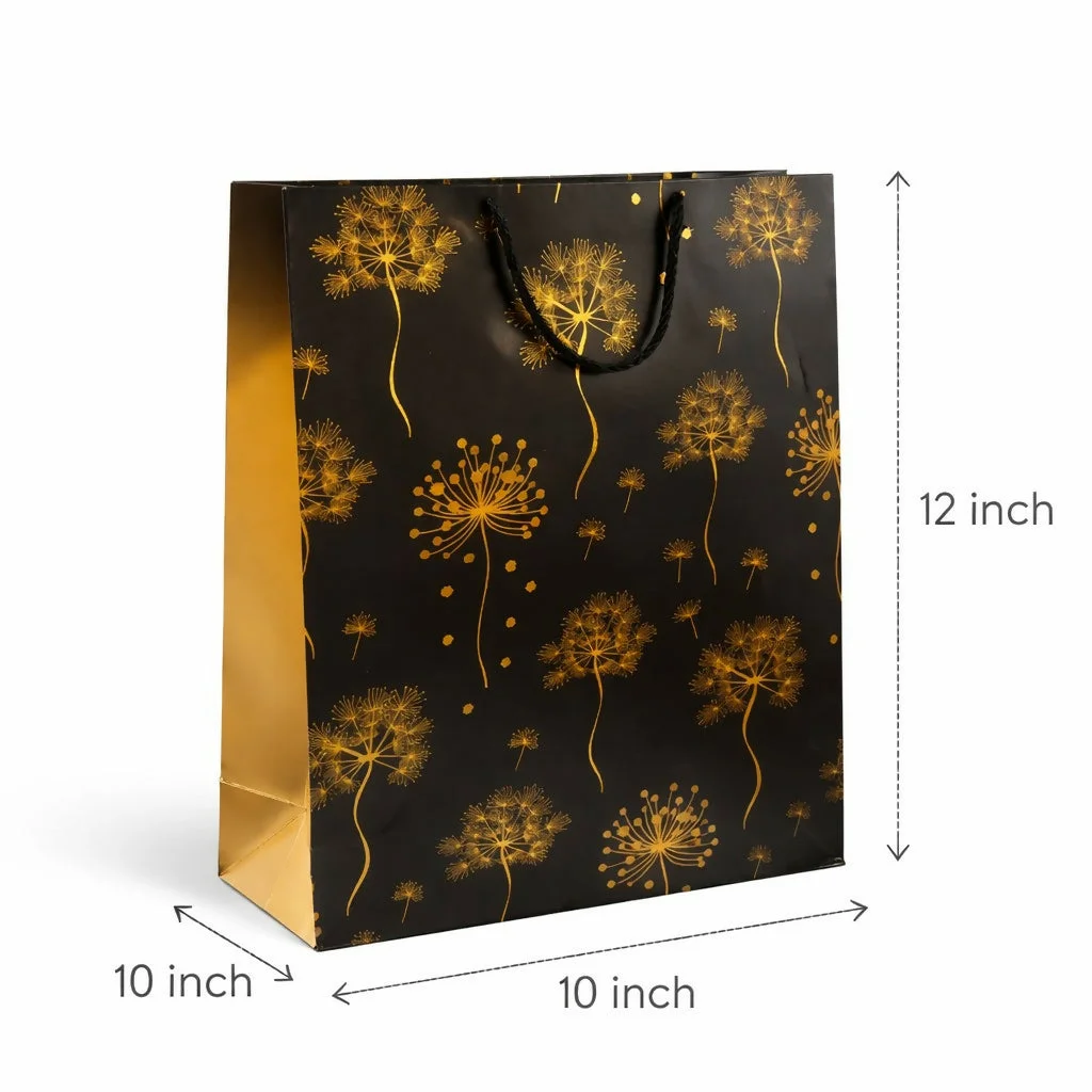Add a touch of elegance to your gifting with this premium floral design paper gift bag featuring beautiful gold dandelion-style patterns. Designed with a smooth finish and strong rope handles, it offers both style and durability. Its spacious structure makes it perfect for packing a variety of gifts, making it ideal for birthdays, weddings, festive occasions, and return gifts.