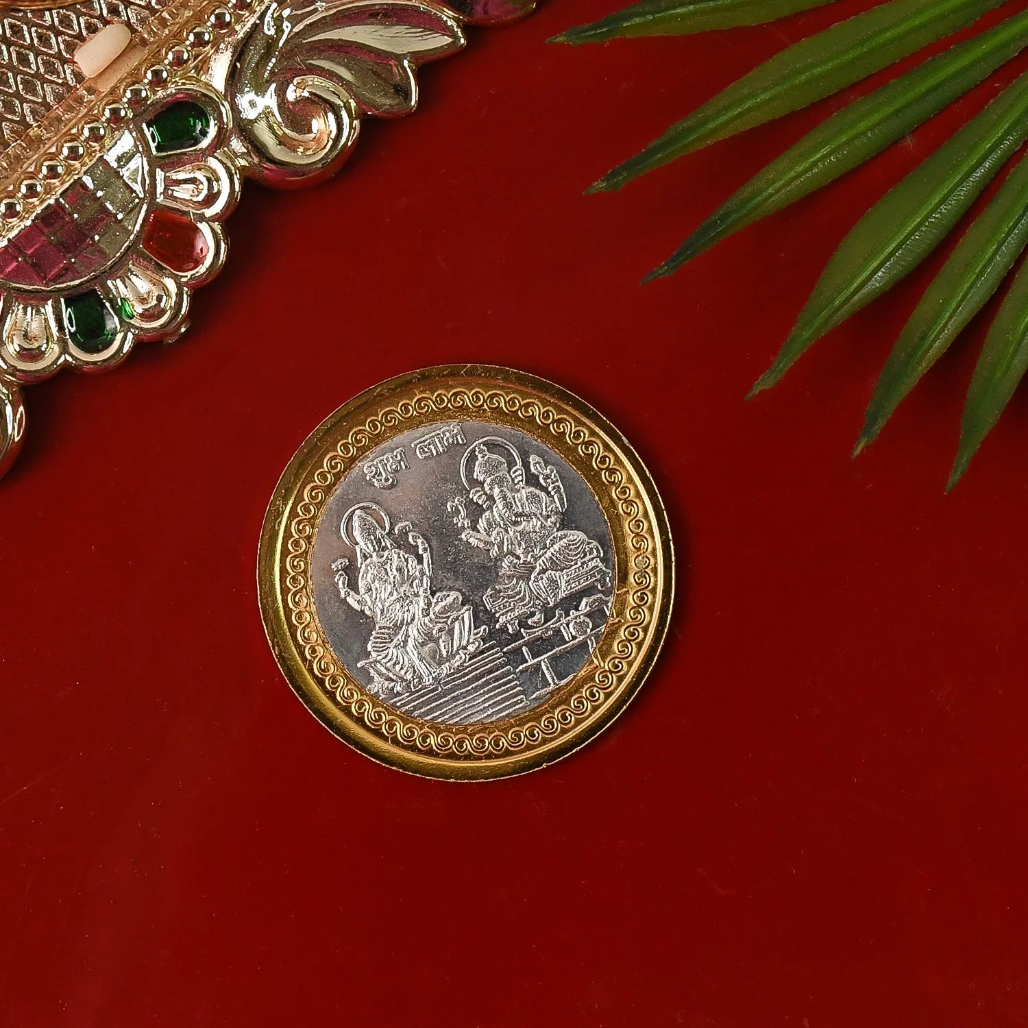 decorative coin, religious coin, puja coin, symbolic coin, spiritual coin,Diwali pooja, Lakshmi puja,home mandir accessory, religious gifting,gold-silver coin, embossed pooja coin,Hindu ritual coin