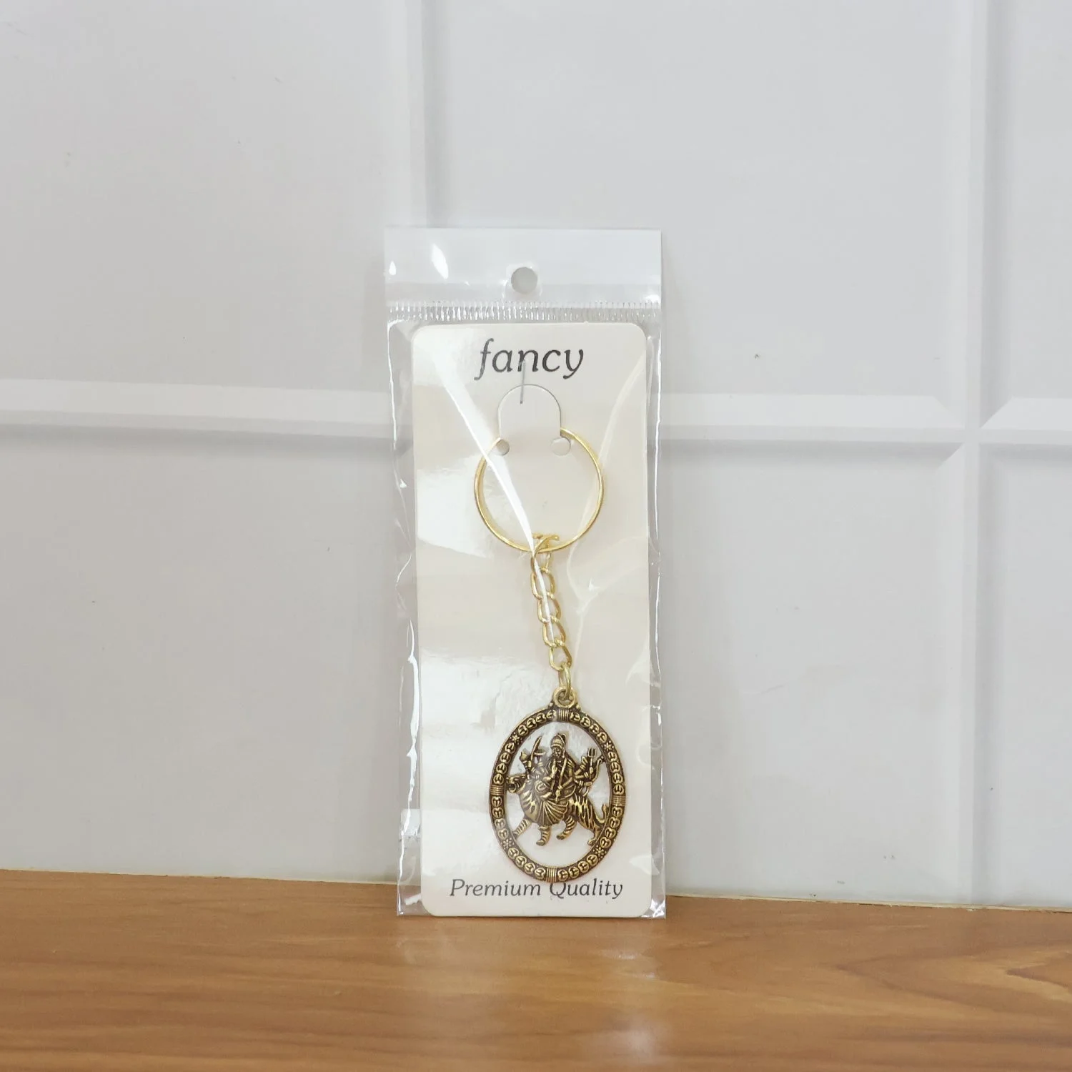This beautifully crafted premium metal keychain features a detailed depiction of Goddess Durga seated majestically on her lion, symbolizing strength, protection, and divine energy. The charm is encased within an intricately designed oval frame with traditional patterns, giving it a rich and artistic appearance. The golden finish enhances its divine aura while maintaining durability for daily use. Equipped with a strong keyring and sturdy chain, this keychain is perfect for securing car keys, bike keys, home keys, or office keys. Ideal as a devotional accessory or a meaningful gift, it brings blessings, positivity, and elegance wherever it is carried.