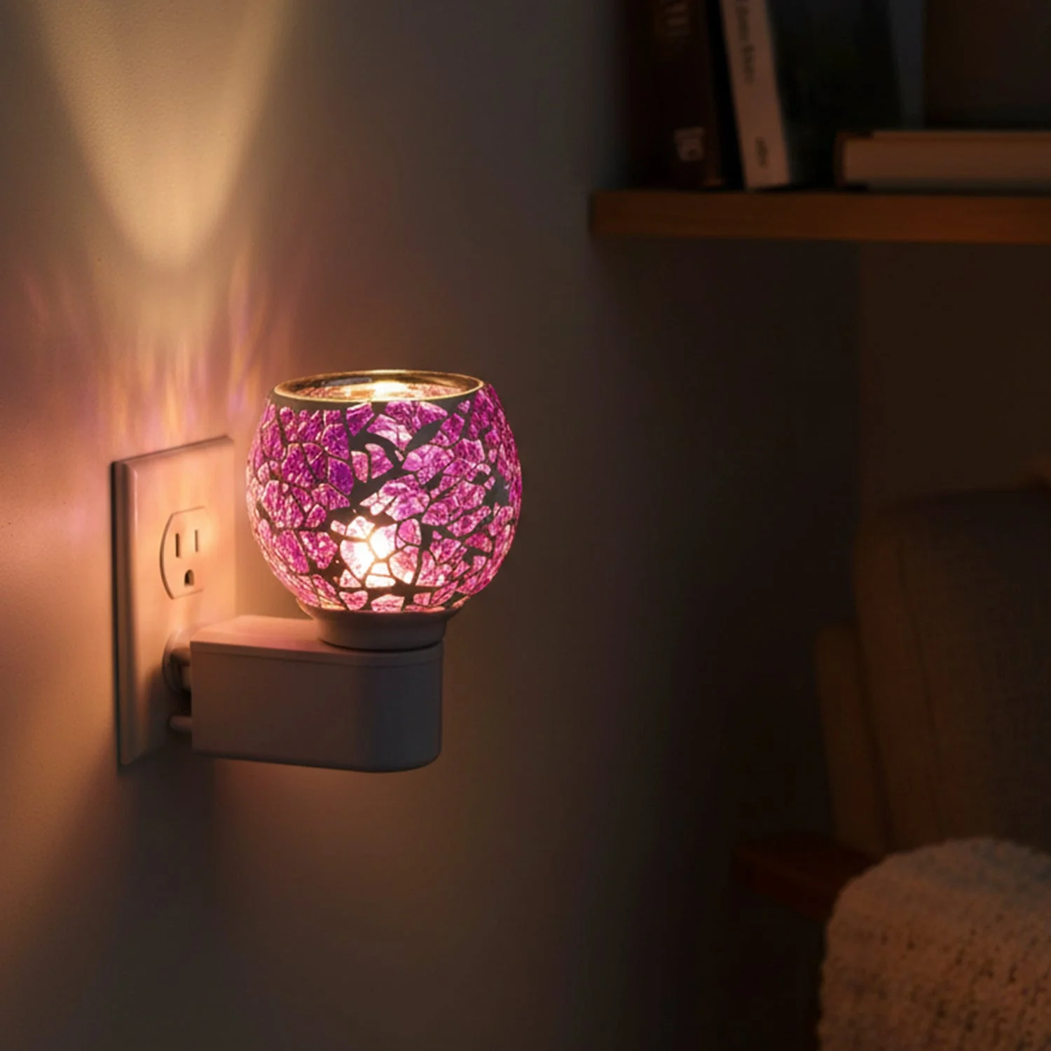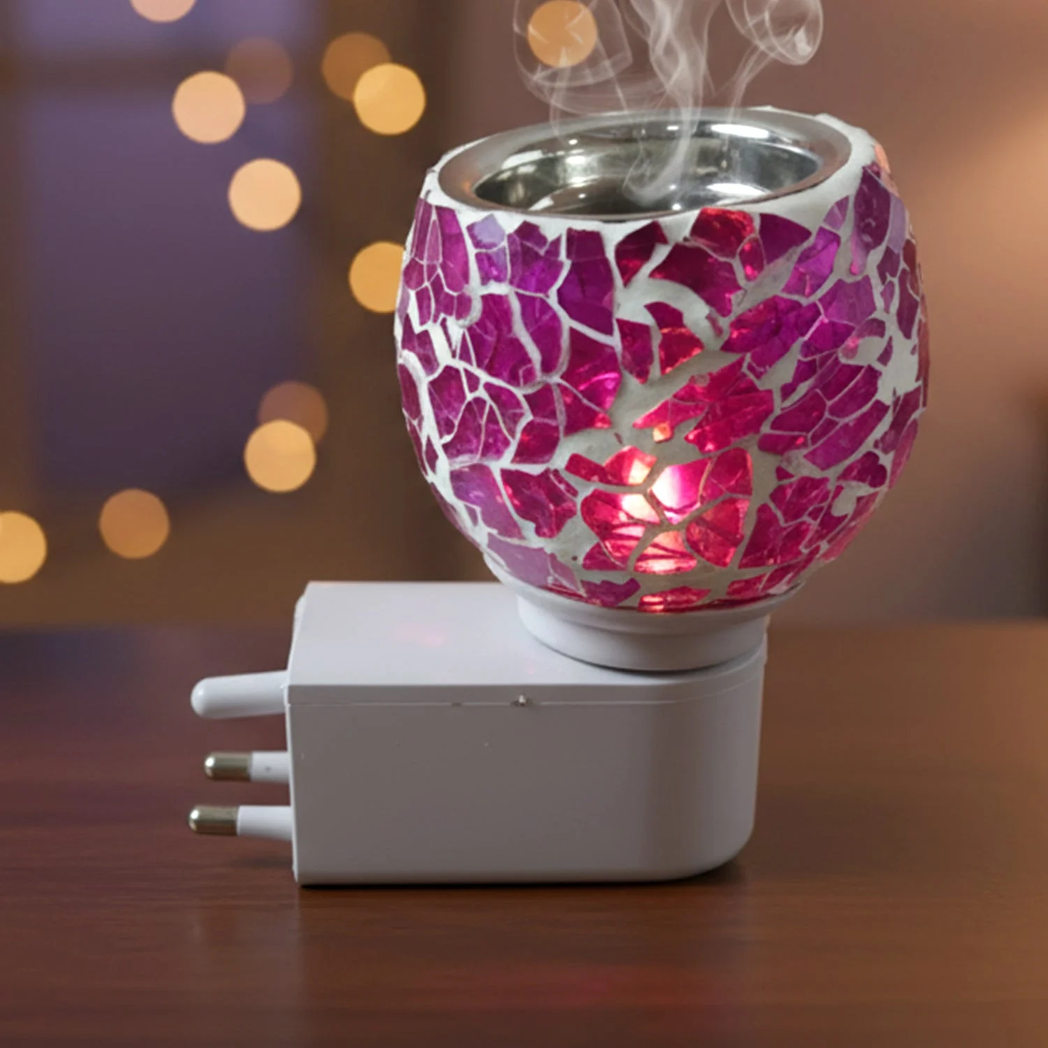 Bring a beautiful glow and calming fragrance into your space with this plug-in mosaic glass aroma diffuser night lamp. Designed with a stunning purple crackle mosaic globe, this decorative diffuser creates a warm, soothing ambience while gently spreading fragrance through the air.