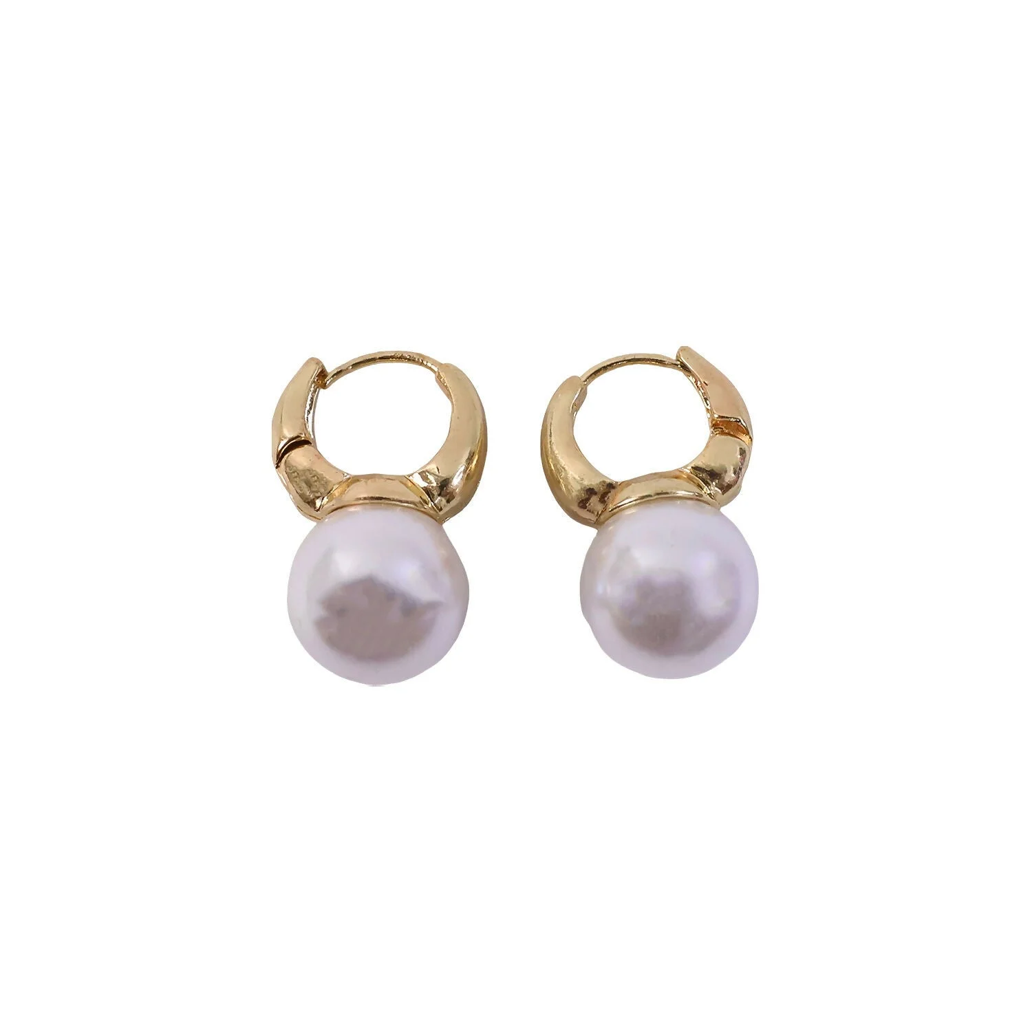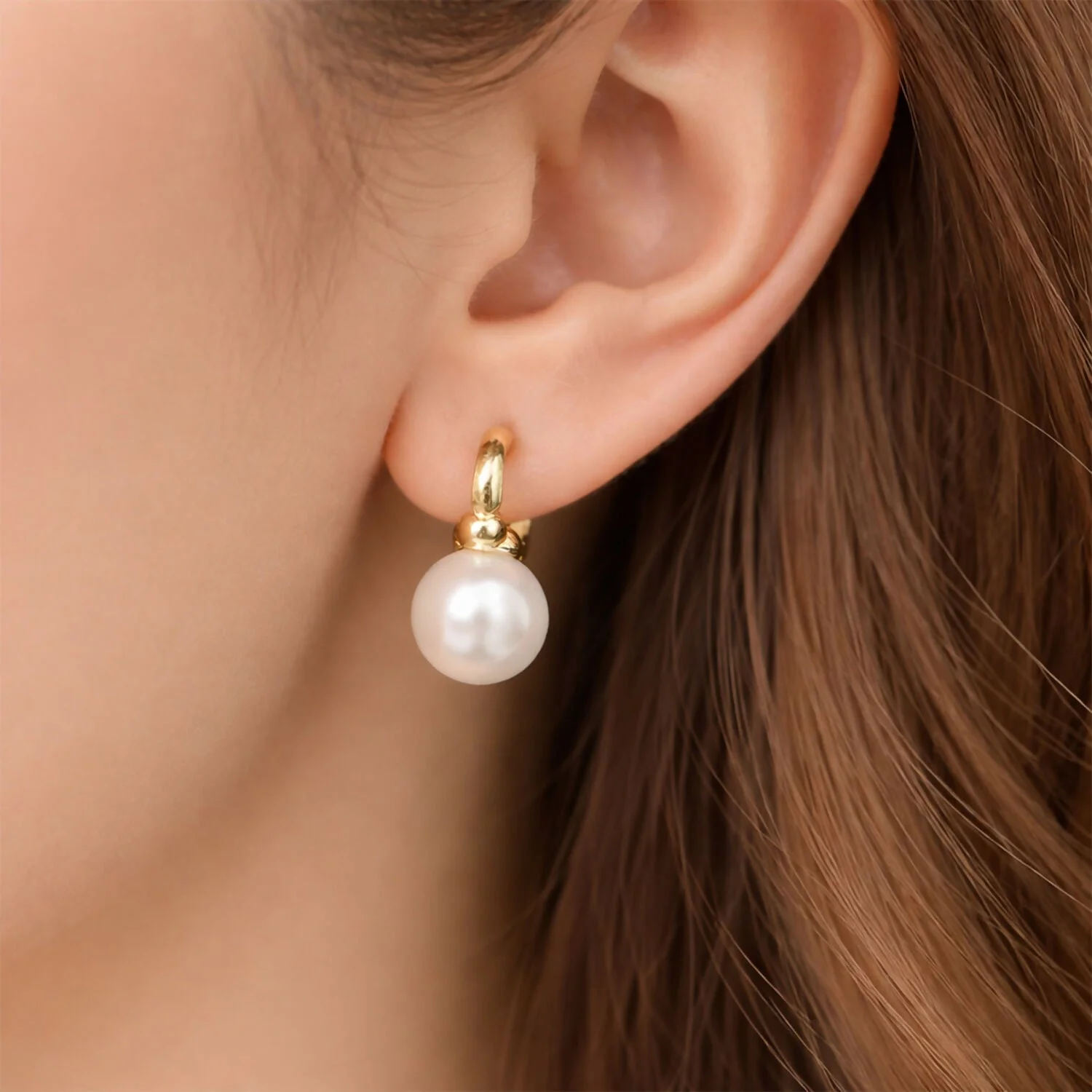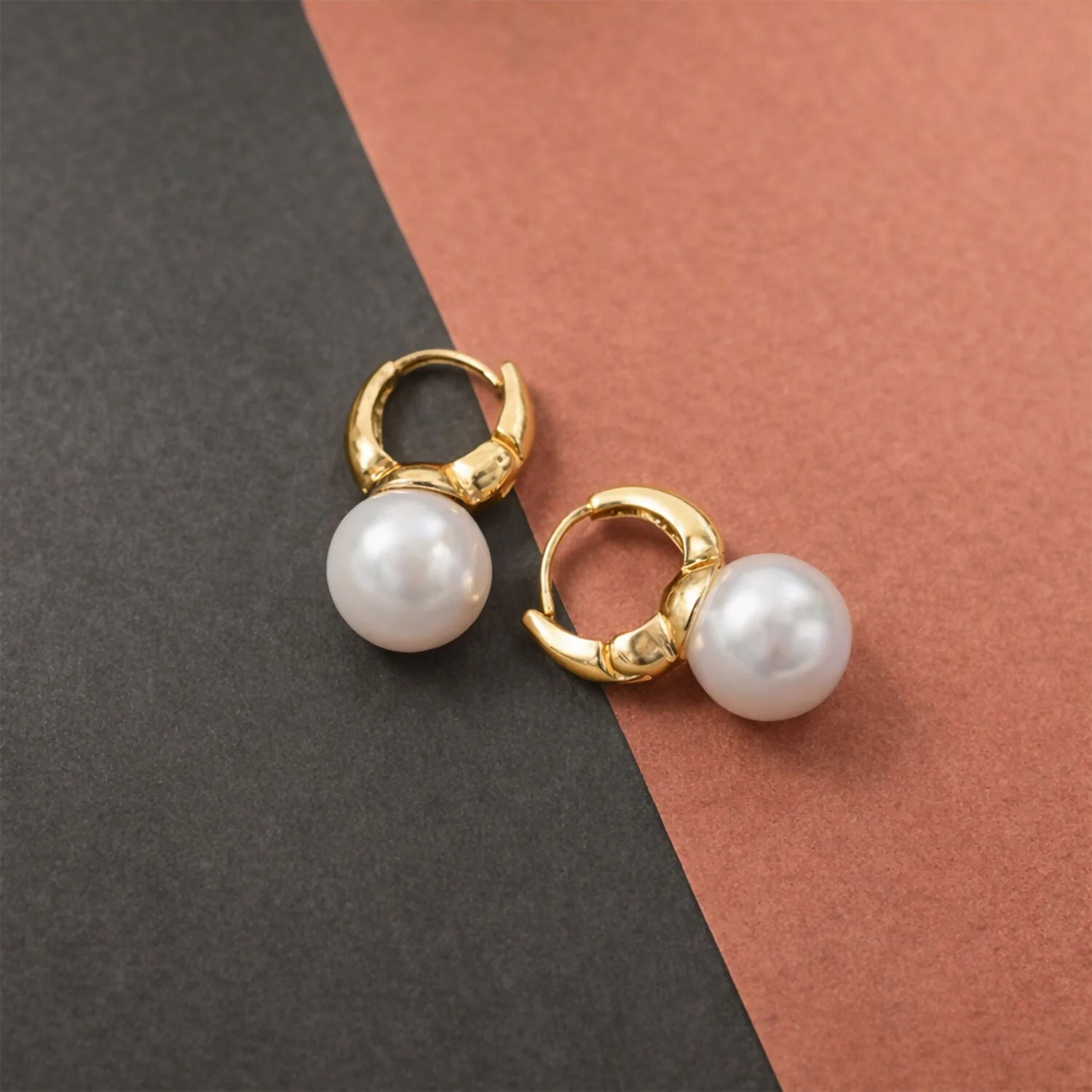 Design: These earrings feature a high-luster, oversized pearl with a delicate pinkish-blush tint, suspended from a thick, polished gold-plated huggie hoop. The secure latch-back design ensures both style and comfort.