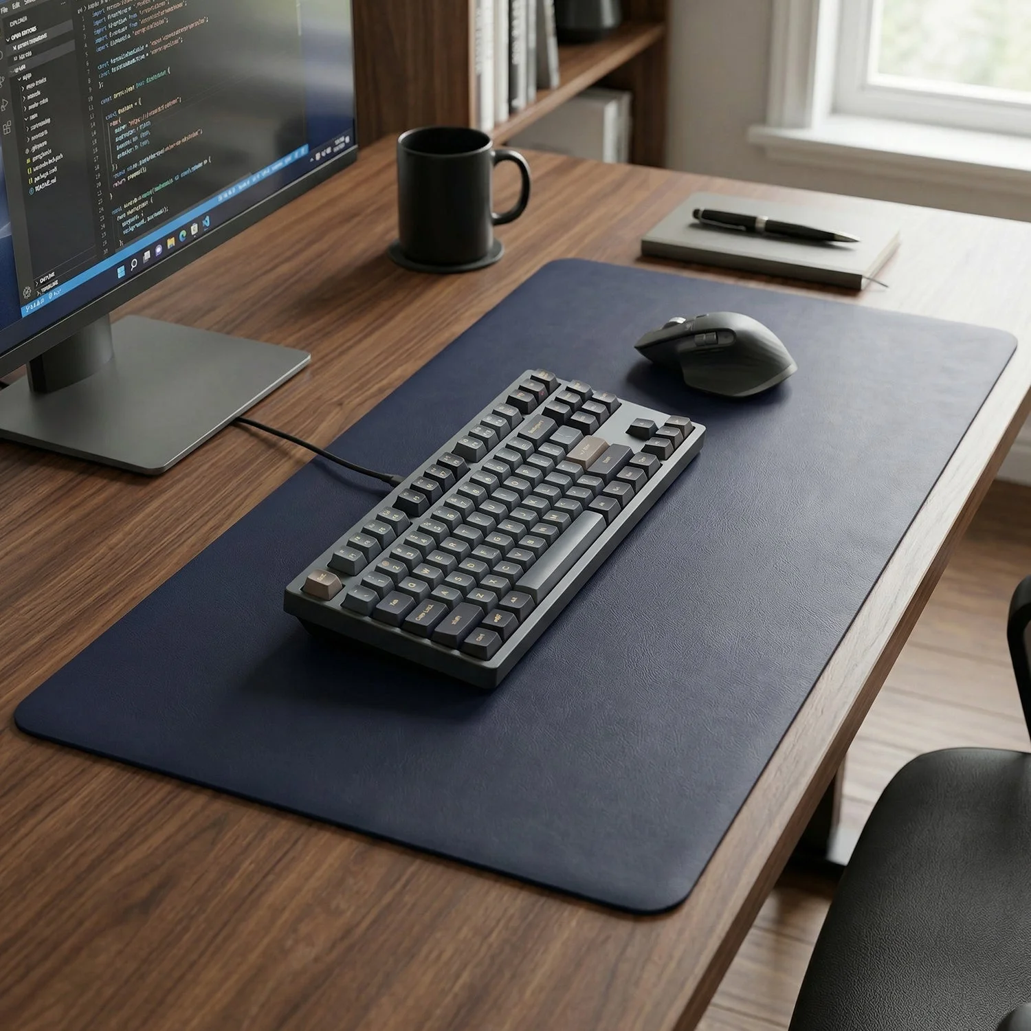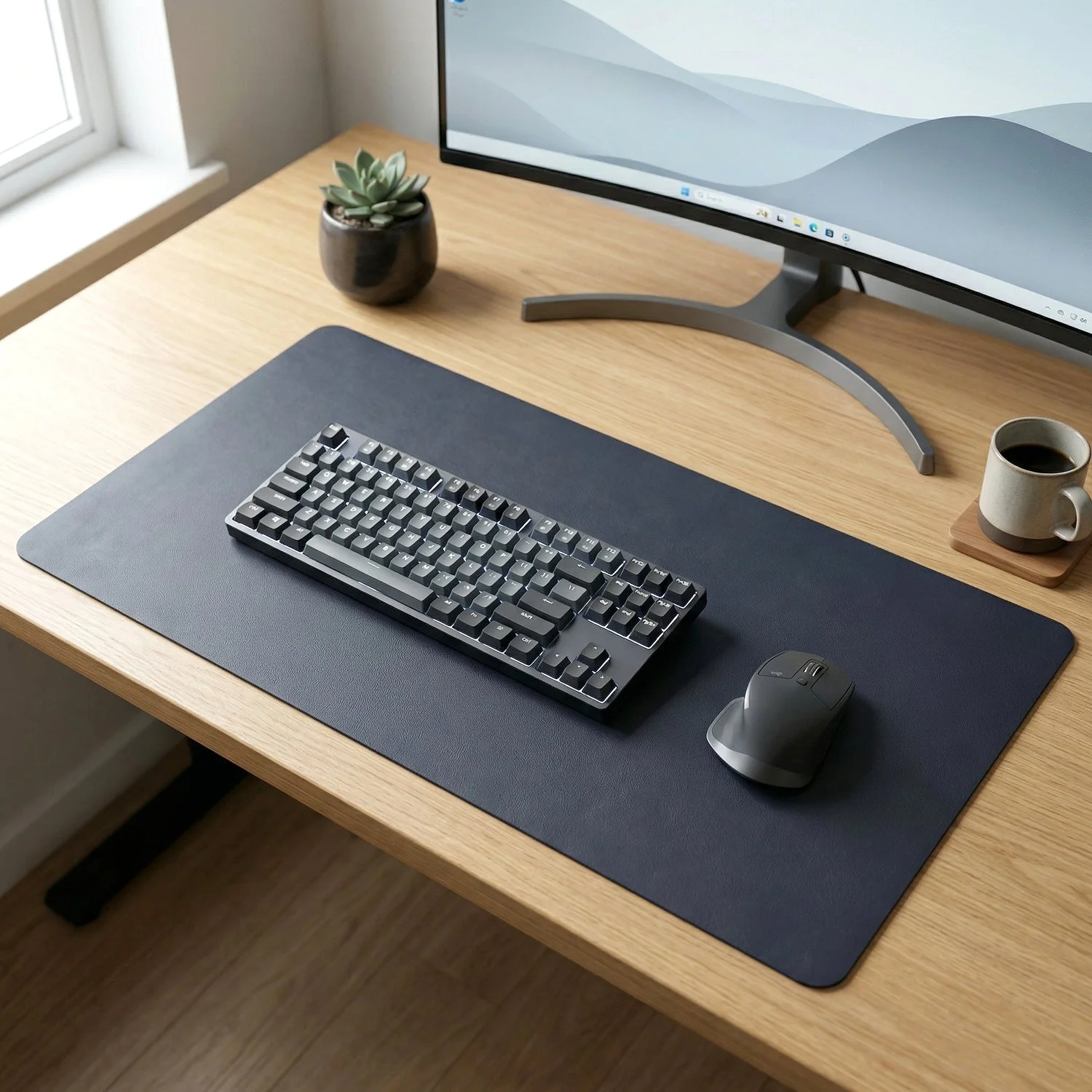 Upgrade your workspace with this premium large desk mat designed for comfort, protection, and enhanced productivity. With its extended surface area, it easily accommodates your keyboard, mouse, and other desk essentials, creating a clean and organized setup. The smooth surface ensures precise mouse control, making it ideal for both work and gaming. Its anti-slip base keeps the mat firmly in place, while the durable design protects your desk from scratches, spills, and daily wear. Perfect for modern workstations, this desk mat combines functionality with a sleek, professional look.