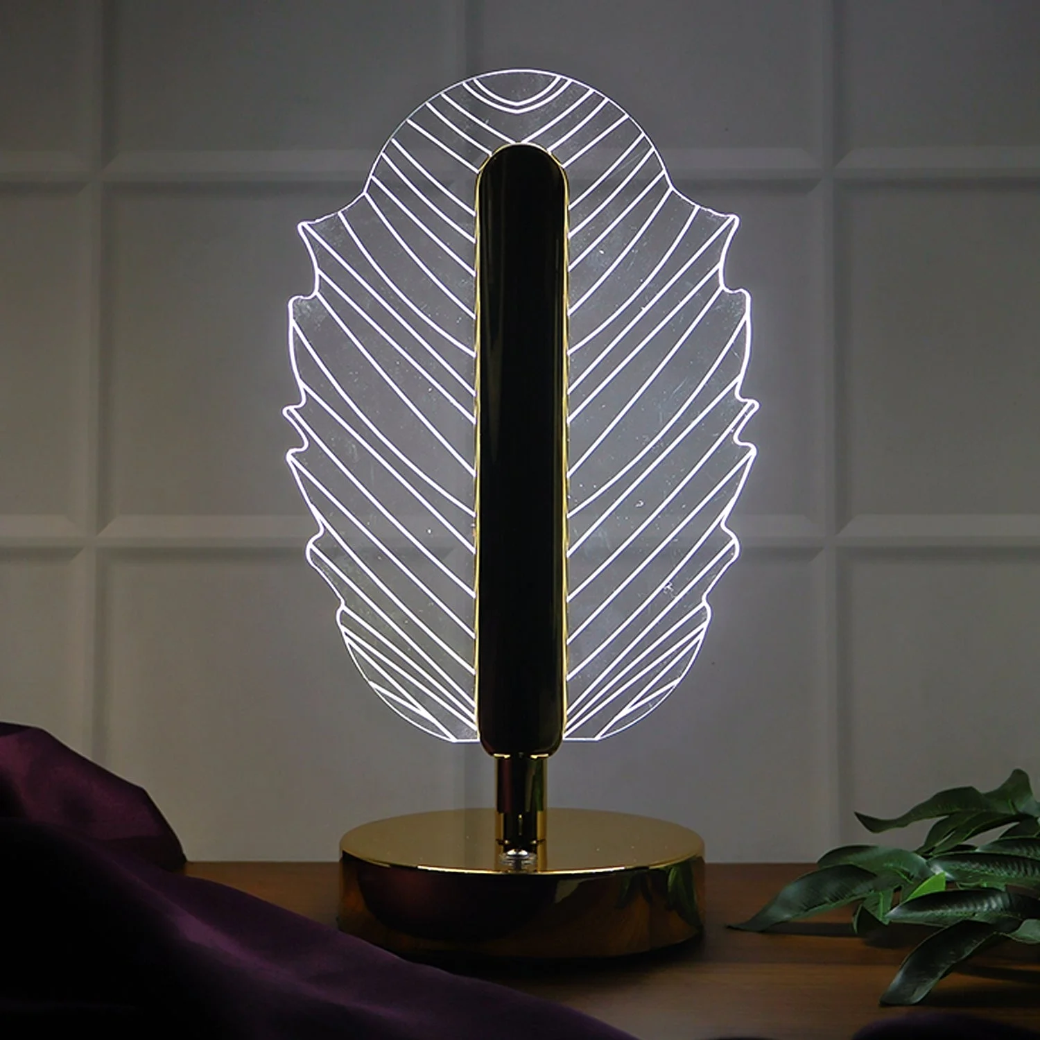 Illuminate your interiors with elegance using this Leaf Shape Crystal Table Lamp. Designed with a unique leaf-patterned crystal-cut acrylic shade mounted on a sturdy metallic base, this lamp brings a sophisticated charm to any room. The built-in LED provides warm ambient lighting, creating a cozy and luxurious atmosphere. With convenient USB charging support, this lamp is both stylish and practical, making it a perfect décor accessory for modern homes, offices, hotels, and gifting purposes.