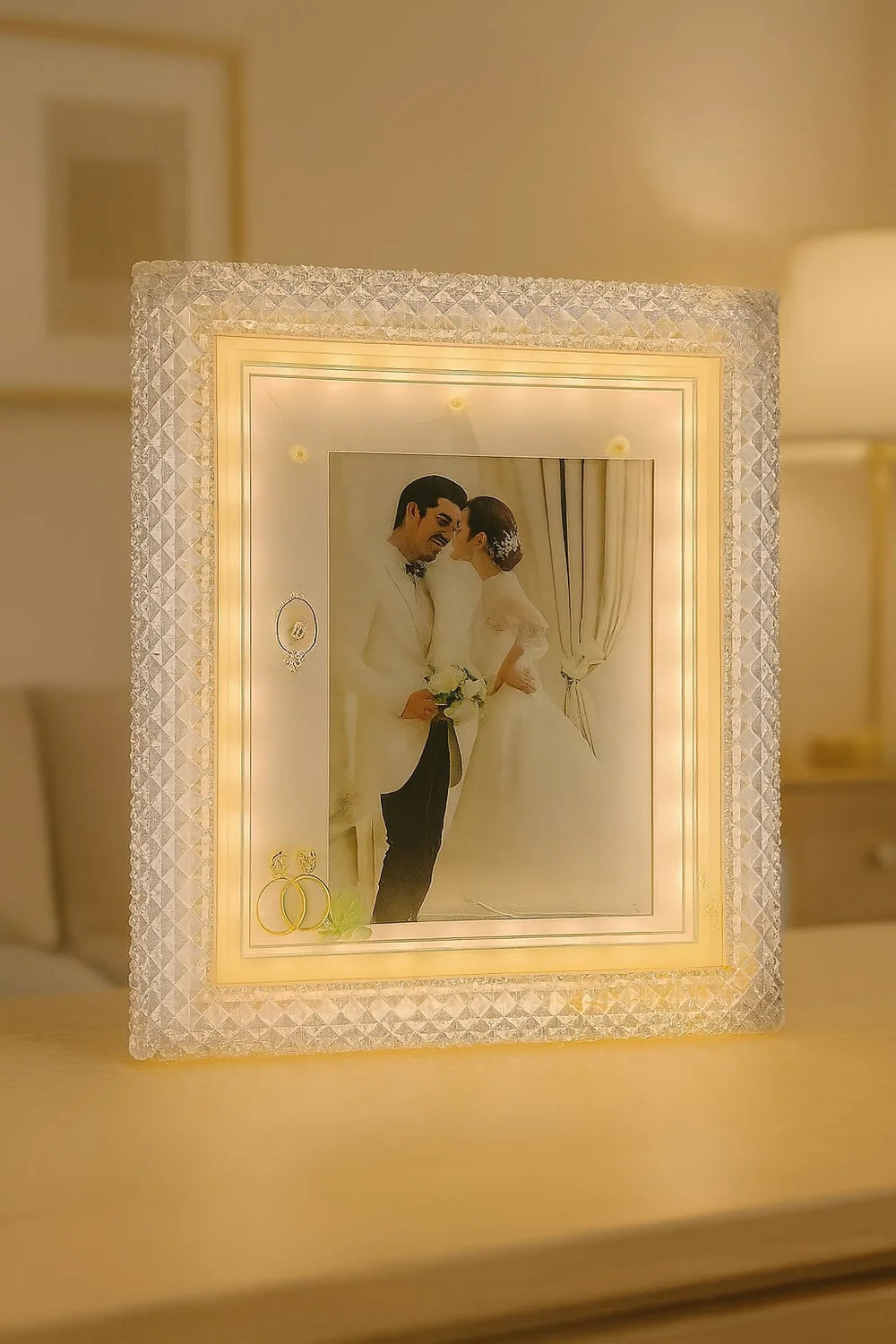LED wedding photo frame, crystal photo frame with lights, illuminated picture frame for couple, anniversary gift with LED lights, 3D wedding ring frame, romantic bedroom decor, glowing wedding frame, couple photo frame with LED, bridal gift frame, love photo display