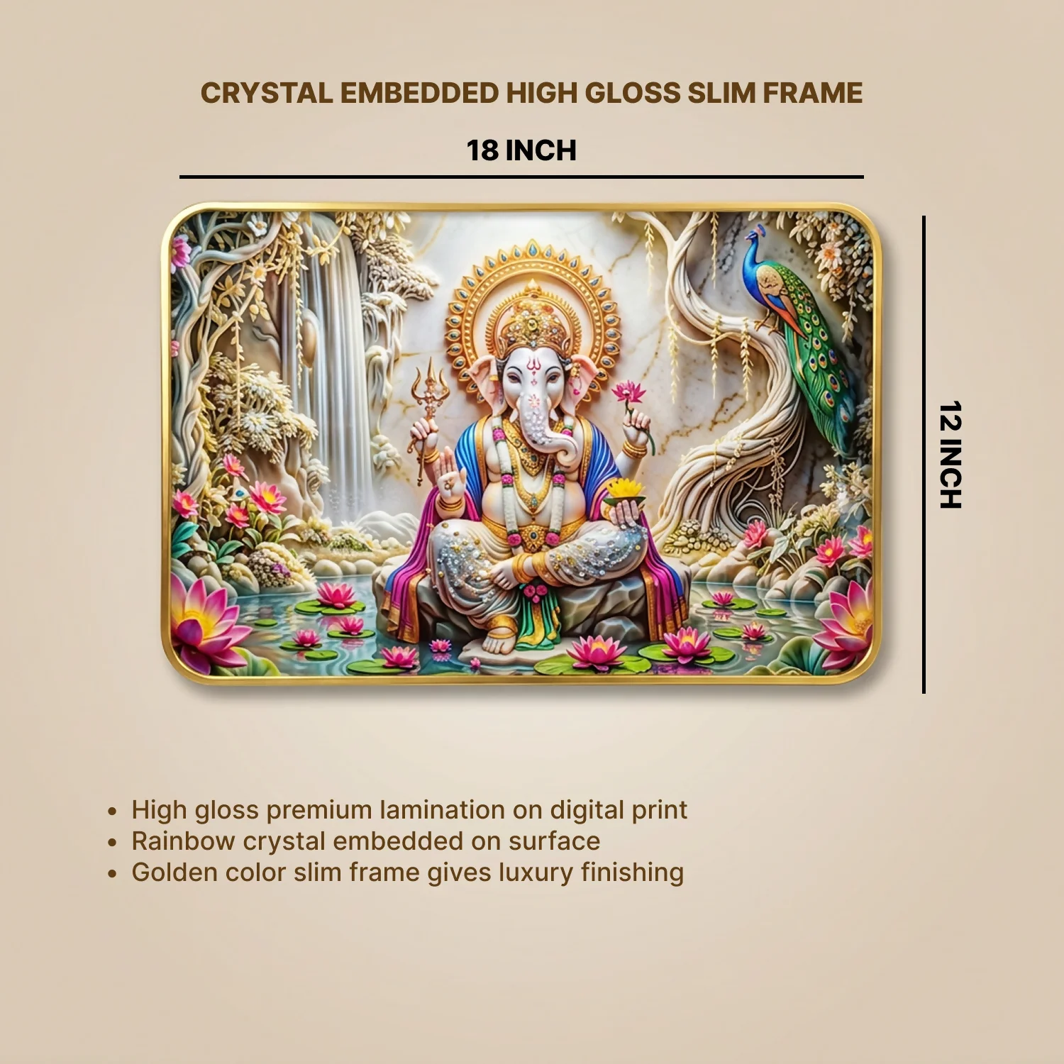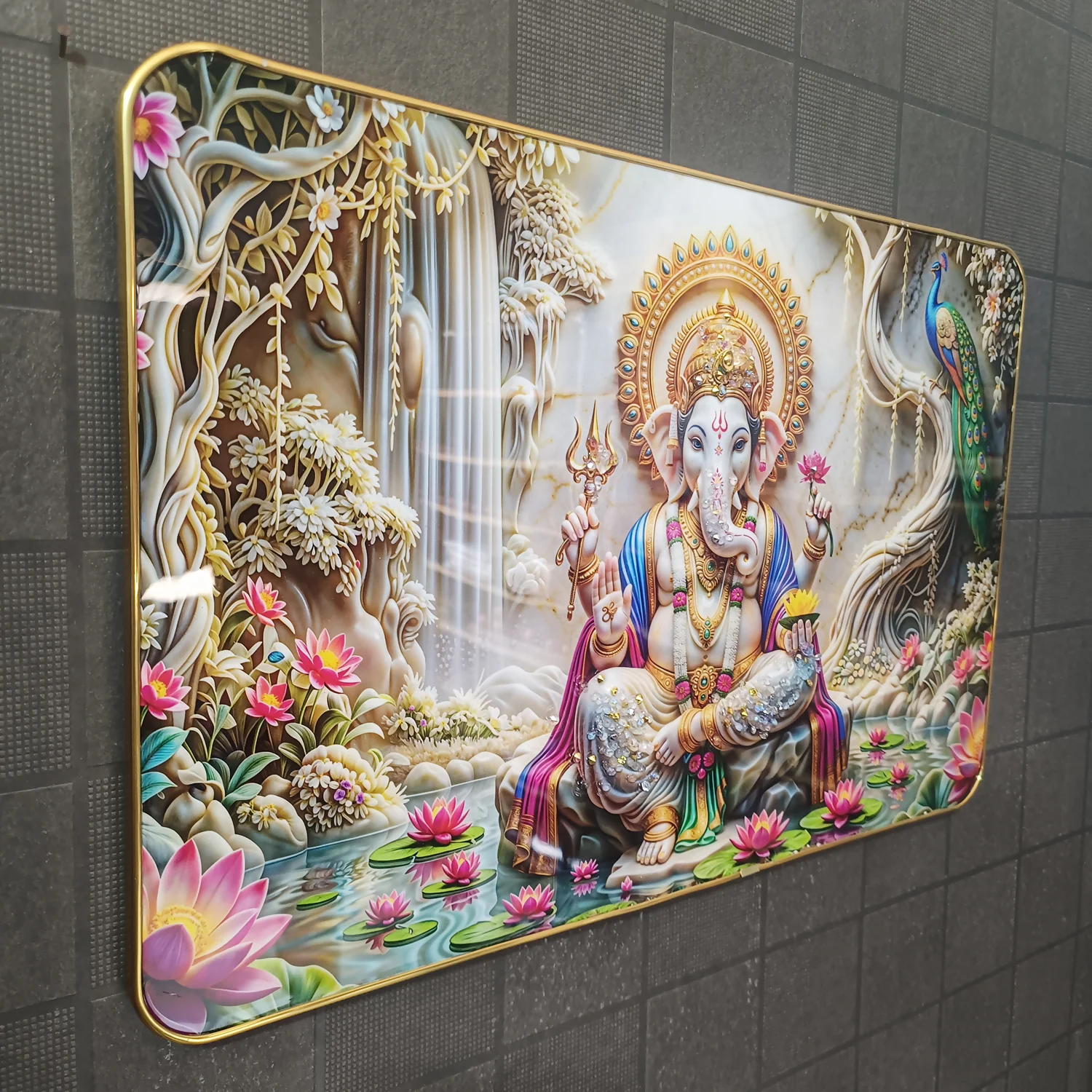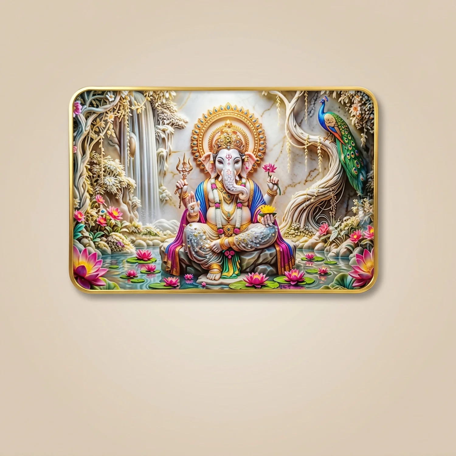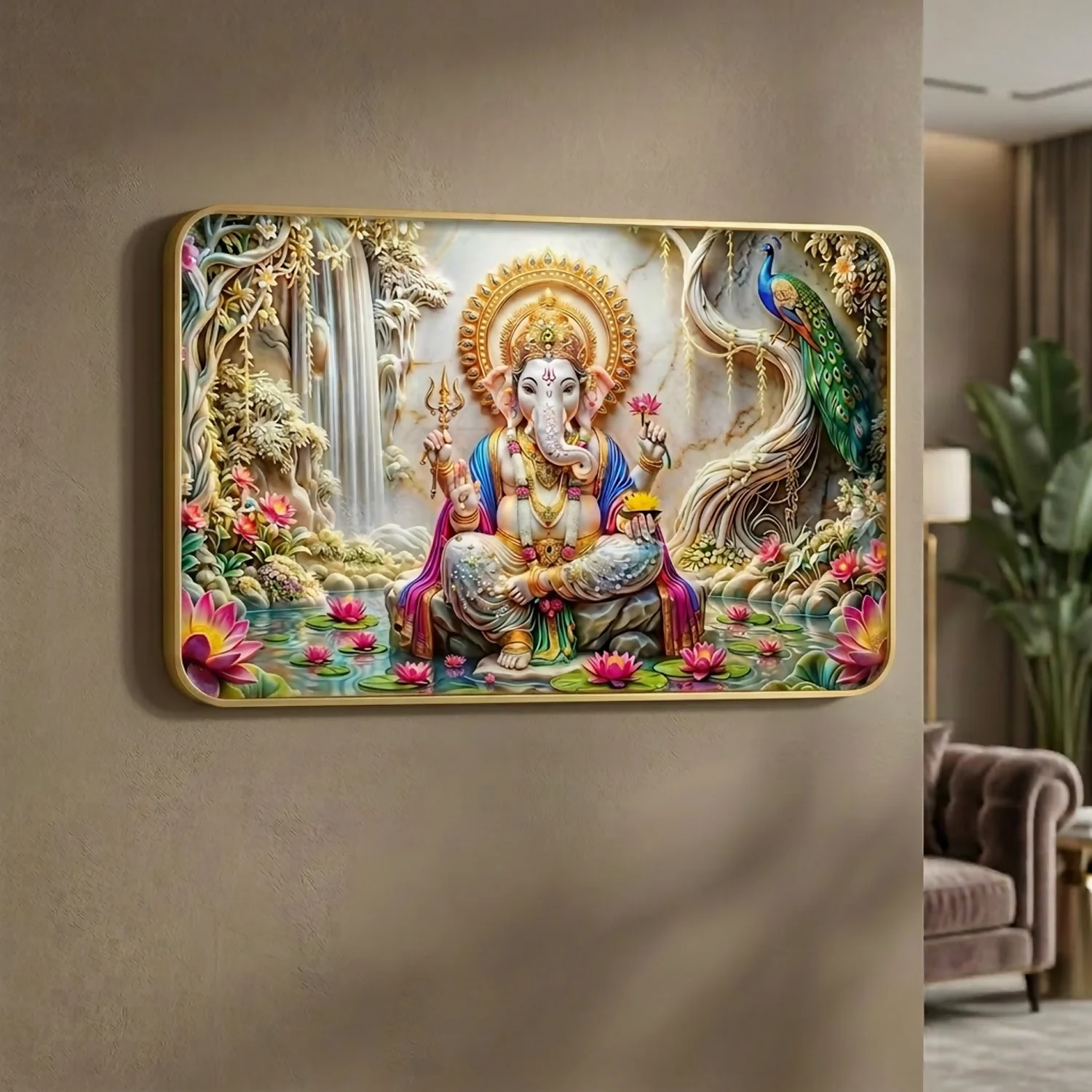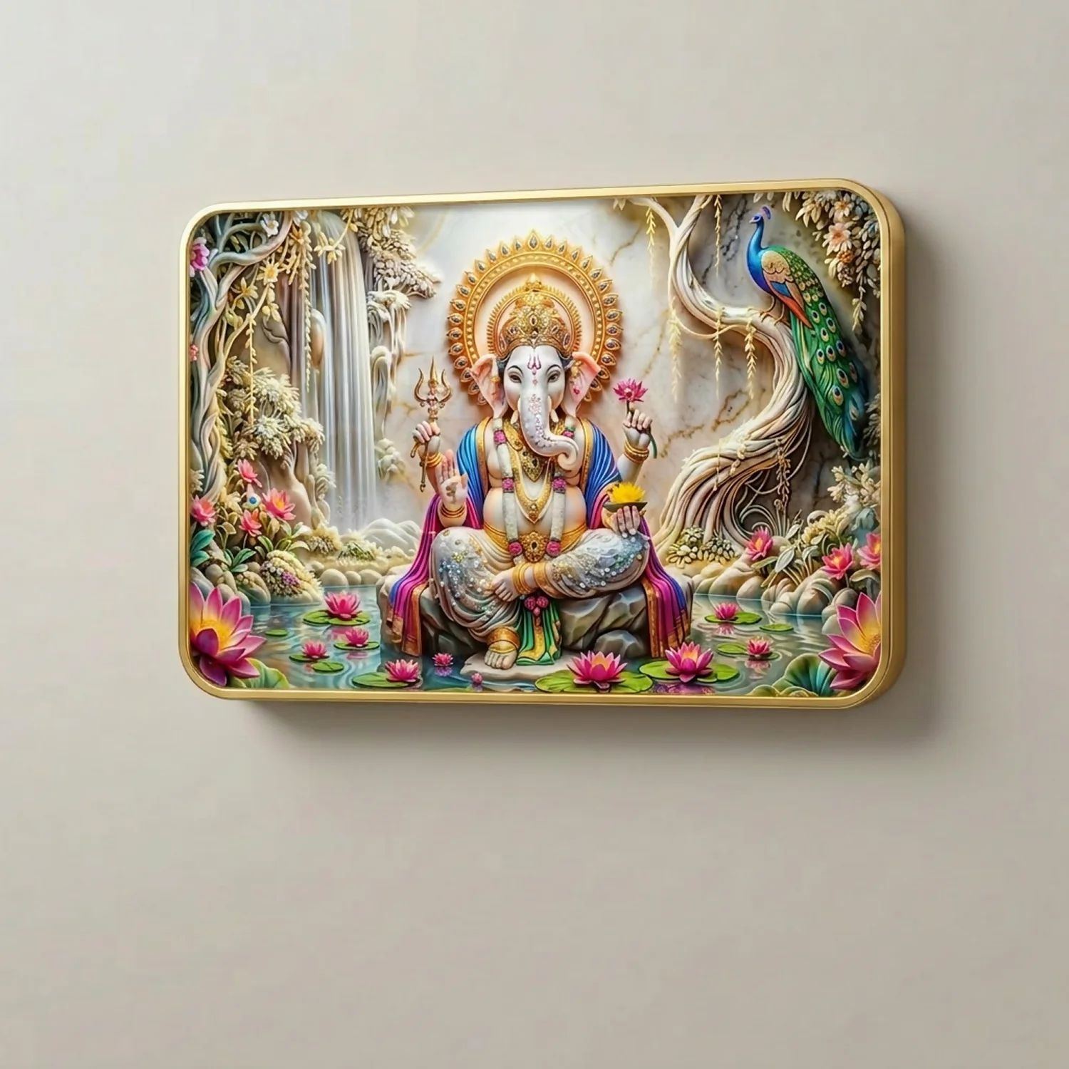 Invite blessings, prosperity, and positivity into your home with this Premium Lord Ganesha Wall Art Frame. Featuring a beautifully detailed depiction of Ganesh Ji seated amidst lotus flowers, waterfall scenery, and divine surroundings, this artwork creates a peaceful and luxurious spiritual ambiance.