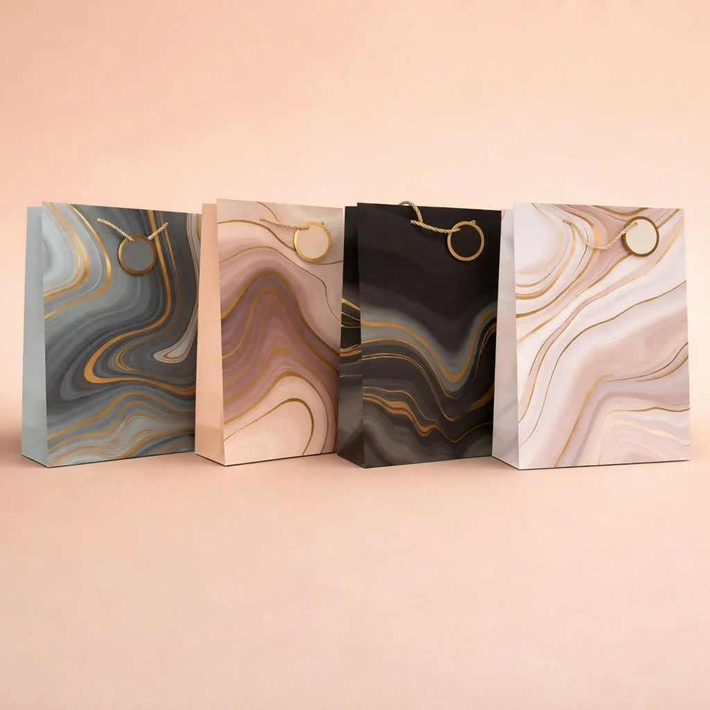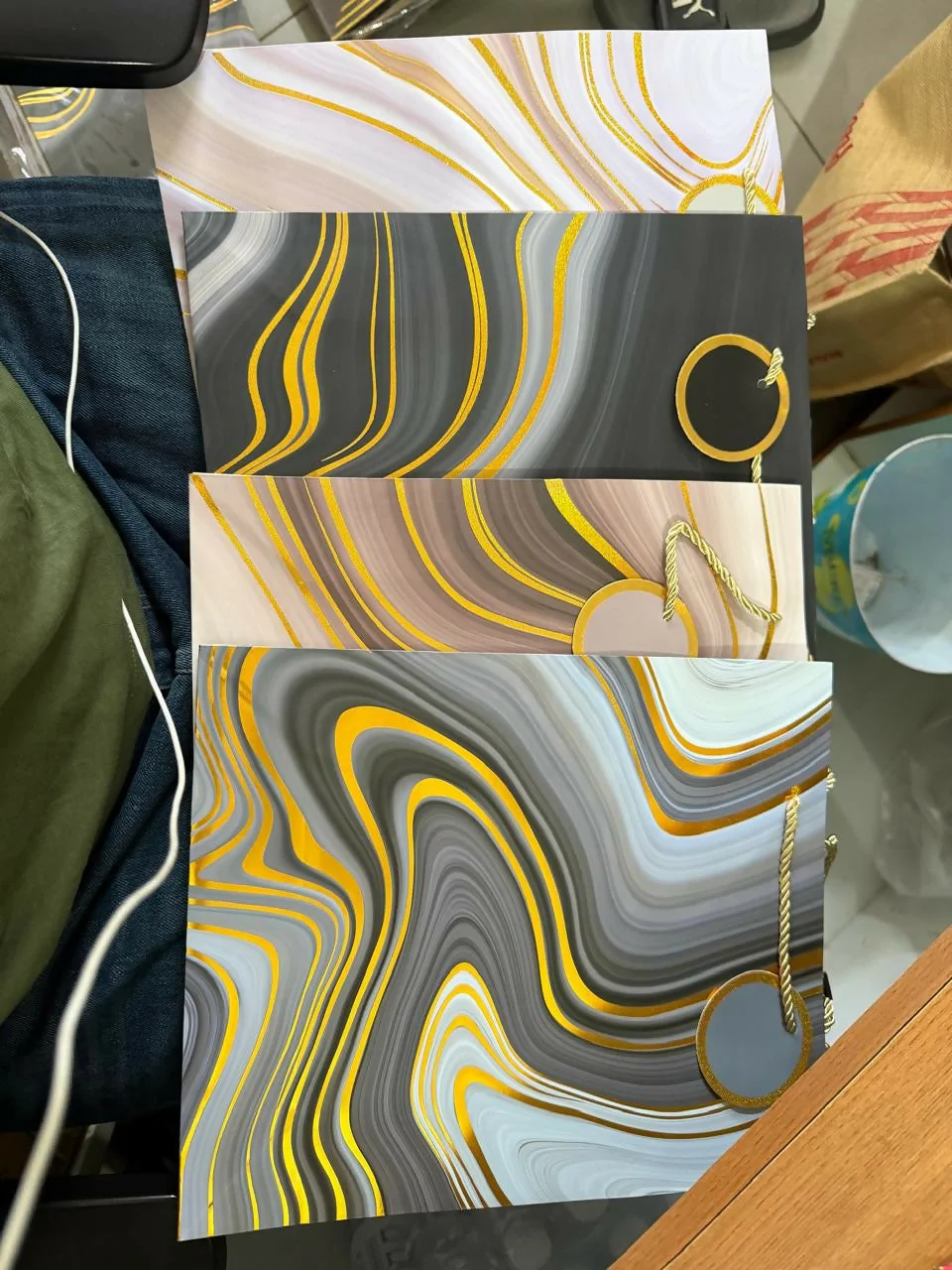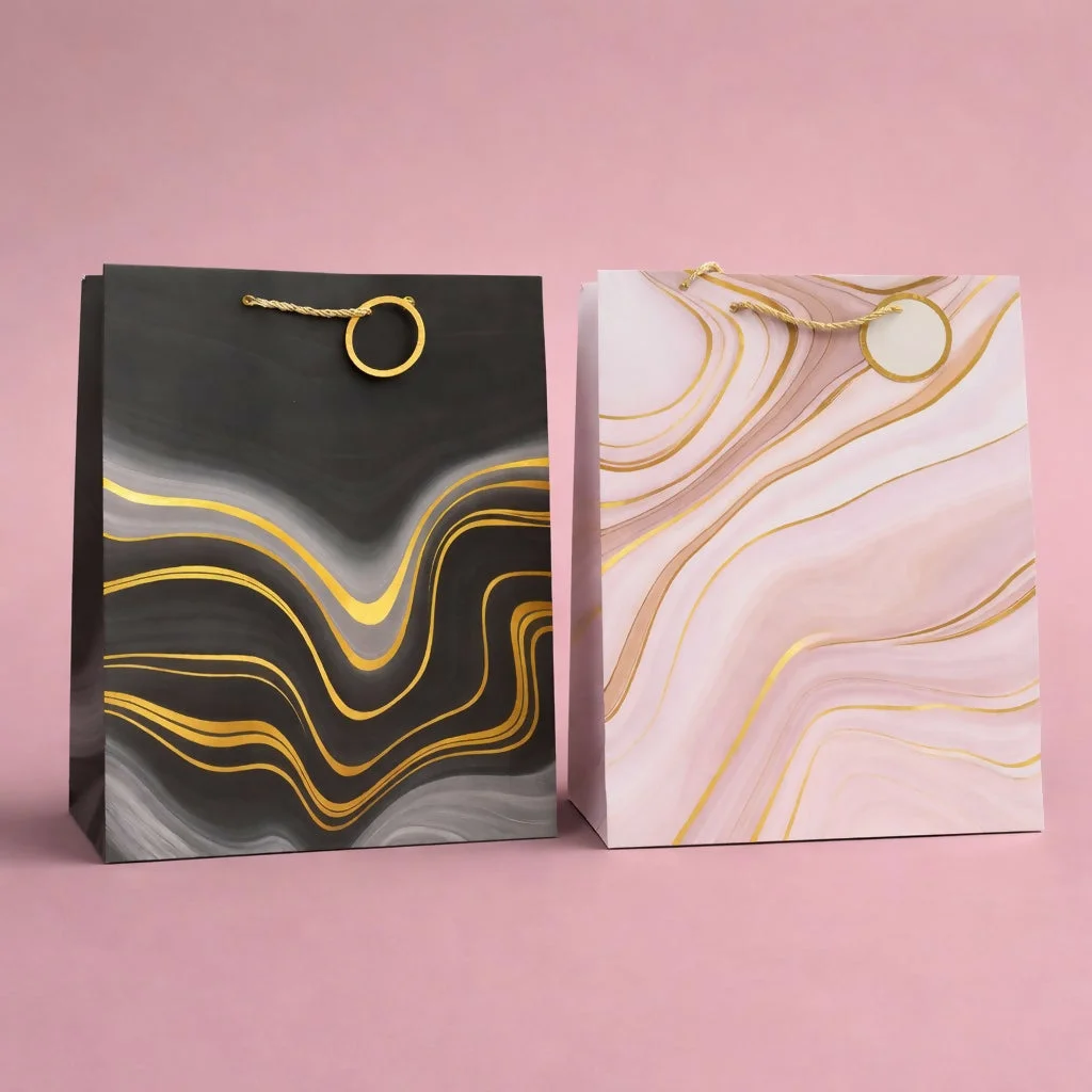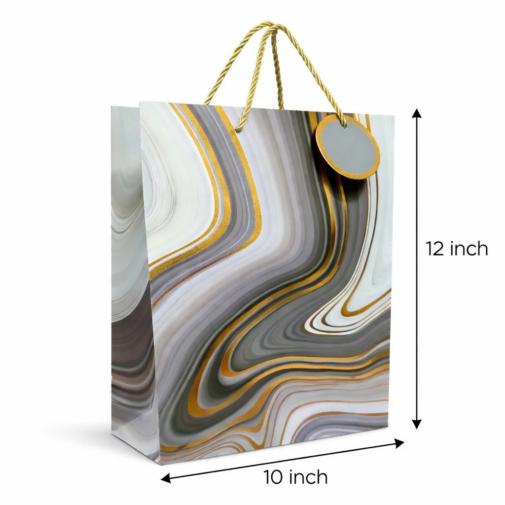 Elevate your gifting experience with this premium marble design paper gift bag, crafted to add elegance and sophistication to every occasion. Featuring a stylish swirl pattern with a glossy finish and strong rope handles, this bag is perfect for presenting gifts in a luxurious way. Ideal for birthdays, weddings, festive gifting, and return gifts, it combines durability with eye-catching design.