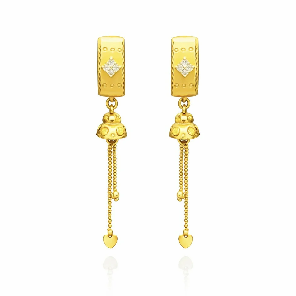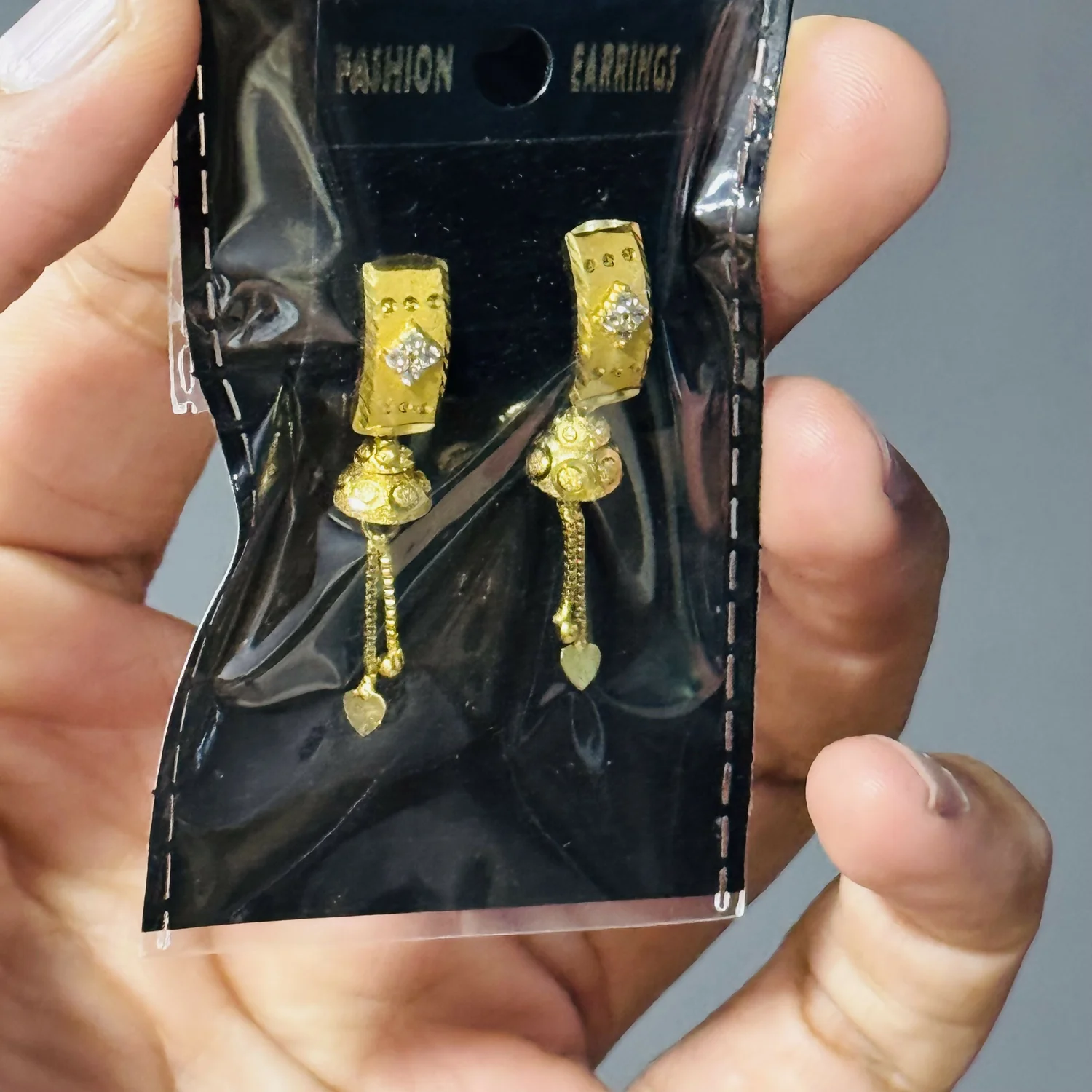 Gracefully designed with a classic appeal, these gold dangle earrings showcase a sleek teardrop-shaped top embellished with a shimmering stone that catches the light beautifully, complemented by finely detailed dangling elements that create soft movement and an elegant flow; crafted with a high-polish gold finish, they offer a rich and luxurious look while remaining lightweight and comfortable for all-day wear; the secure stud backing ensures a firm and easy fit, making them practical as well as stylish; perfect for enhancing both traditional and contemporary outfits, these earrings are ideal for festive celebrations, special occasions, or adding a touch of sophistication to everyday looks, making them a versatile and timeless addition to any jewelry collection.