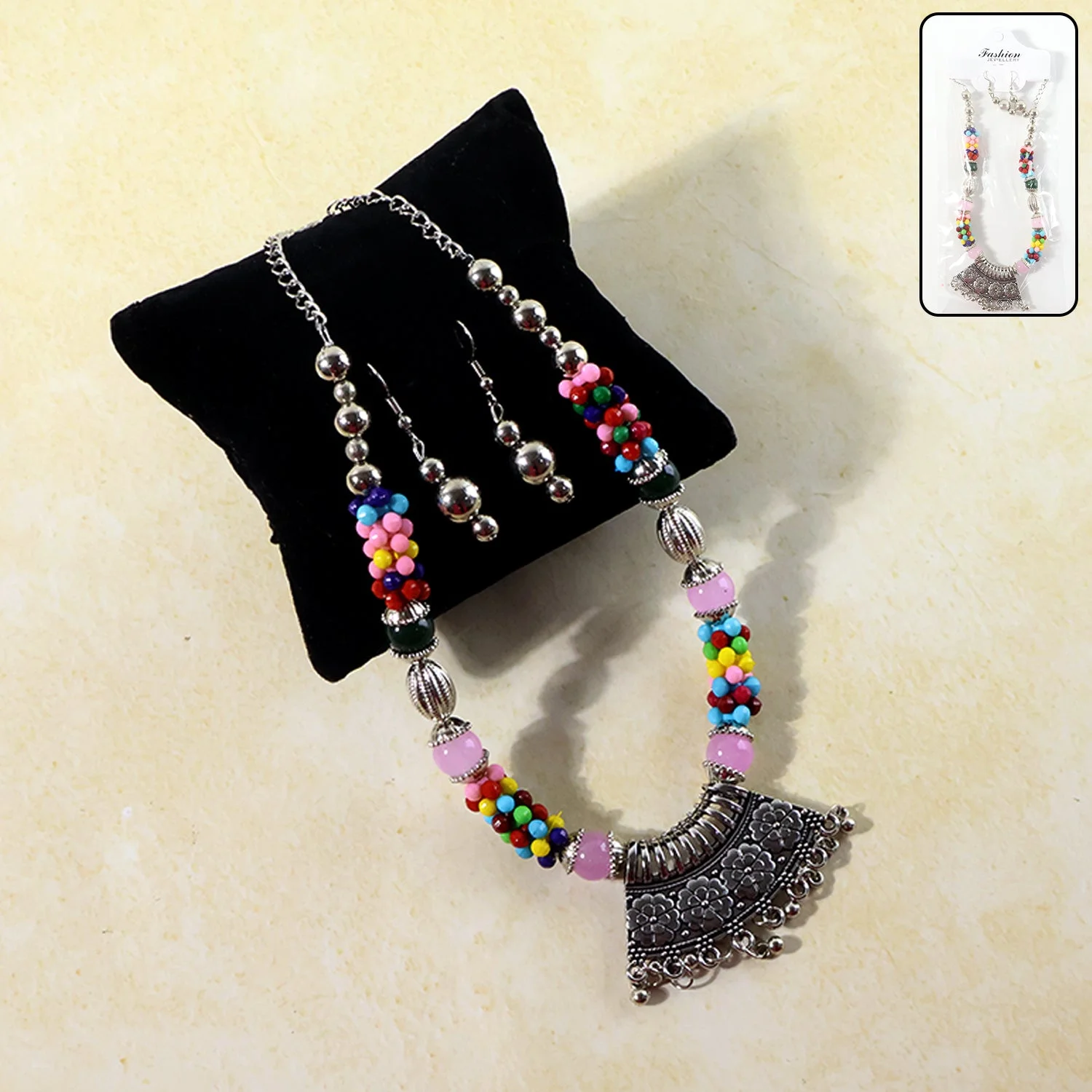 Premium Multicolor Beaded Oxidised Necklace Set with Matching Earrings – Traditional Statement Pendant Jewellery for Women, Featuring Colorful Handcrafted Beads, Antique Silver-Tone Metal & Elegant Ethnic Design for Festive Wear, Parties, Functions & Daily Styling (1 Pc Set)