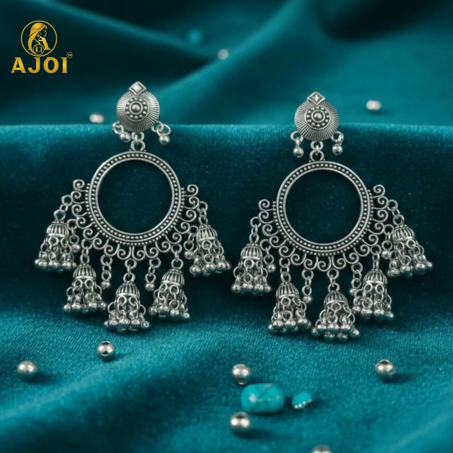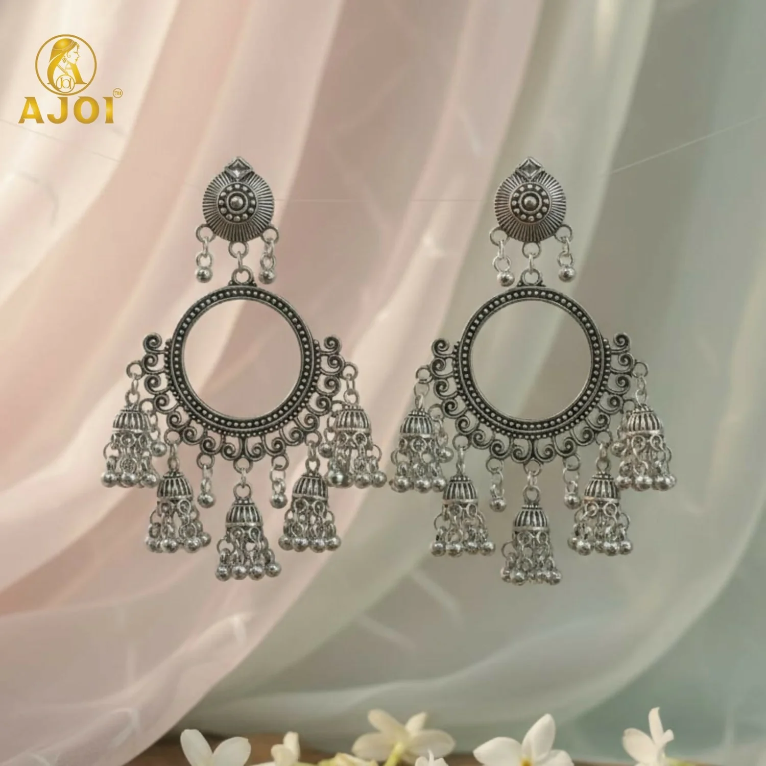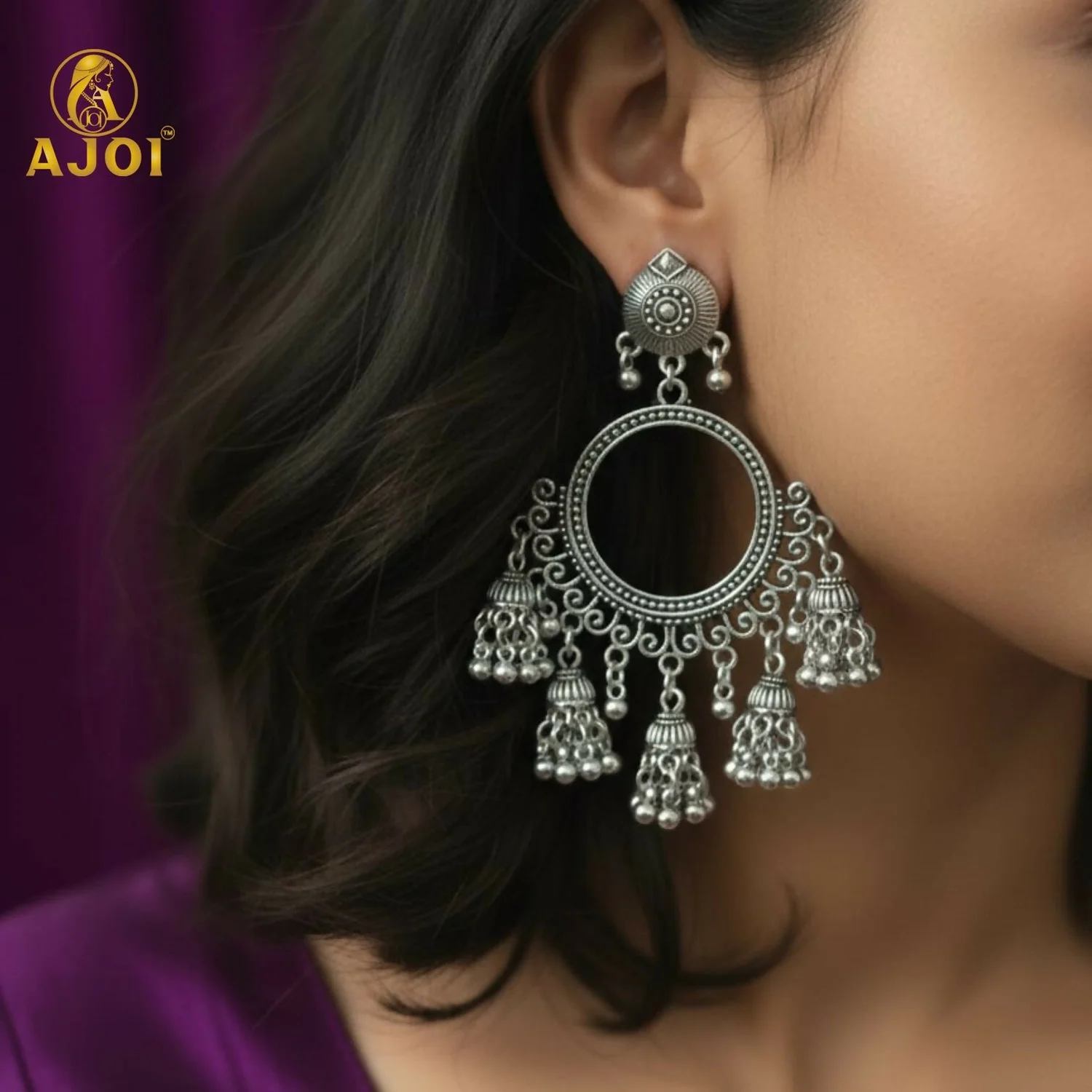 Add a graceful ethnic charm to your jewellery collection with these premium oxidised silver chandbali jhumka earrings. Beautifully crafted with intricate detailing, these earrings feature a circular open-ring chandbali design that gives a classic vintage and bohemian look.