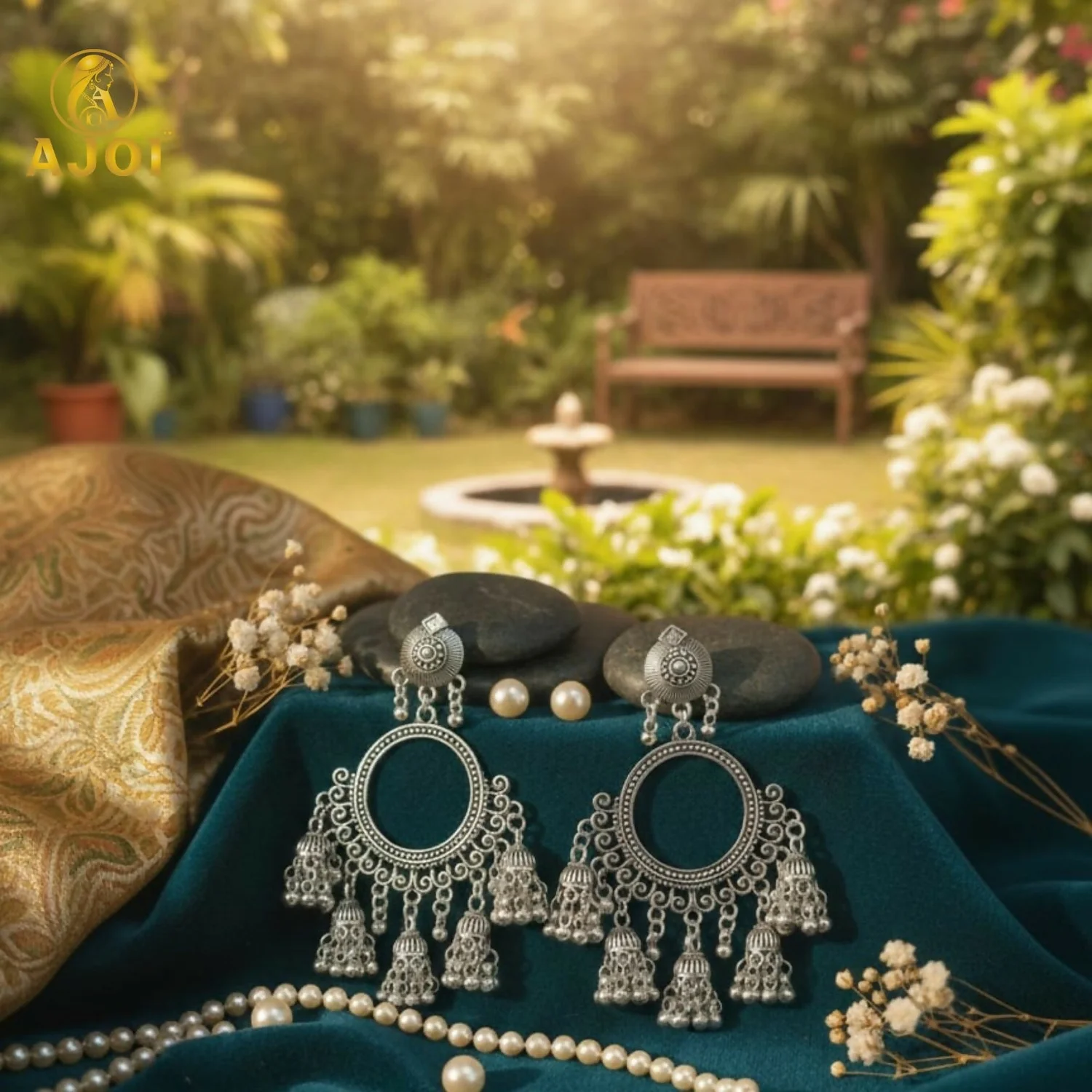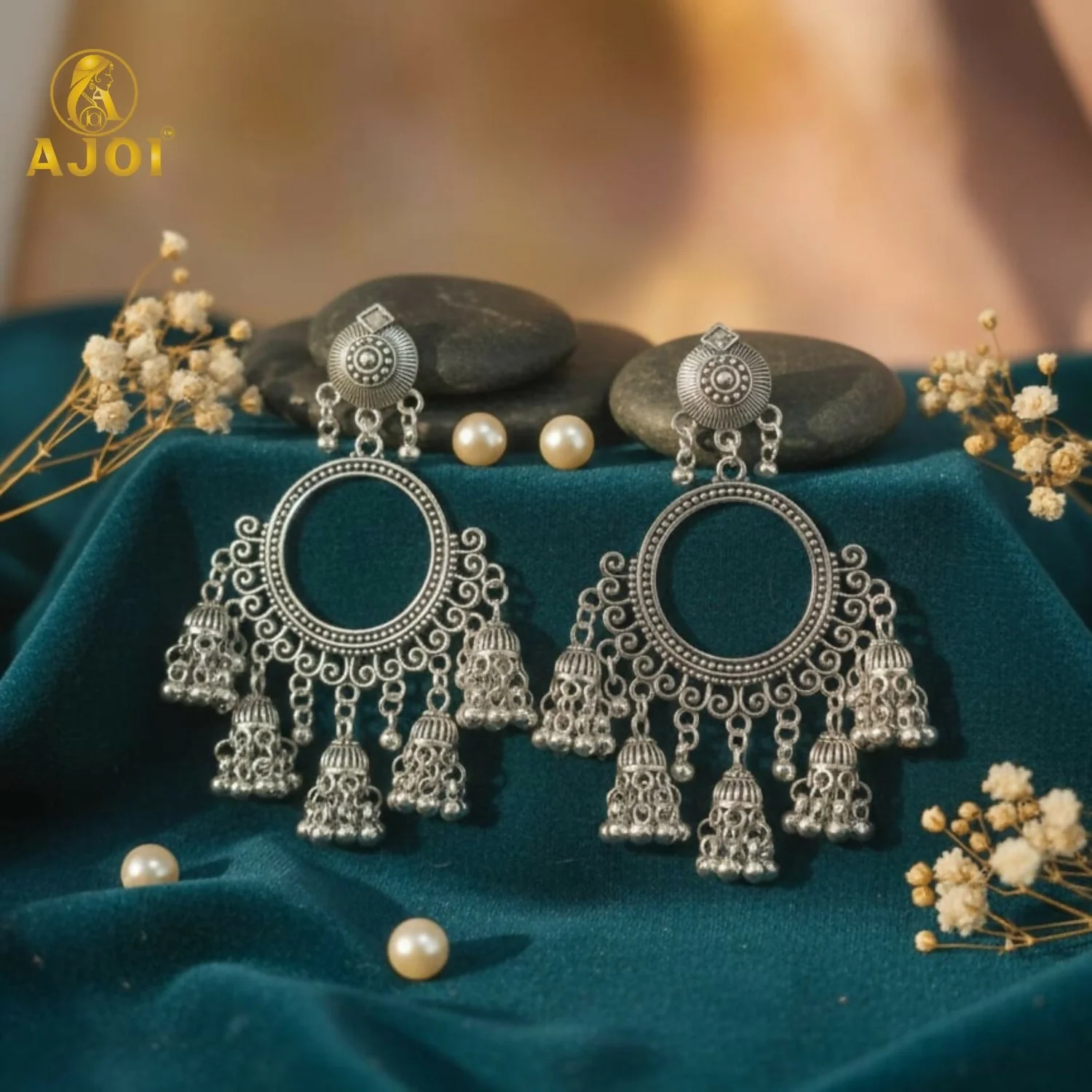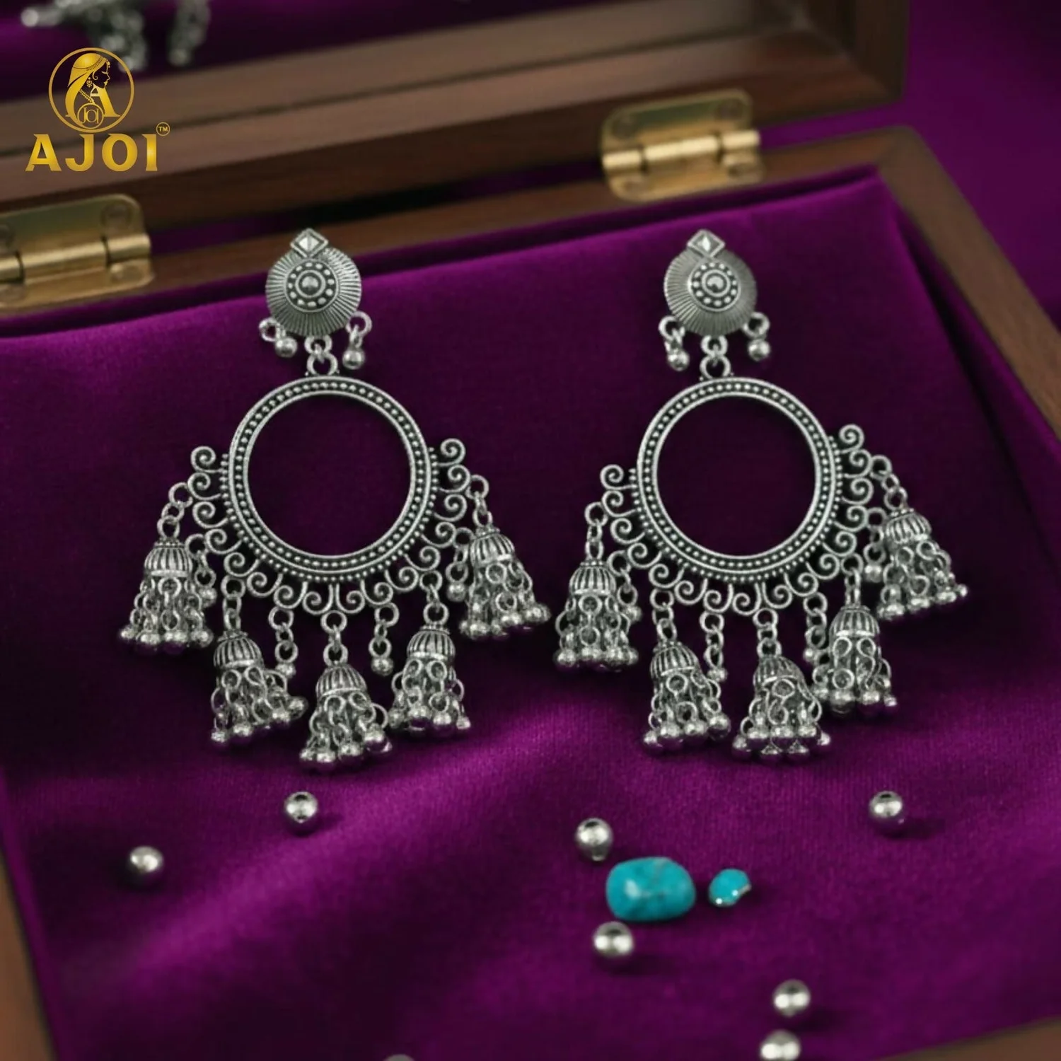 Add a graceful ethnic charm to your jewellery collection with these premium oxidised silver chandbali jhumka earrings. Beautifully crafted with intricate detailing, these earrings feature a circular open-ring chandbali design that gives a classic vintage and bohemian look.