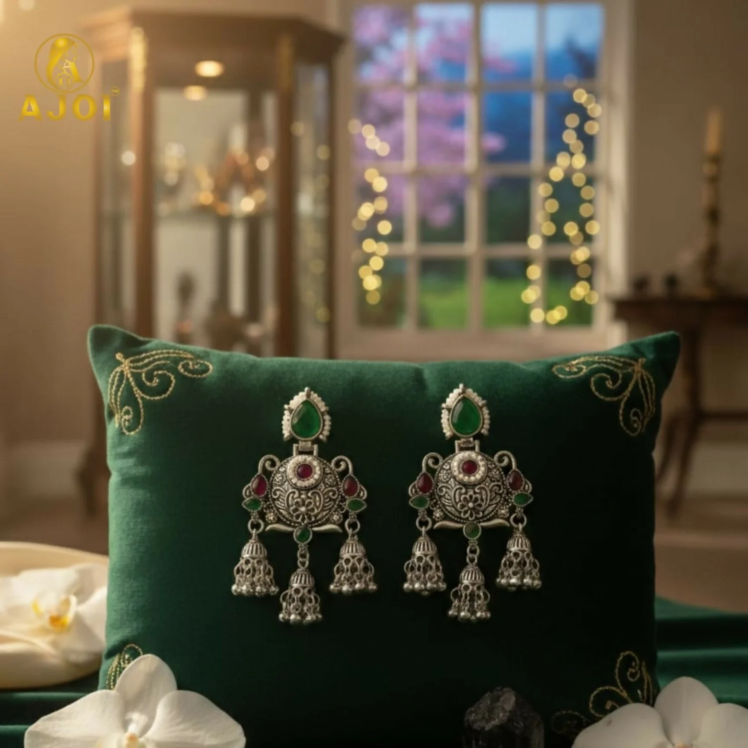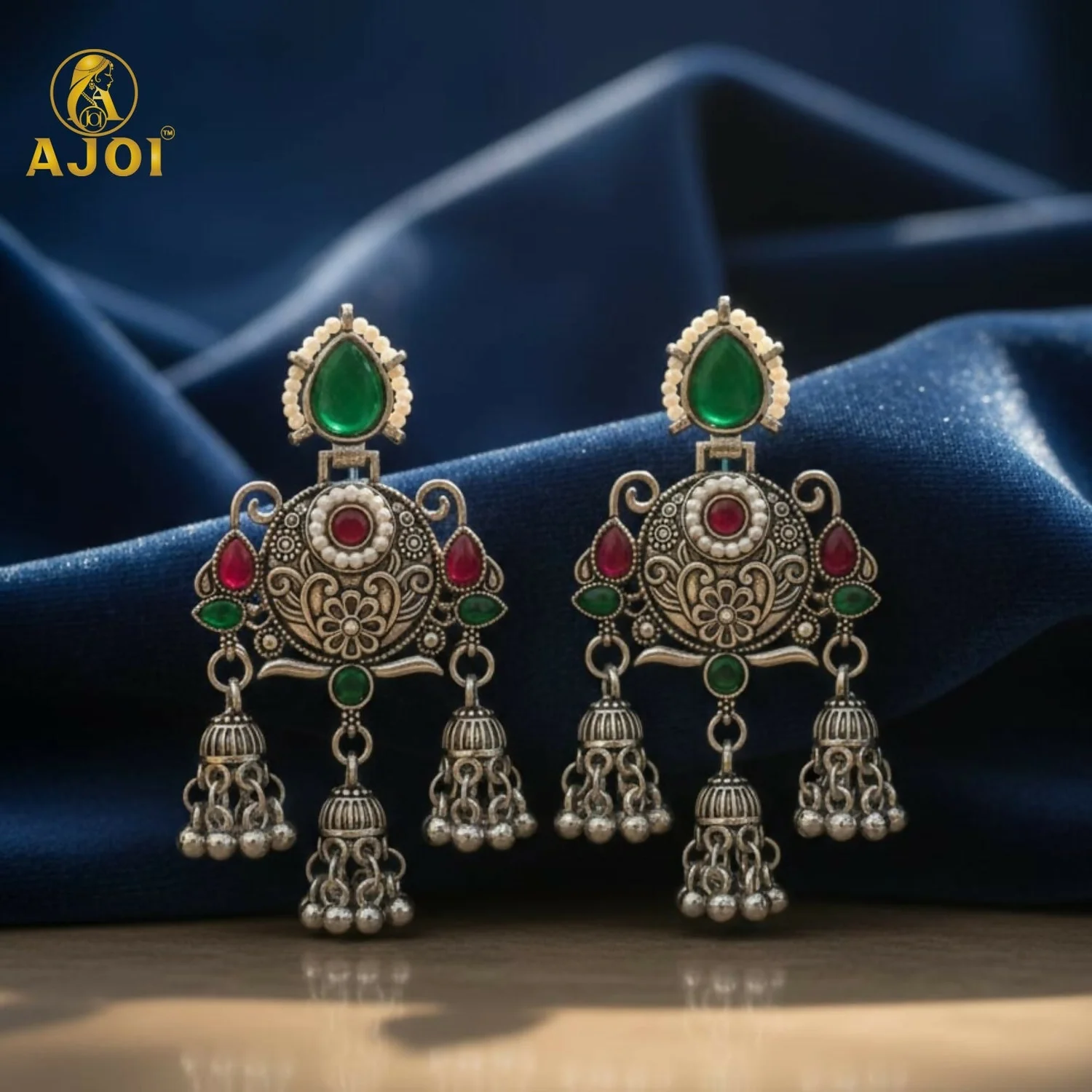 The oxidised finish gives a vintage royal look while remaining lightweight and comfortable for long wear. These earrings are perfect for weddings, festive celebrations, parties, cultural events, Navratri, Diwali, and family functions. They pair beautifully with sarees, lehengas, kurtis, and Indo-western outfits.