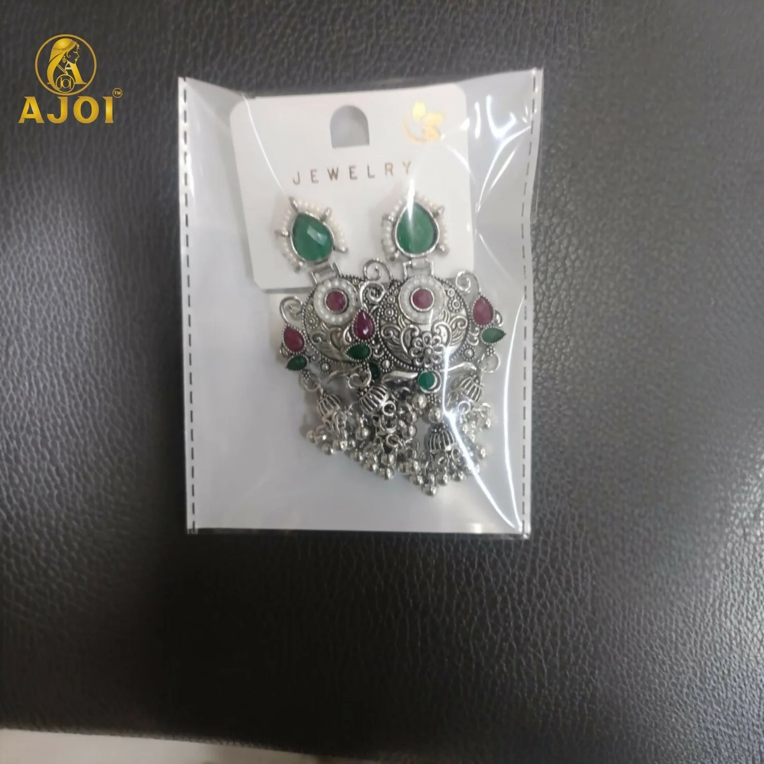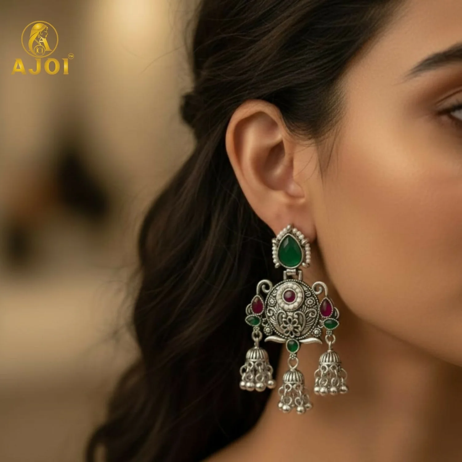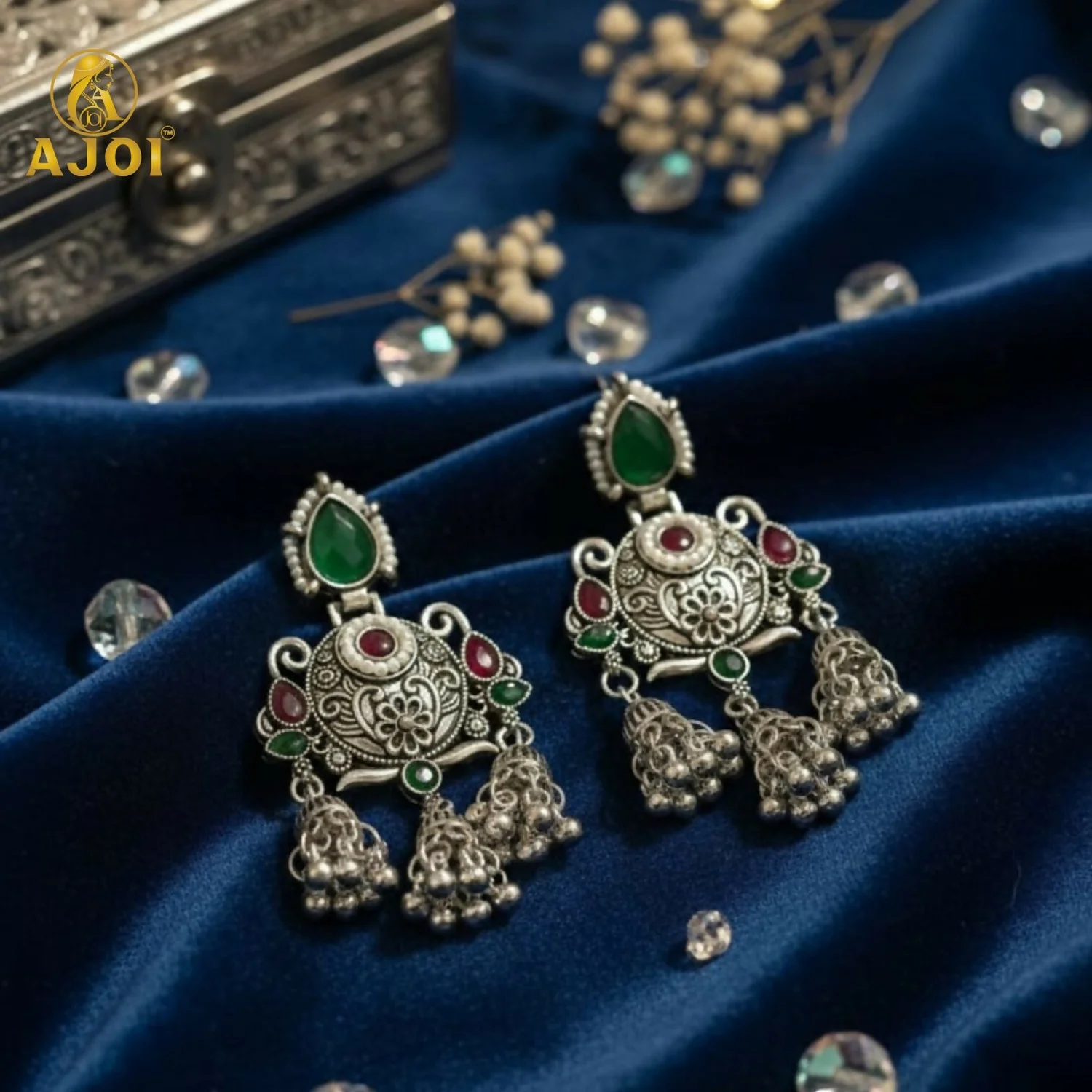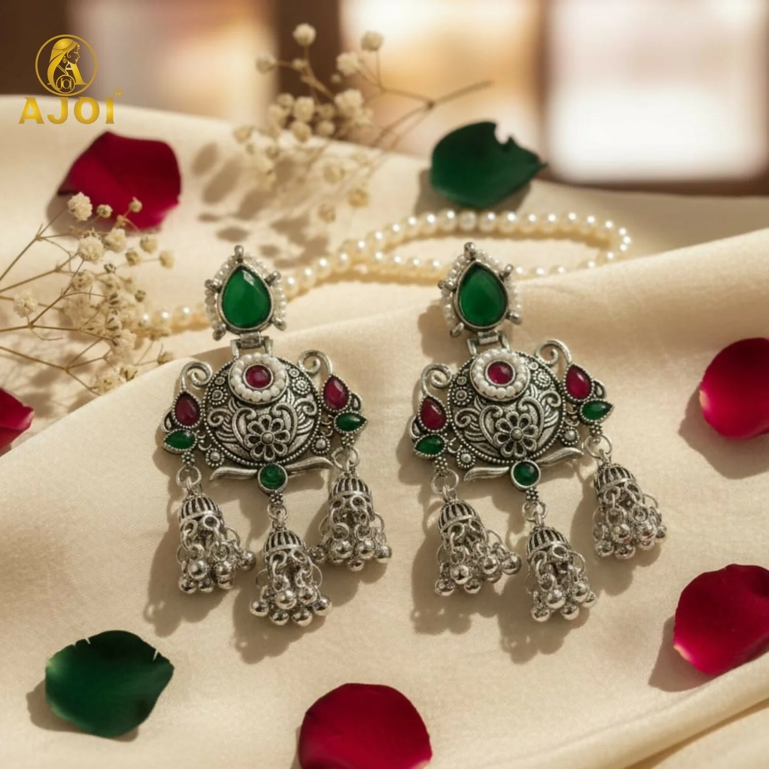 Be the first to review Premium Oxidised Silver Chandbali Jhumka Earrings with Green Stone!