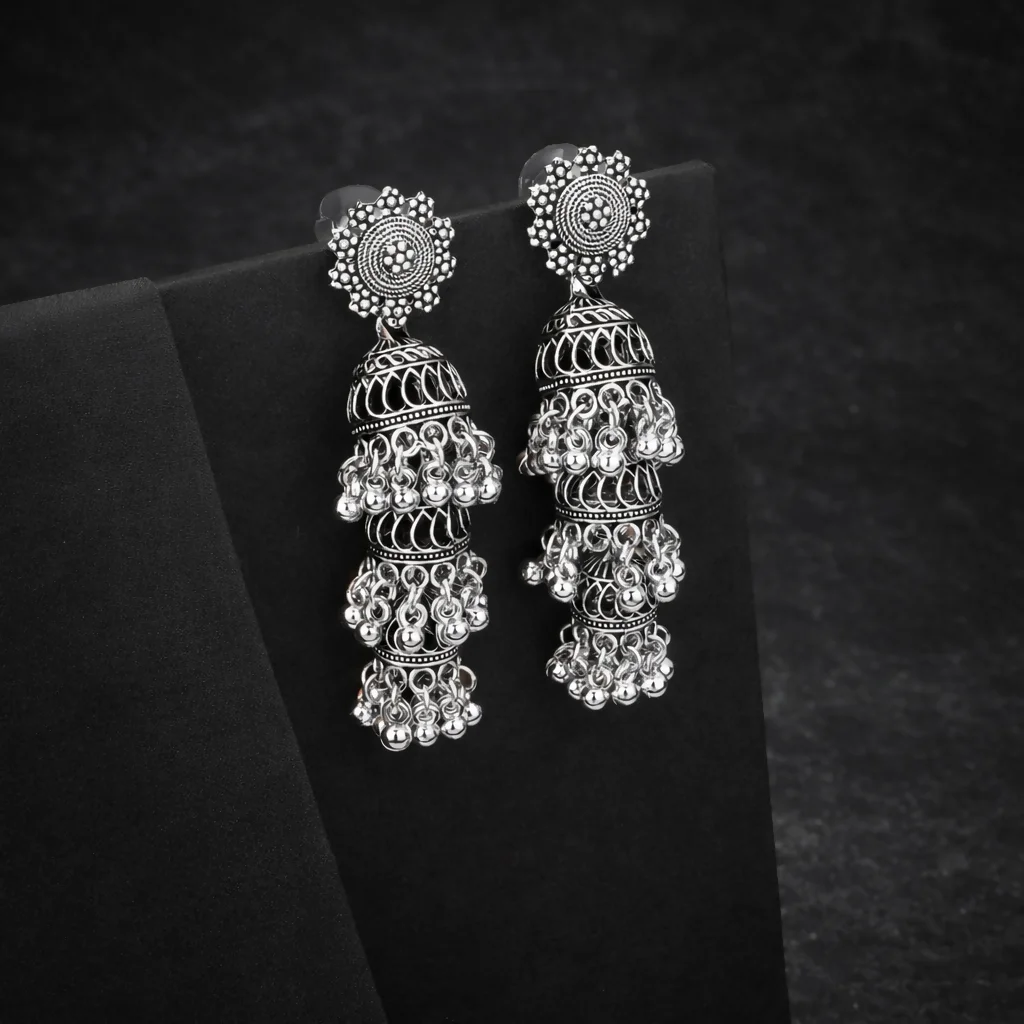 Be the first to review Premium Oxidised Silver Long Layered Jhumka Earrings!