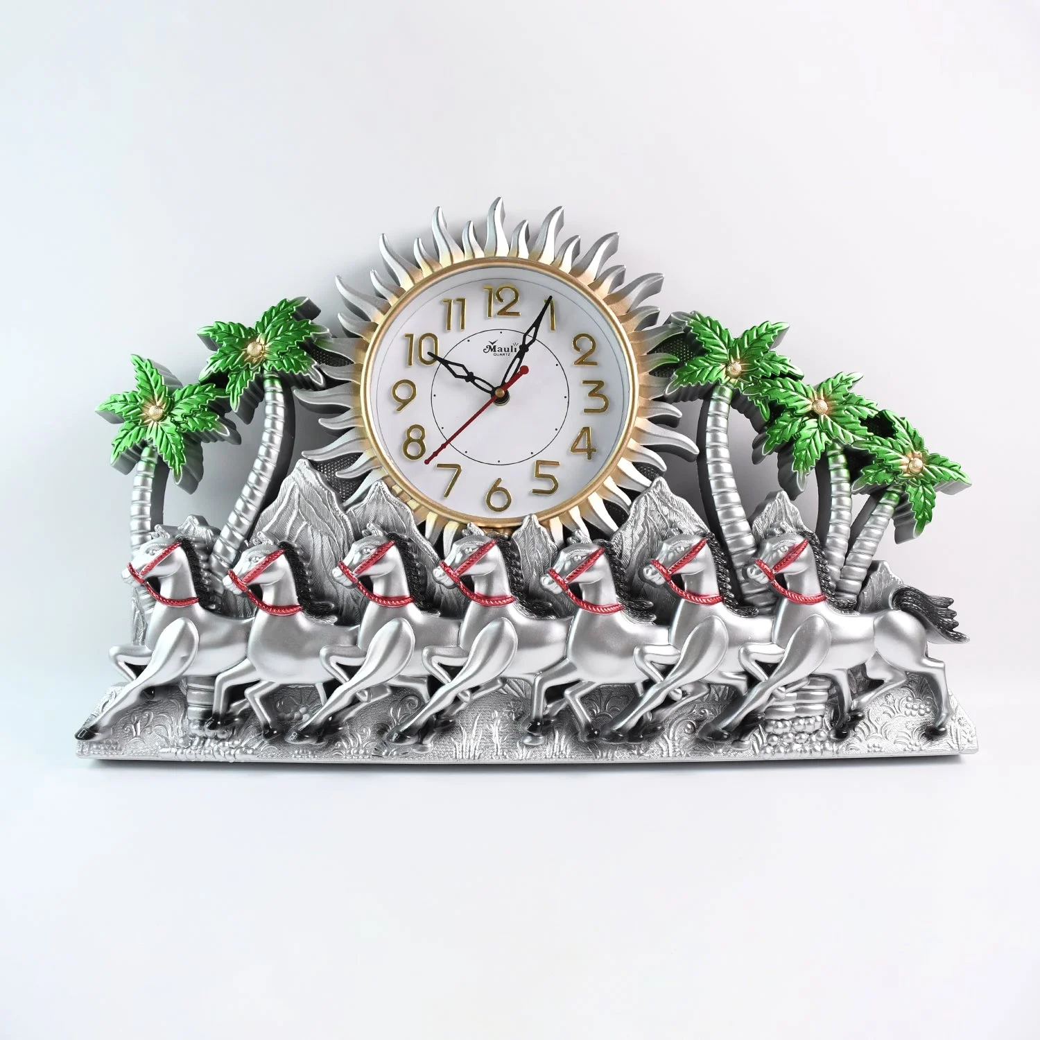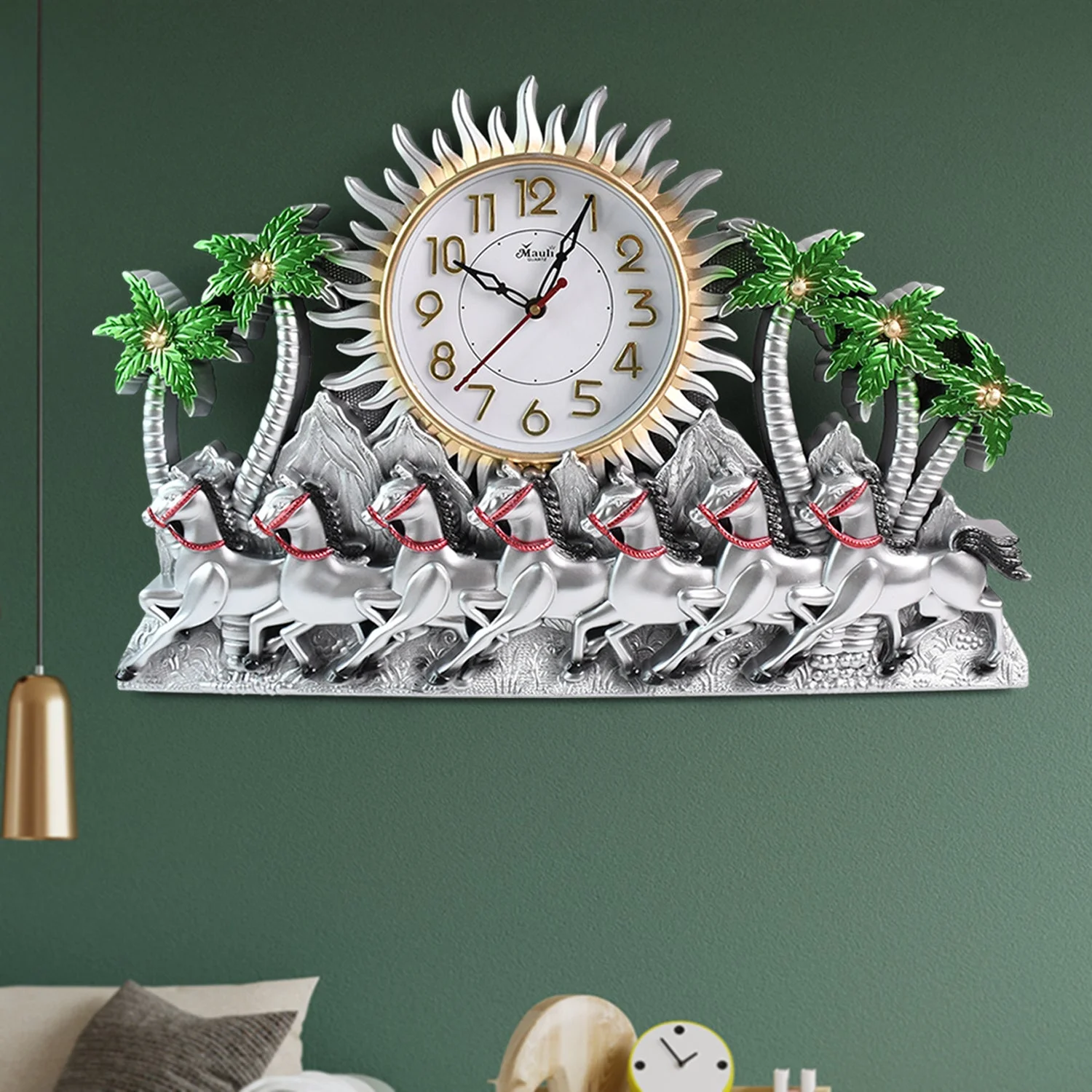 Elevate the aesthetic of any room with this beautifully designed wall clock featuring a majestic running horse motif, palm trees, and a radiant sunburst dial. Crafted with precision, the clock combines traditional elegance with modern durability. Made of high-quality plastic with detailed artwork, it serves both as a timepiece and a decorative wall accent. The clock operates on a standard battery and keeps accurate time with a silent sweep mechanism. Perfect for adding a dynamic visual appeal to living rooms, lounges, offices, or gifting on special occasions.