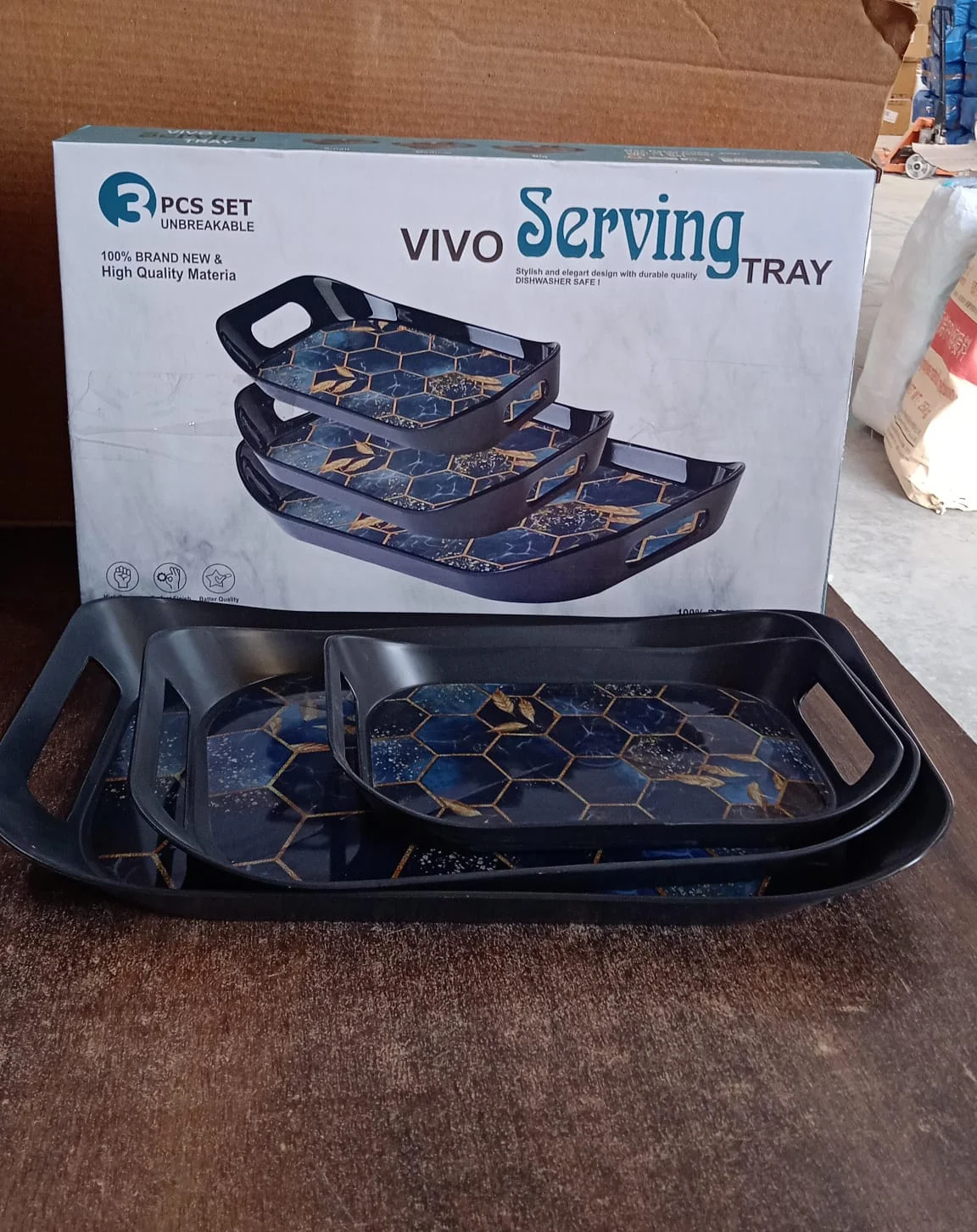 Serve your guests in style with this exquisite 3-piece serving tray set, featuring a sleek black base and a premium hexagonal printed design with golden accents. These trays are crafted from high-quality, durable plastic and come in three different sizes to meet a variety of serving needs—from tea and snacks to breakfast and desserts. The raised edges and integrated side handles ensure secure, spill-free carrying, while the lightweight construction makes them convenient for everyday use or special occasions.